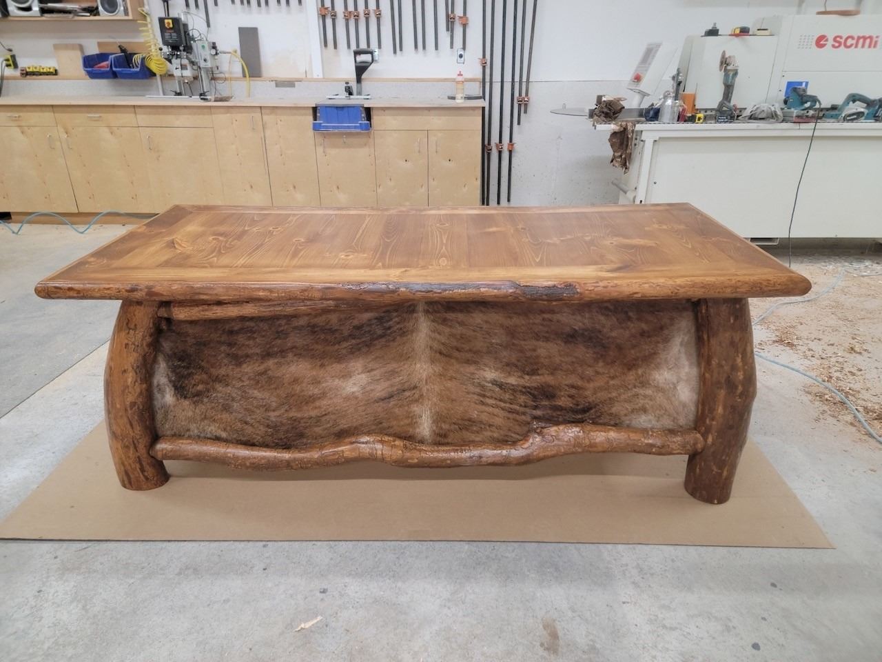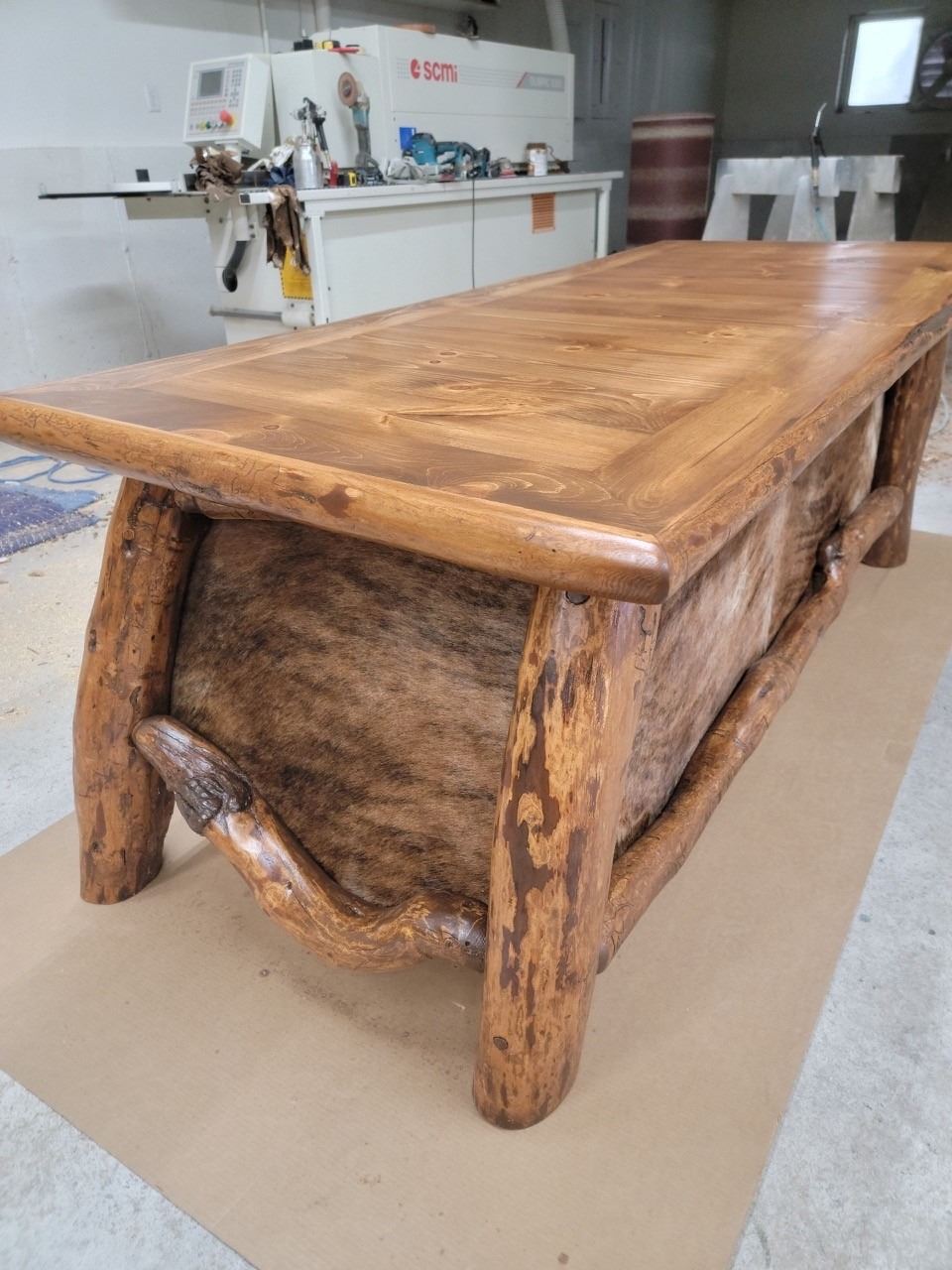 Chapter member Steve Reiling has donated this one-of-a-kind handmade desk crafter from twisted pine and cow hide.