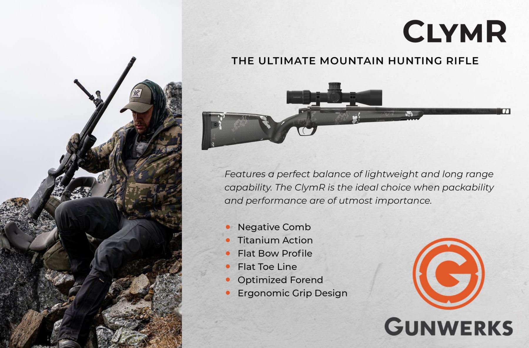 The ClymR was designed to be the "Ultimate Mountain Hunting Rifle". The design is perfected to balance lightweight and long-range shooting capability. The ClymR is the ideal choice when packability and performance are of utmost importance.