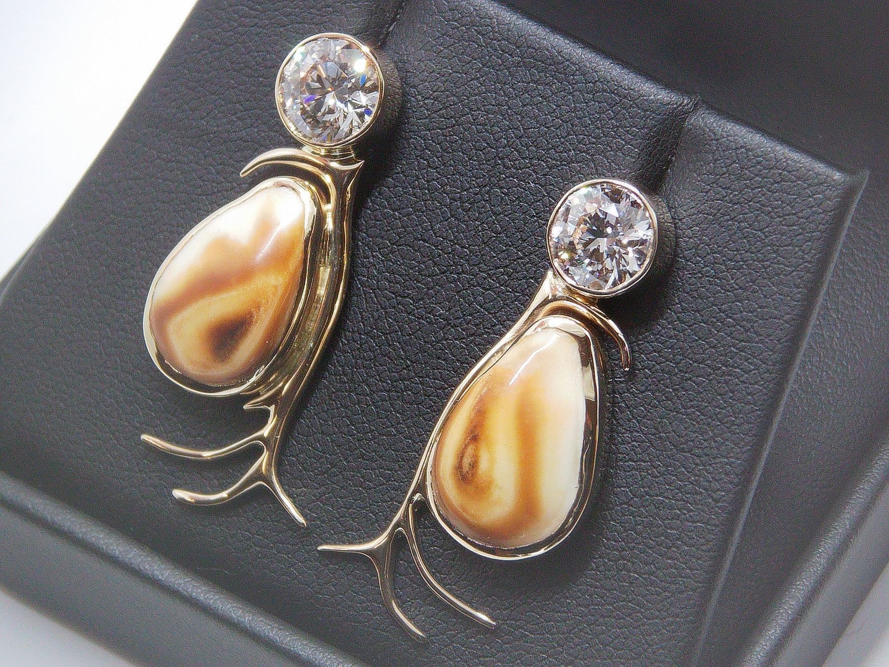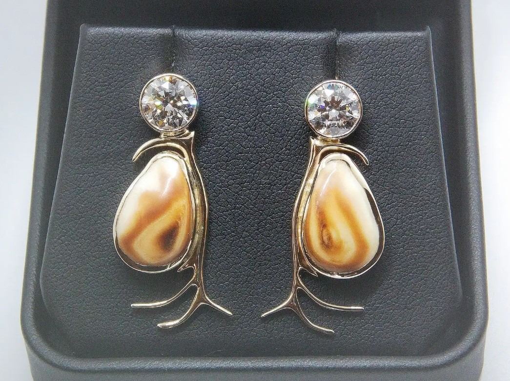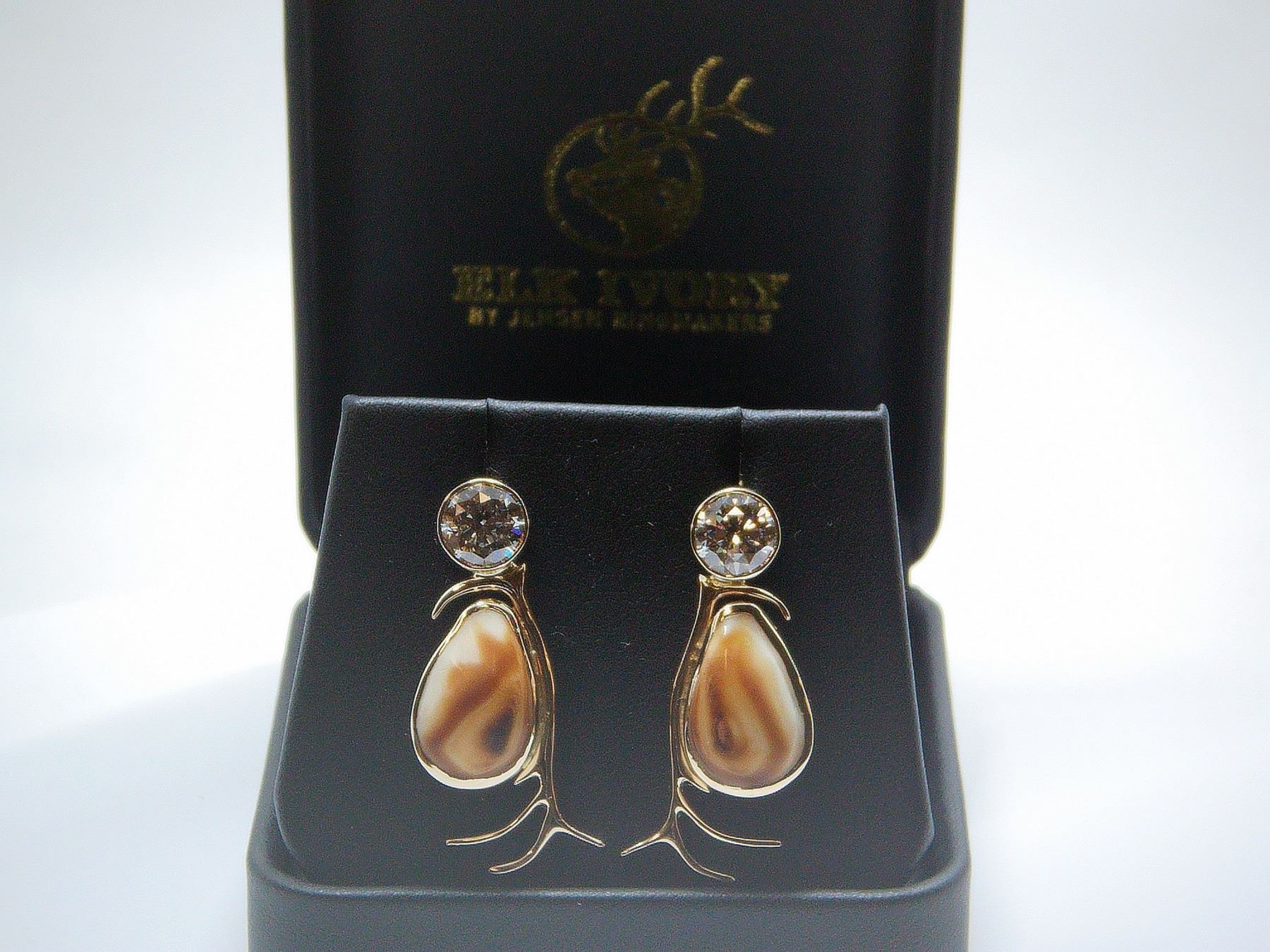 1 of 1 14k Yellow Gold 4ct Total Weight Lab Grown Diamonds Elk Ivory Earrings Custom Made by Jensen RingMakers.