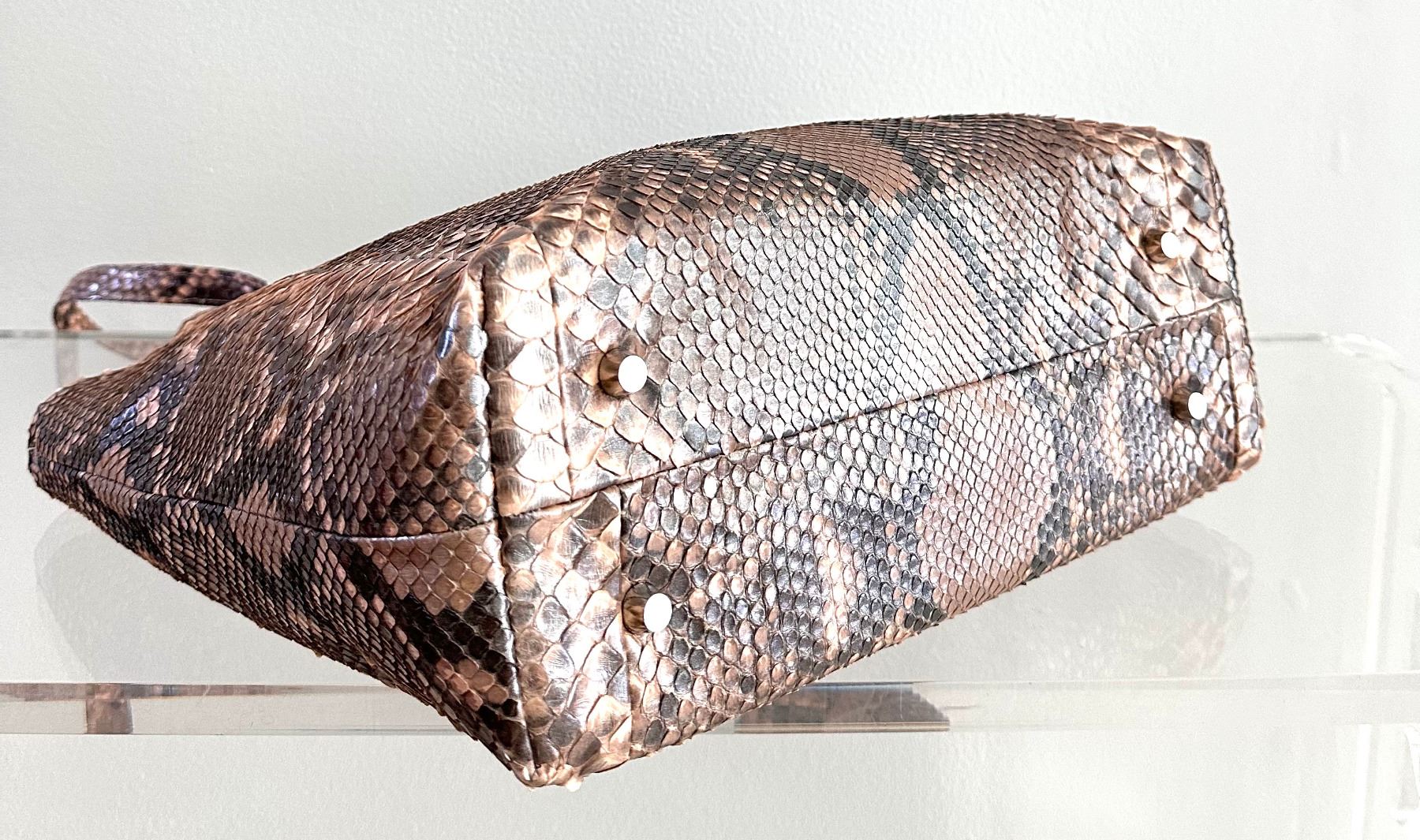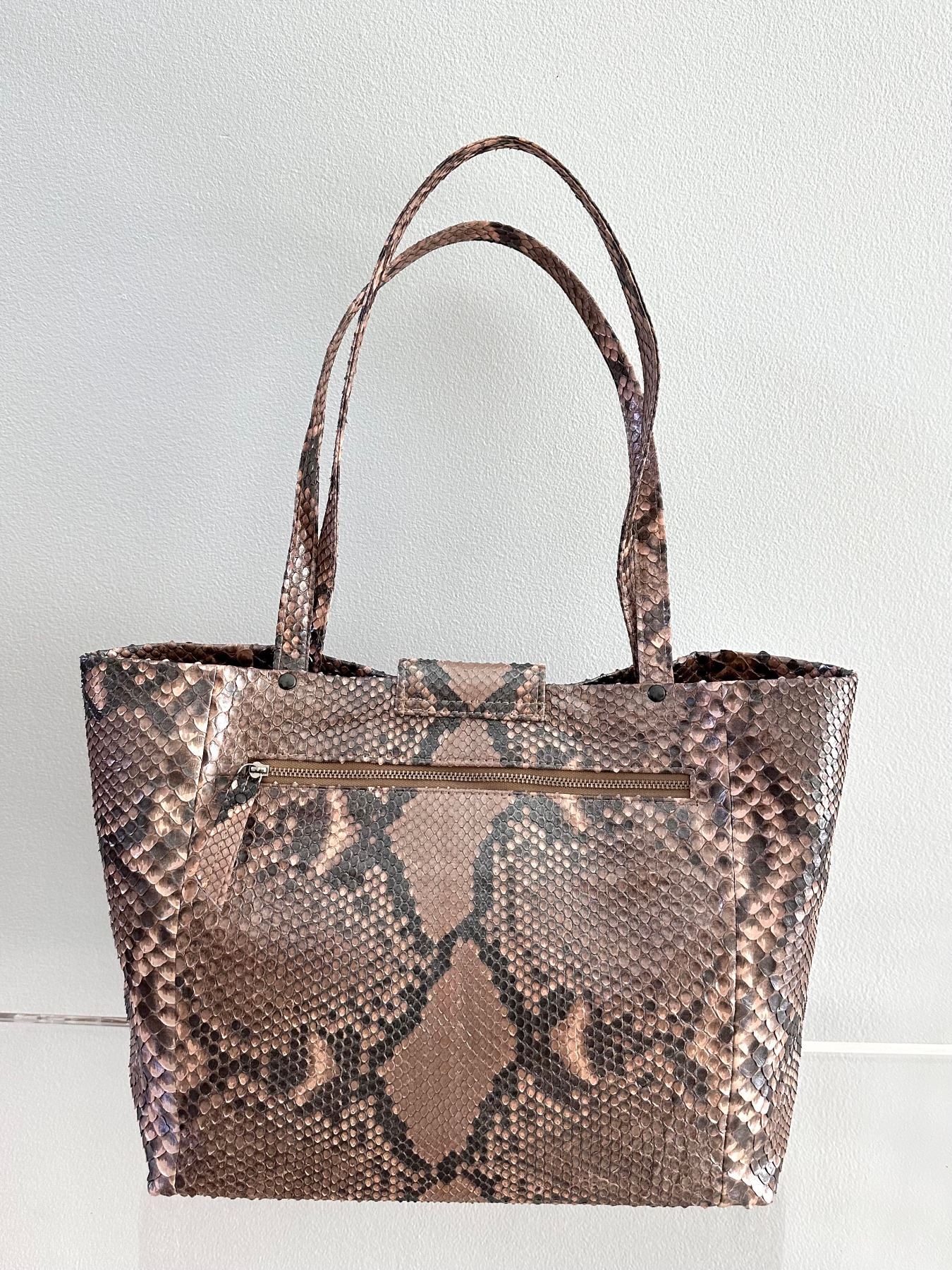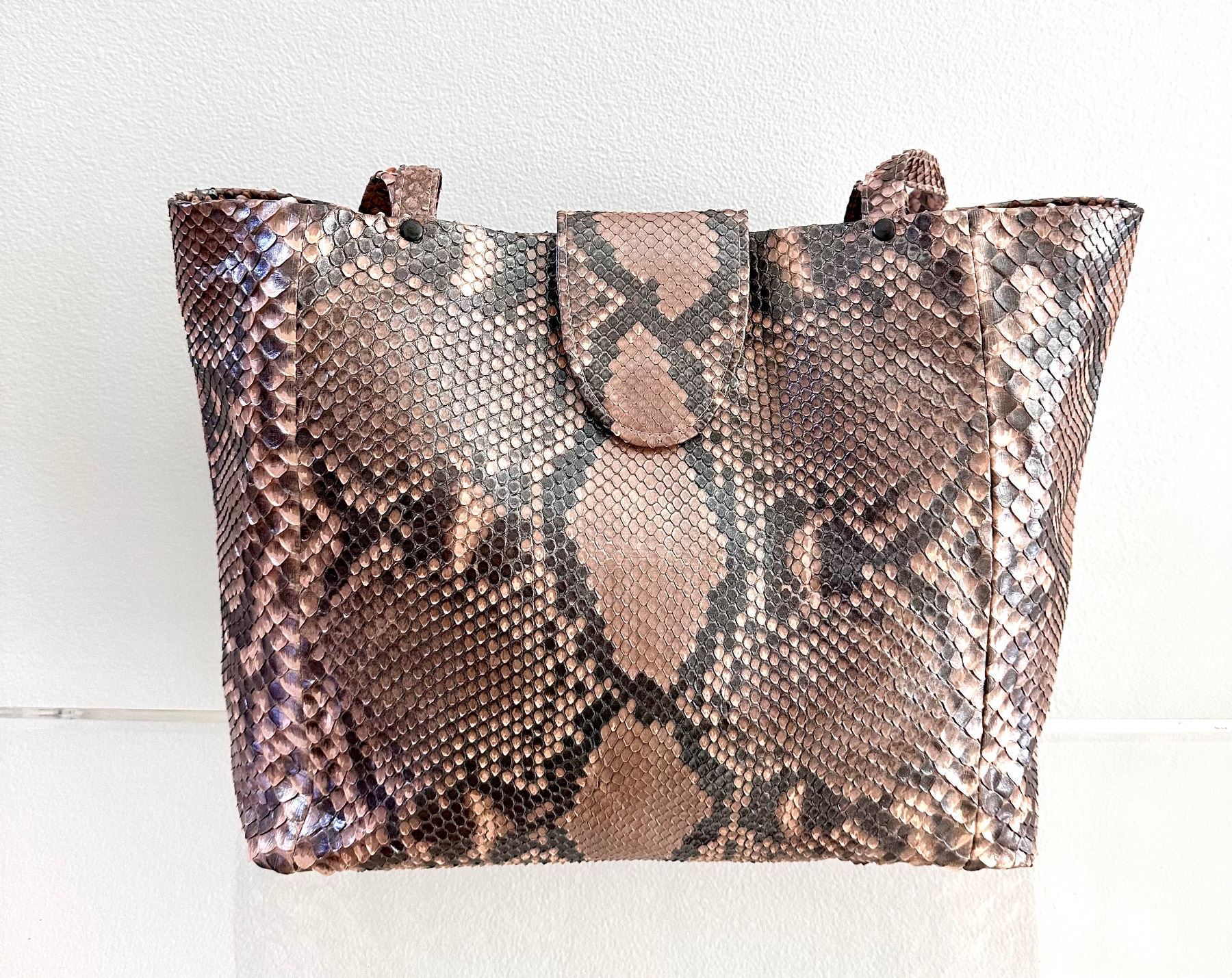 Convertible tote bag, made from genuine python skin with a glazed finish. The skin was tanned in Italy. The colors are neutral: grey, blush, and taupe. The markings of the python show through. Back zipper pocket. Fully lined with several interior compartments. Bottom feet for protection. Lightweight, yet extremely durable and perfect to be handed down for generations.