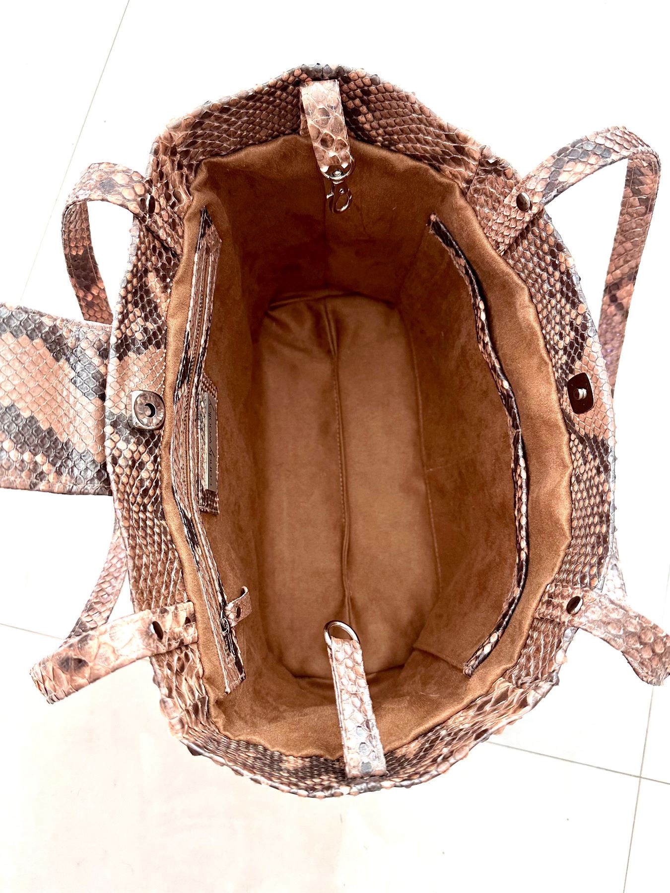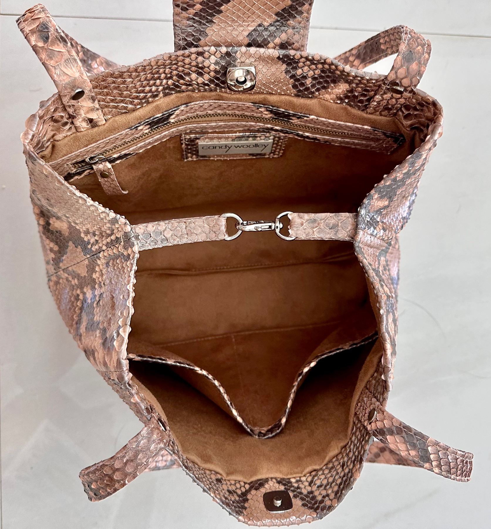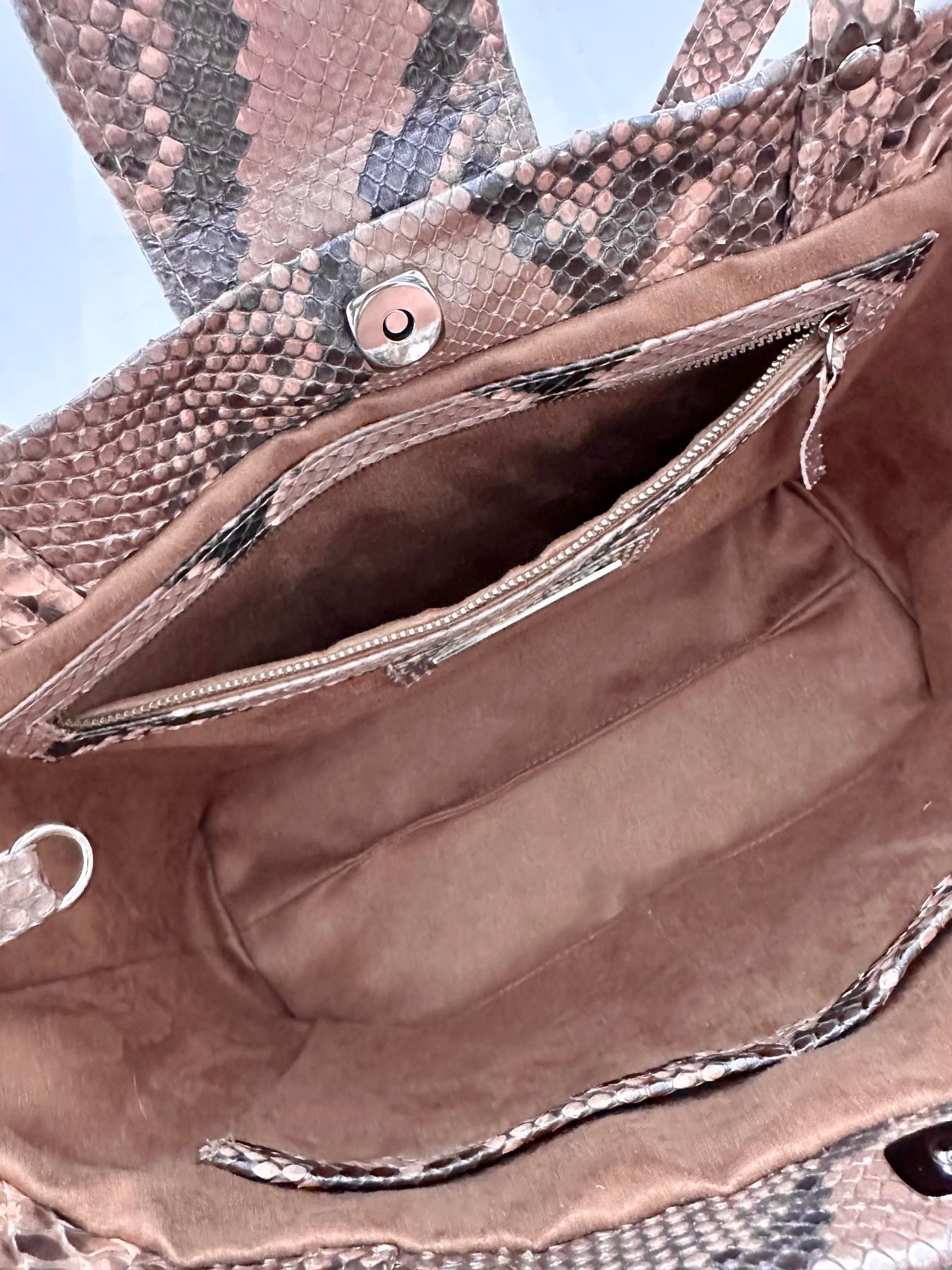 Convertible tote bag, made from genuine python skin with a glazed finish. The skin was tanned in Italy. The colors are neutral: grey, blush, and taupe. The markings of the python show through. Back zipper pocket. Fully lined with several interior compartments. Bottom feet for protection. Lightweight, yet extremely durable and perfect to be handed down for generations.