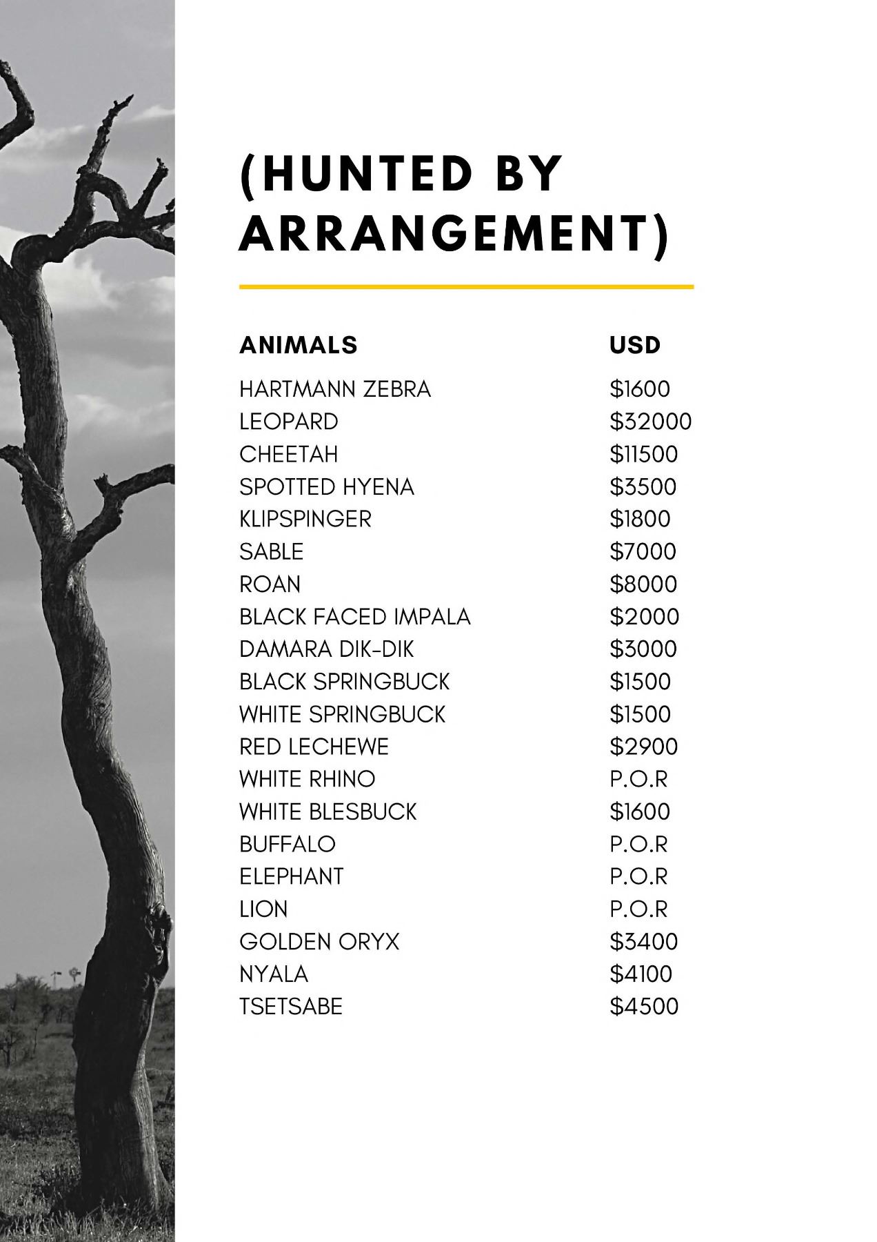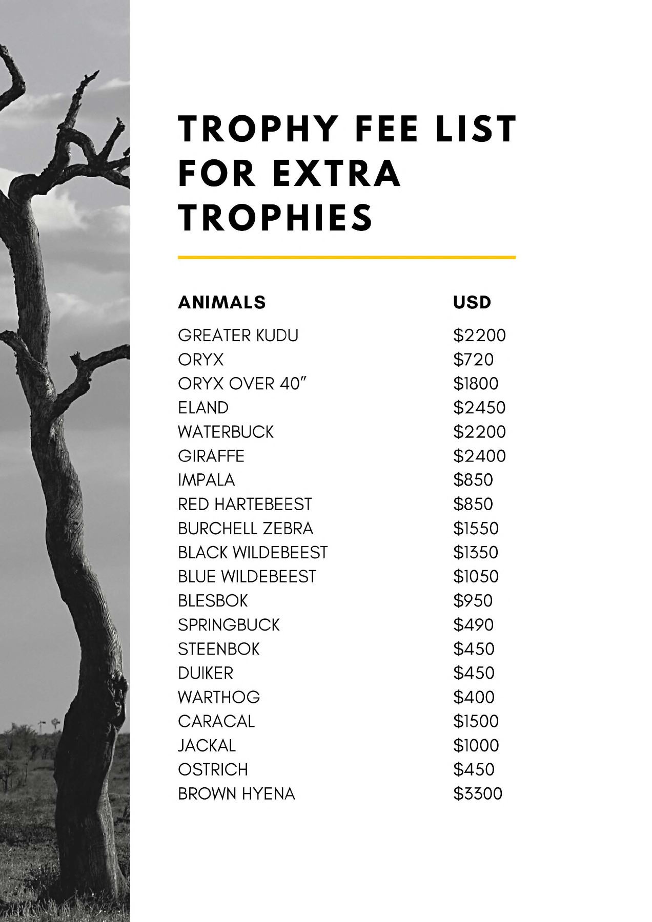 Cost per animal hunted and fees for animals wounded and lost.