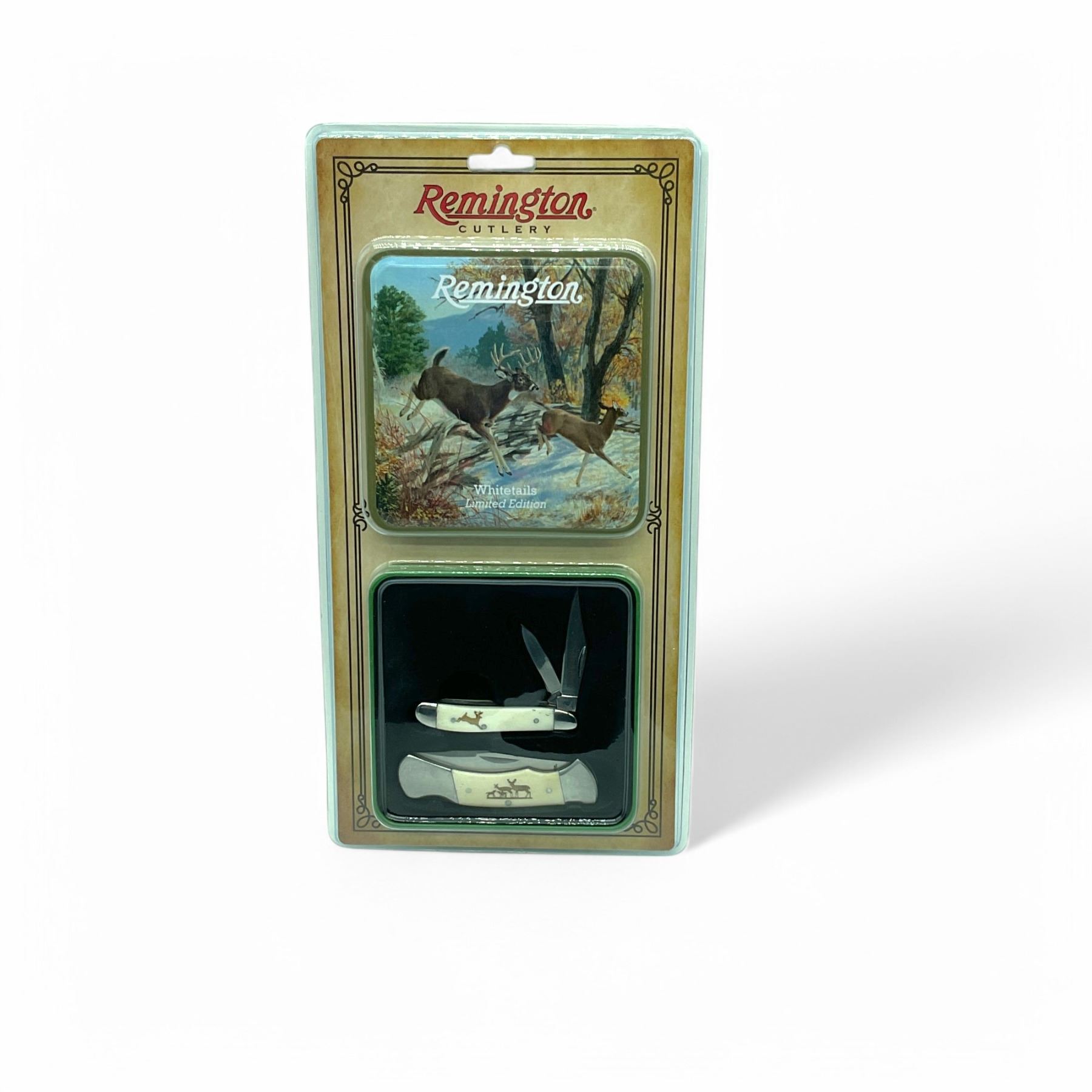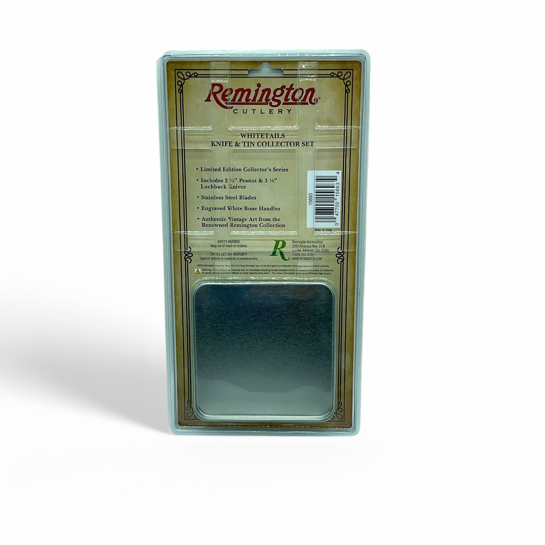 Lot 953 Remington Cutlery Whitetails Knife and Tin Collector Set, 2.75" Peanut and 3.5" Lockback Knives