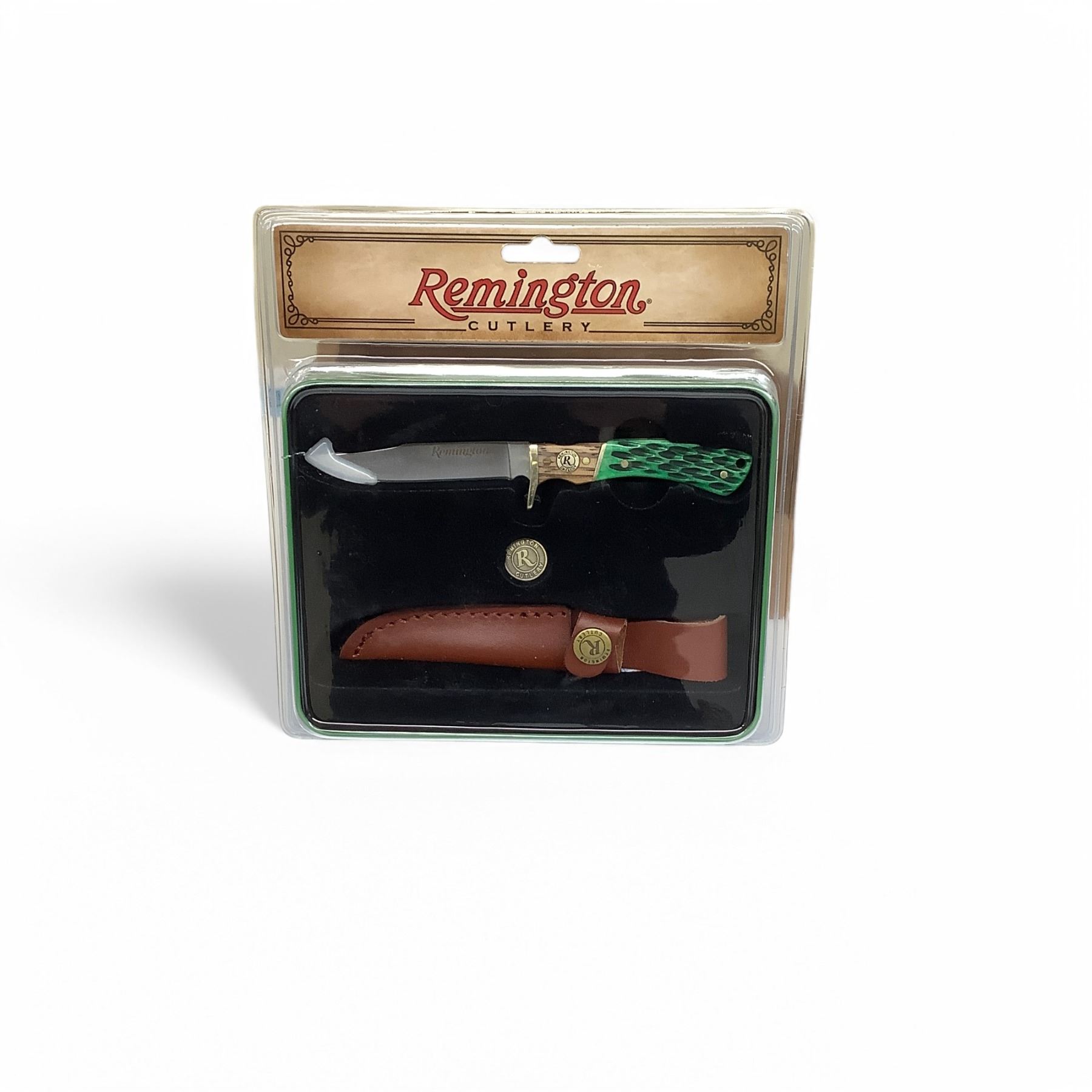 Remington Cutlery 'Whitetails Cutover' Knife and Tin Collection, 6.5" Jr Fixed Blade Knife with Leather Sheath
