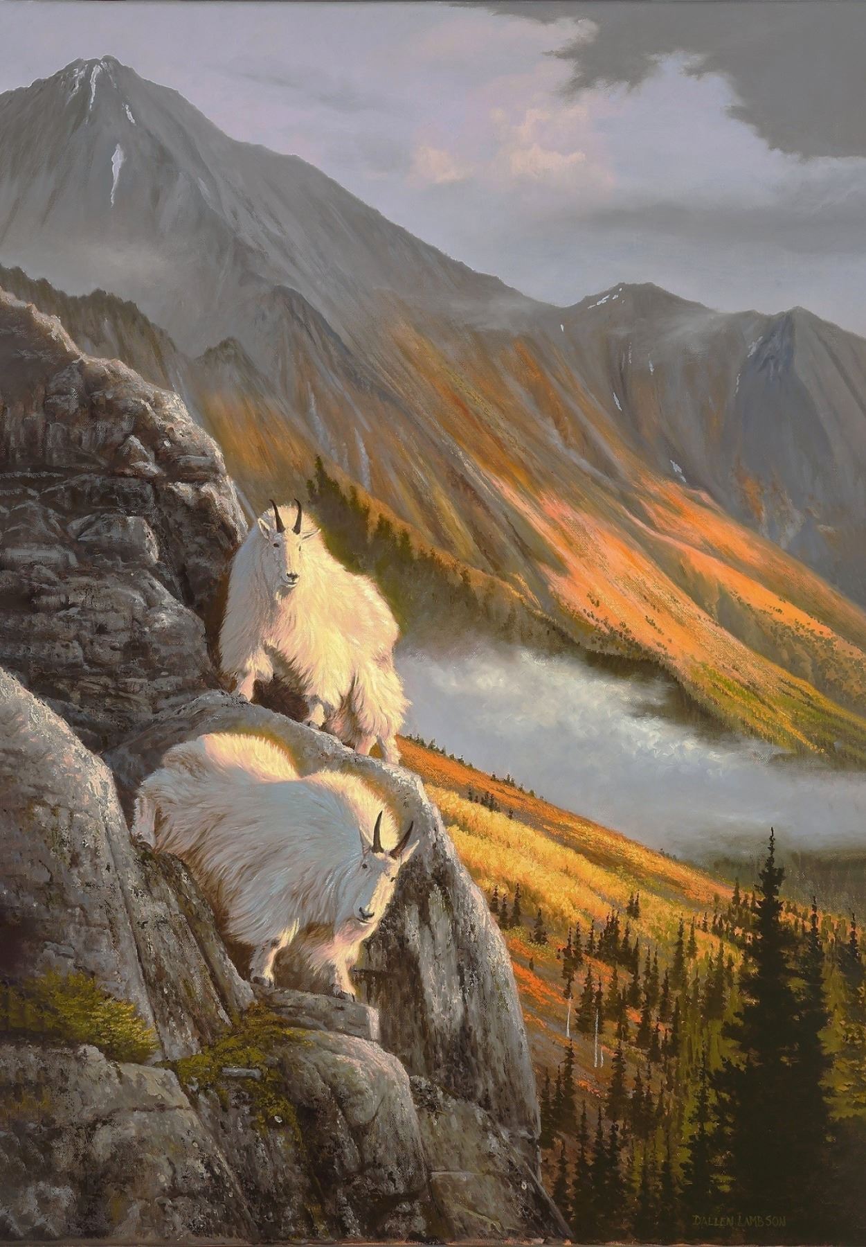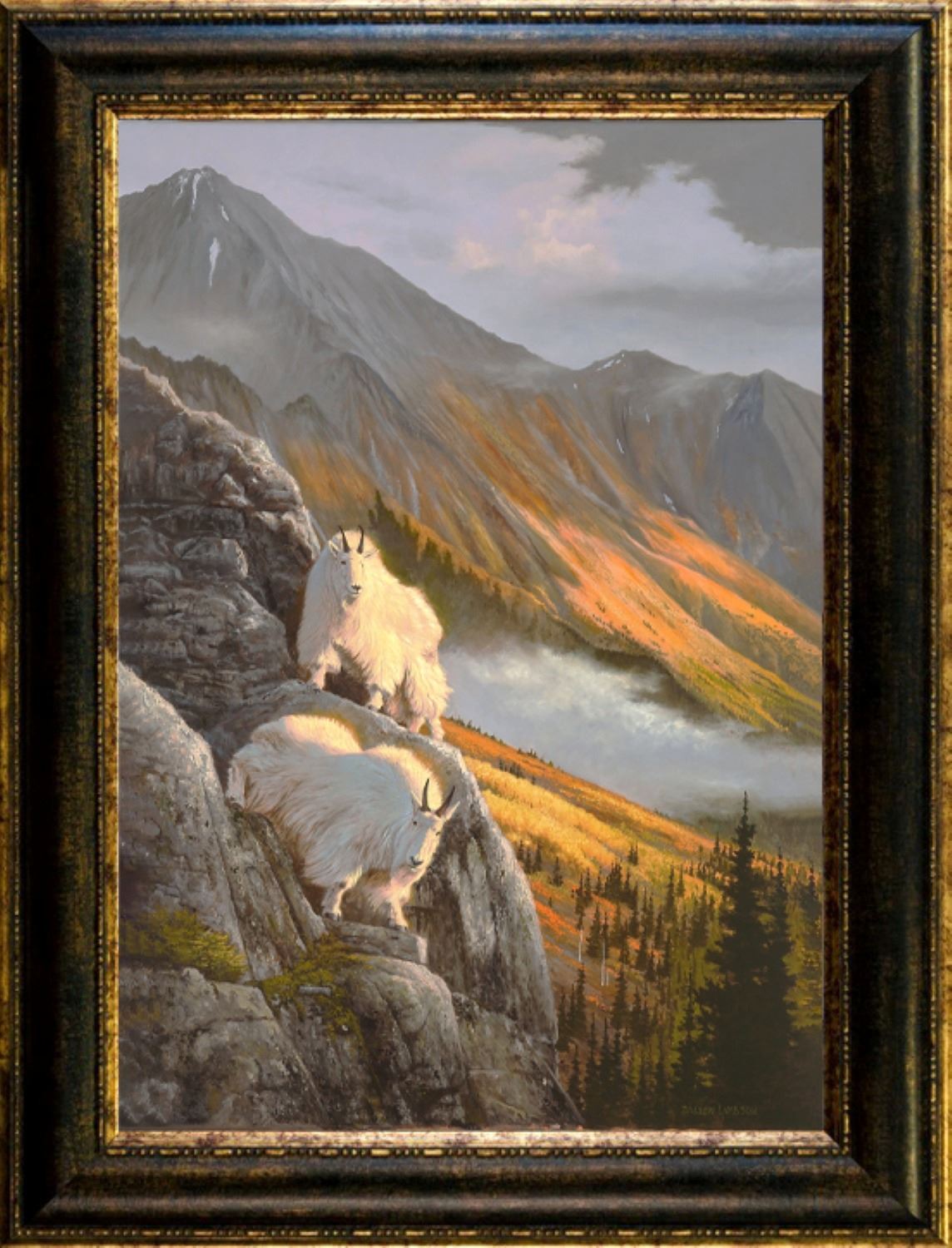 Artist Dallen Lambson's original oil painting, "The Overseers" is an original oil painting on 24"x36" stretched cotton canvas. Elegantly framed and ready to hang, this creation depicts quintessential Alaska in all its rugged splendor. The majestic cliff dwellers depicted here have a front row seat to some of the most beautiful vistas this planet has to offer.
