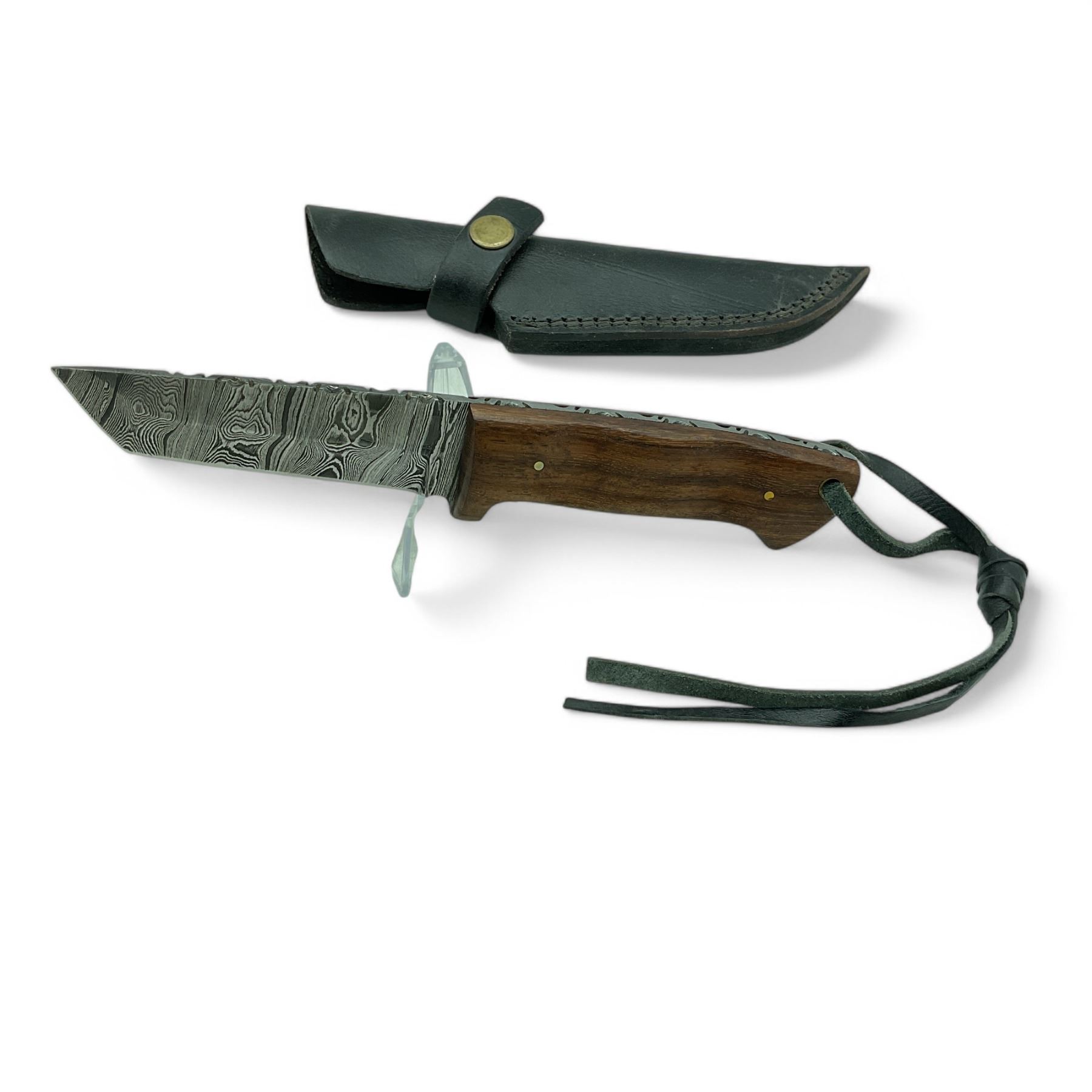 3.75" Fixed Damascus Blade Knife with Wooden Handle and Leather Sheath