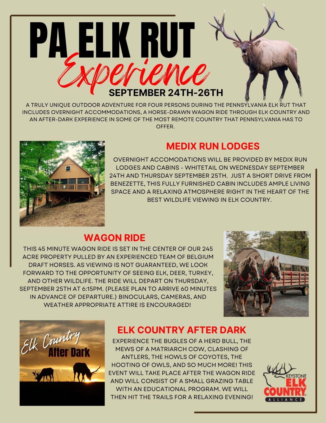 A truly unique outdoor adventure for four persons during the Pennsylvania Elk rut that includes overnight accommodations, a horse-drawn wagon ride through Elk Country and an after-dark experience in some of the most remote country that Pennsylvania has to offer. SEE ATTACHED FLYER for DESCRIPTION