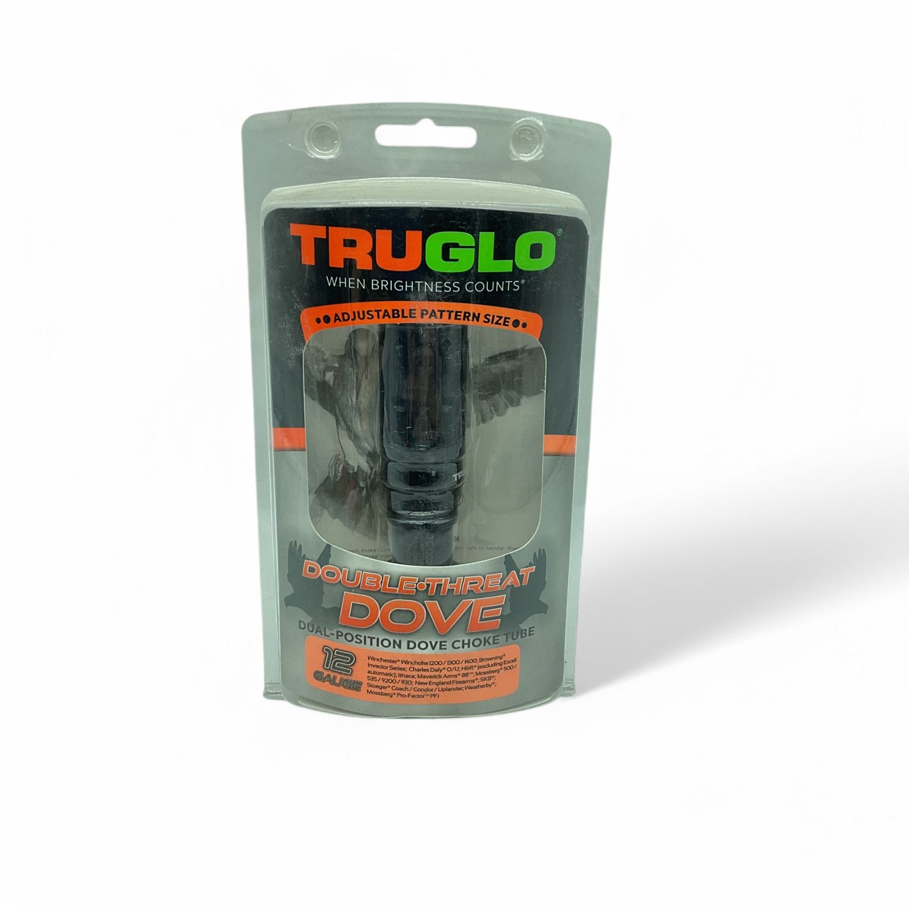TruGlo Double Threat Dove Dual-Position 12 Ga Dove Choke Tube for Winchester WinChoke 1200/ 1300/ 1400, Browning Invector Series, Charles Daly O/U, H&R (Excludes Excell Automatic), Ithaca, Maverick Arms 88, Mossberg 500/ 535/ 9200/ 930, New England Firearms, SKB, Stoeger Coach/ Condor/ Uplander, Weatherby, Mossberg Pro-Factor PFI, New