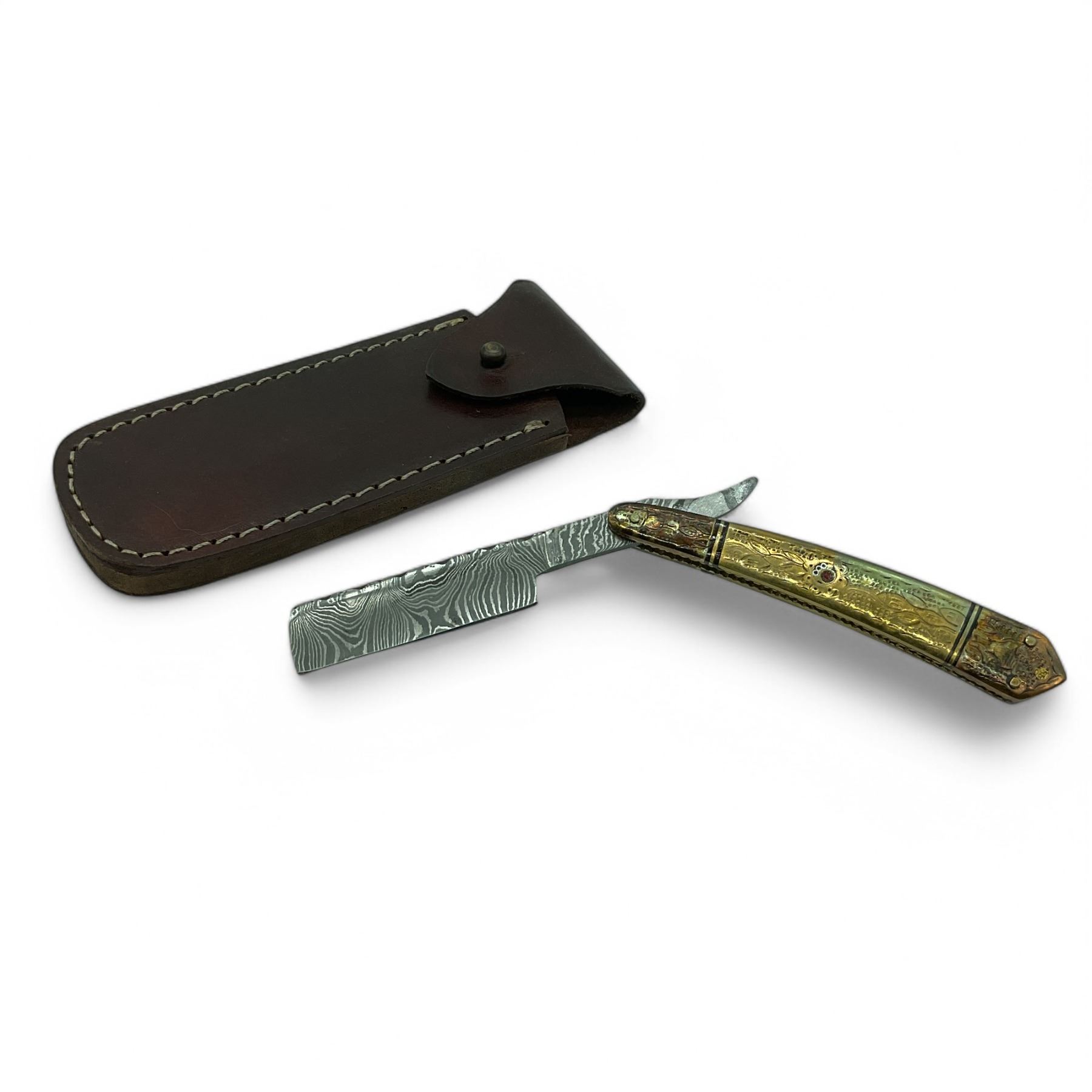 Lot 96 Hand Forged Damascus 3.75" Blade Folding Razor with Leather Sheath, New