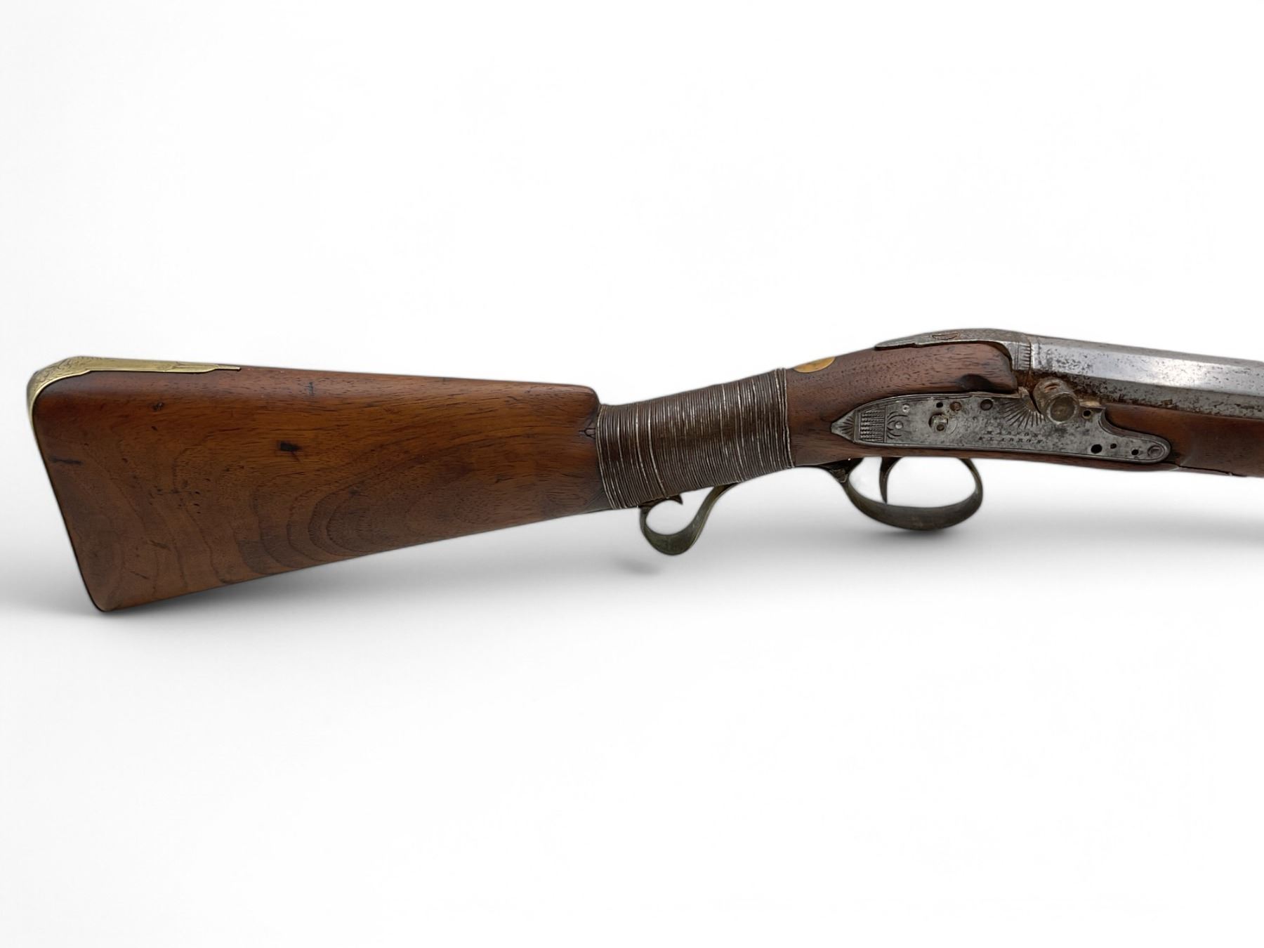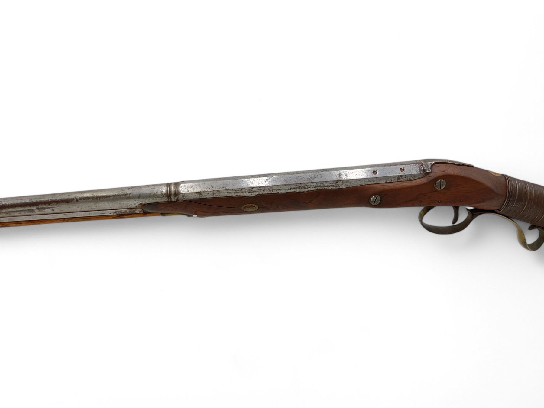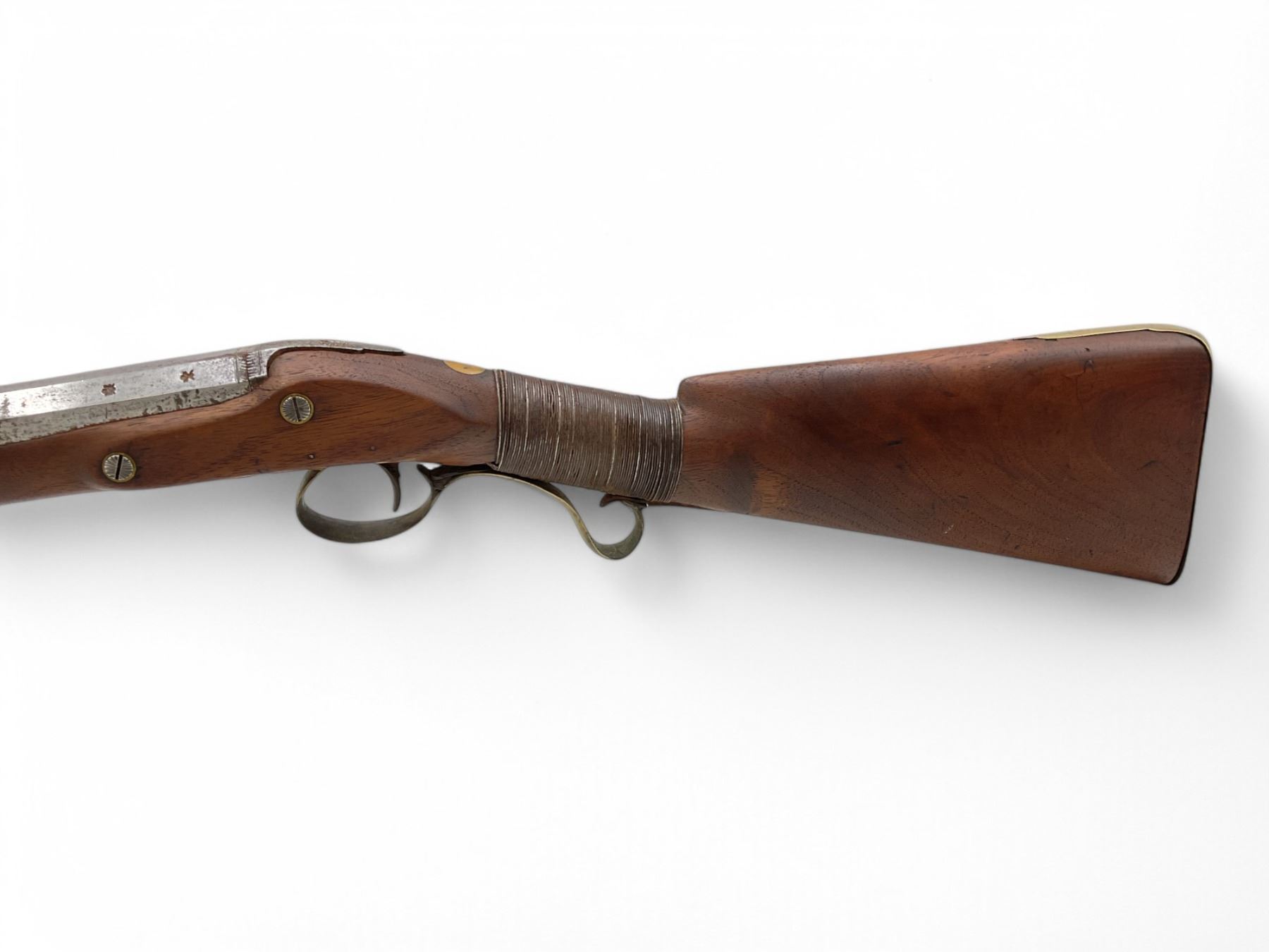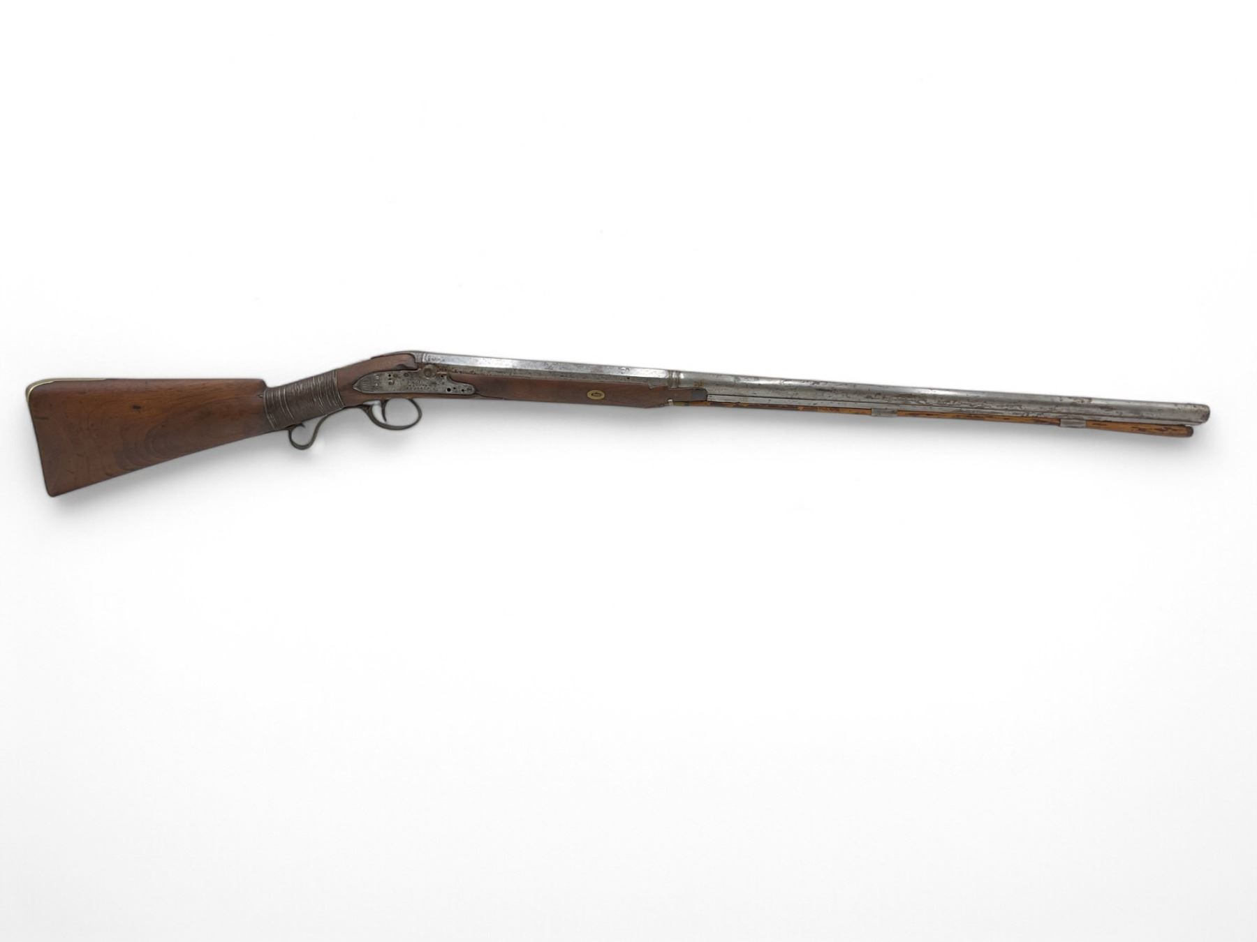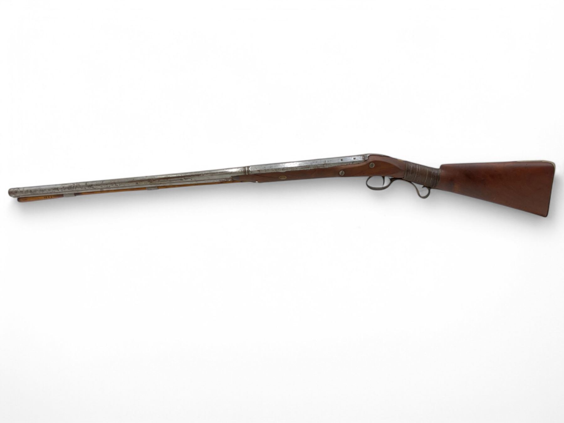 Mabson & Labron Musket 33" Barrel Wood Stock, Antique. Wood stock broken and repaired. Trigger seized; hammer not present. Screws and pins missing; may be missing other pieces. Includes ram rod. You must be over 18 years of age to purchase this item; no license required as this is an antique.