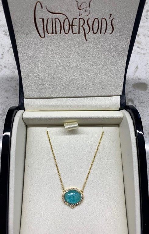 Gunderson's Jewelers has graciously donated again this year this beautiful Apatite & Clear Quartz Fused Pendant. This exquisite 18K yellow gold pendant showcases a 4.15 carat fusion of clear quartz over Apatite, framed by .25 carats of brilliant cut diamonds creating a mesmerizing depth of color. The vivid blue green hues of Apatite shimmer beneath the quartz capturing light with every movement. This piece radiates elegance, perfectly complemented by the warmth of yellow gold. A stunning statement of natural beauty and expert craftsmanship, this pendant is the perfect blend of sophistication and timeless allure.