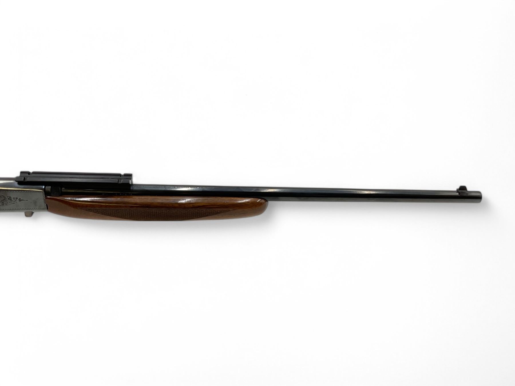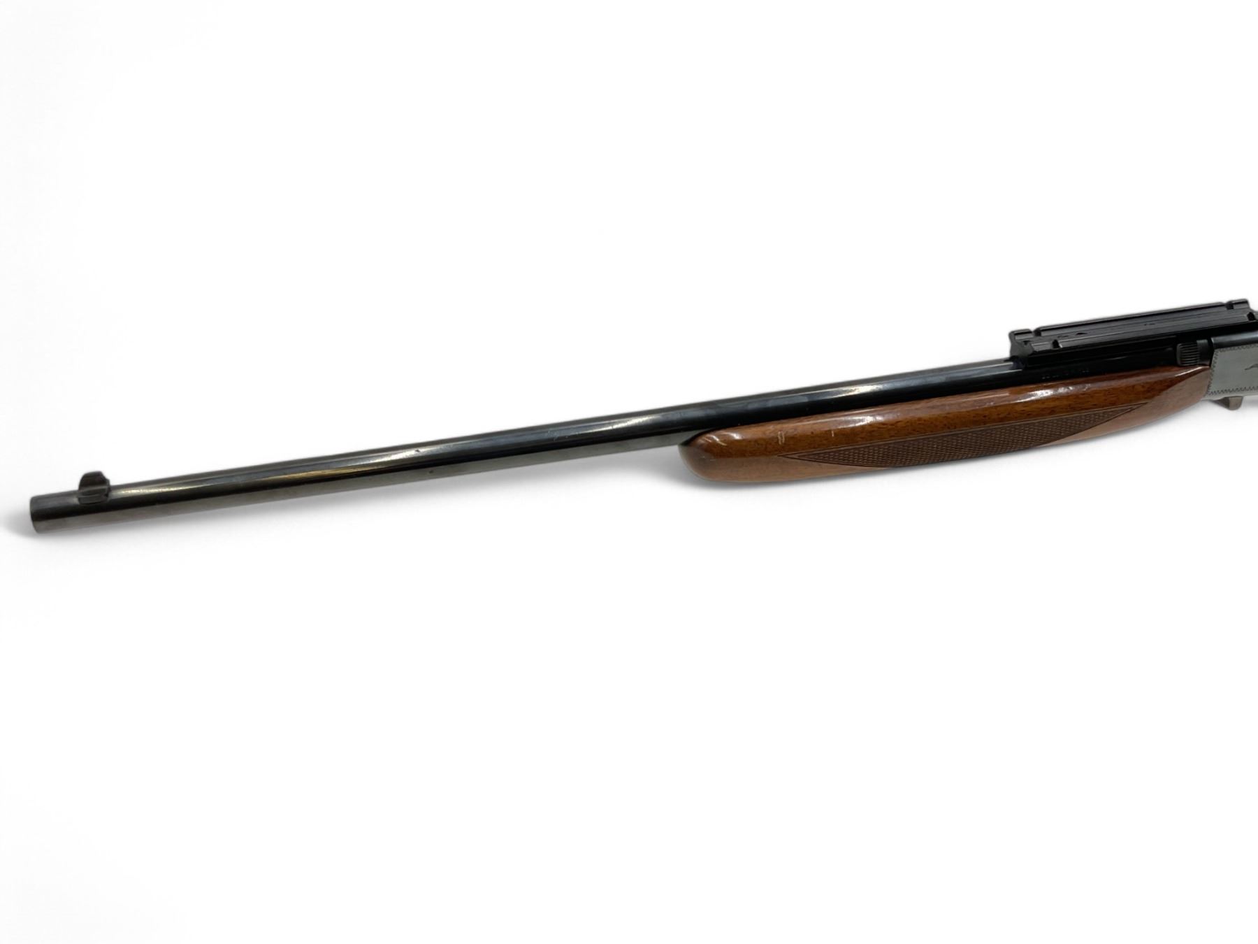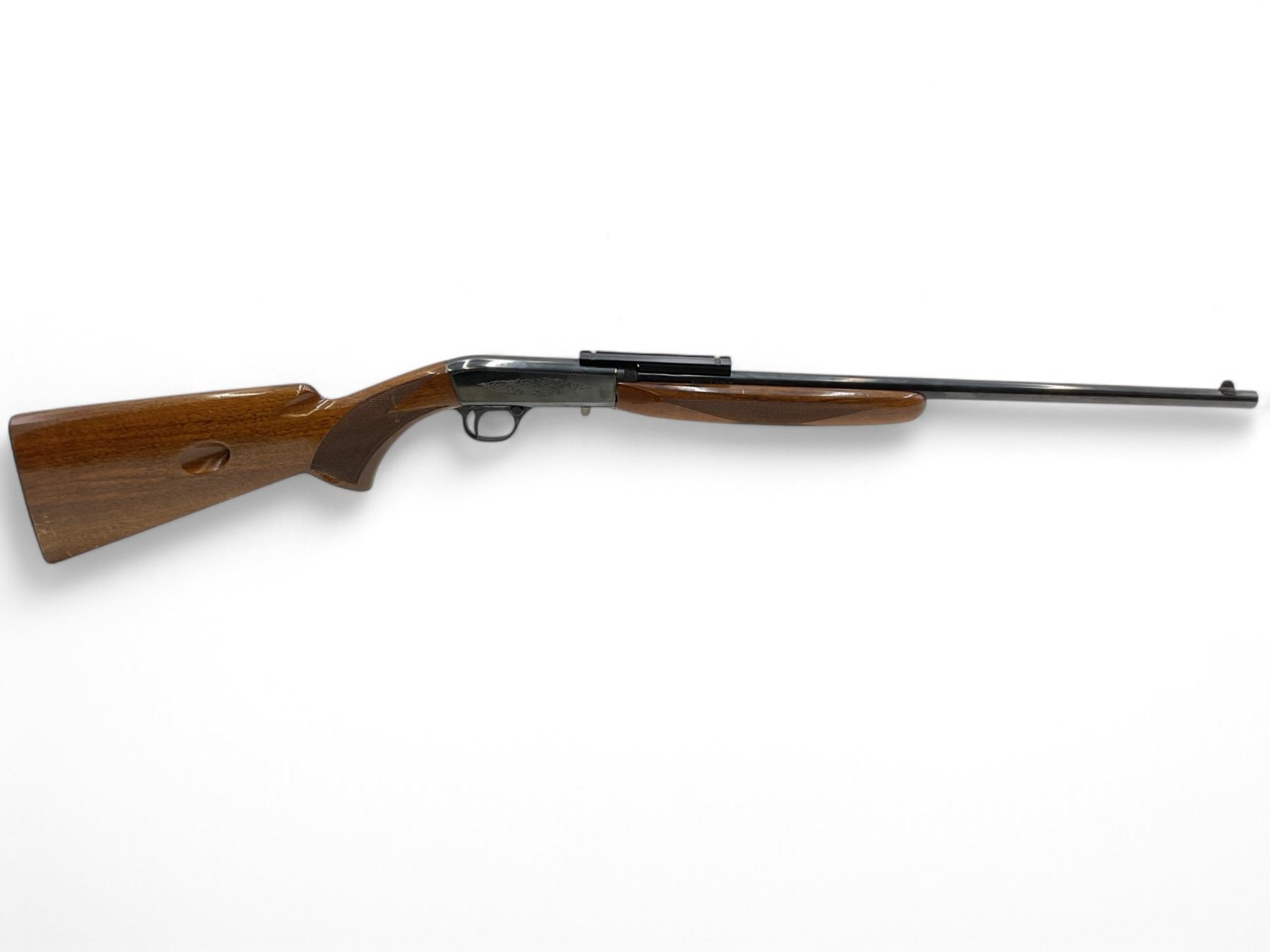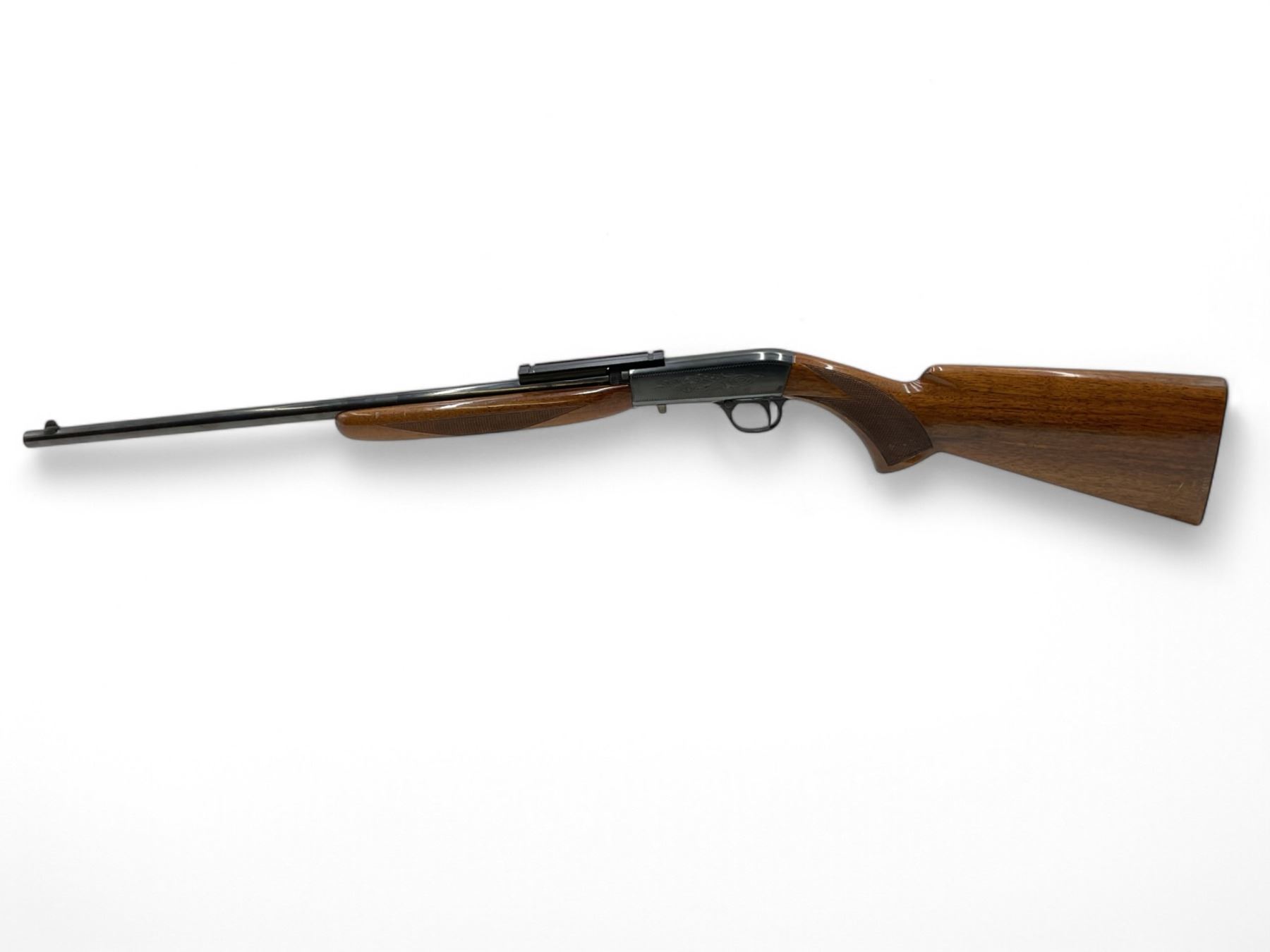 Browning SA22 Semi Auto Rifle 22LR 19" Barrel Wood Stock. Made in Belgium. Tubular magazine. Fixed front sight; missing rear sight. One piece rail mounted to barrel. This is a non-restricted firearm.