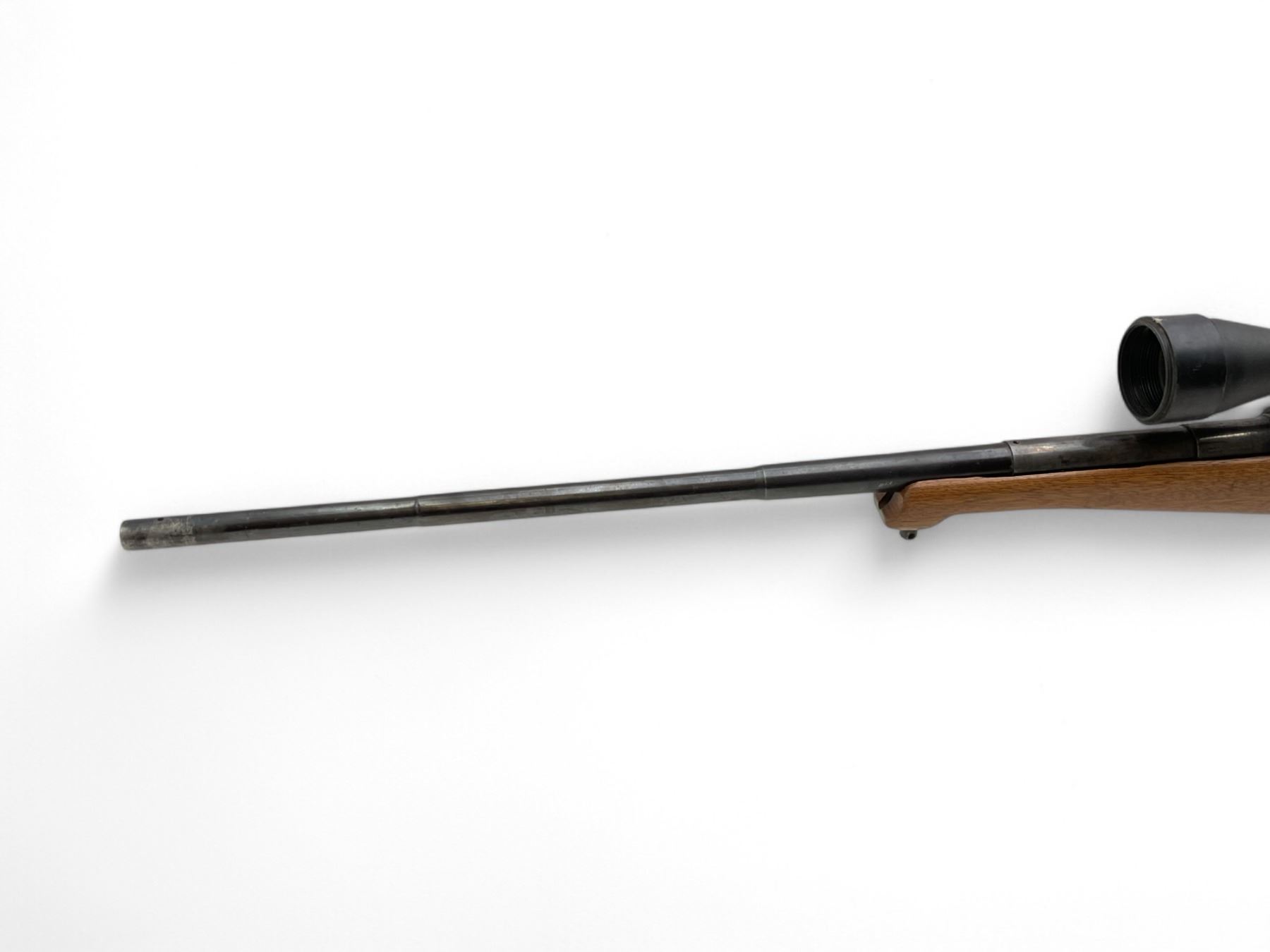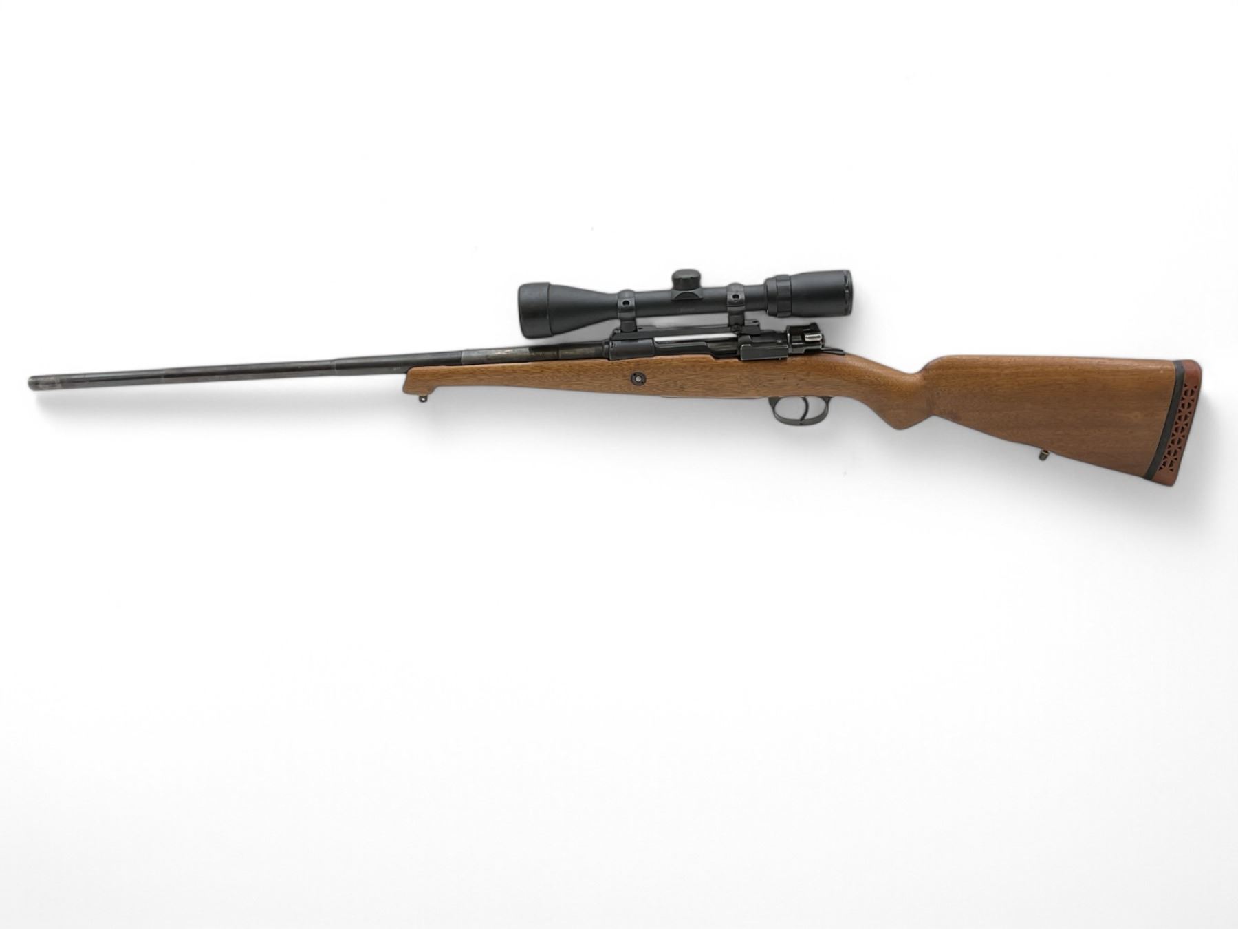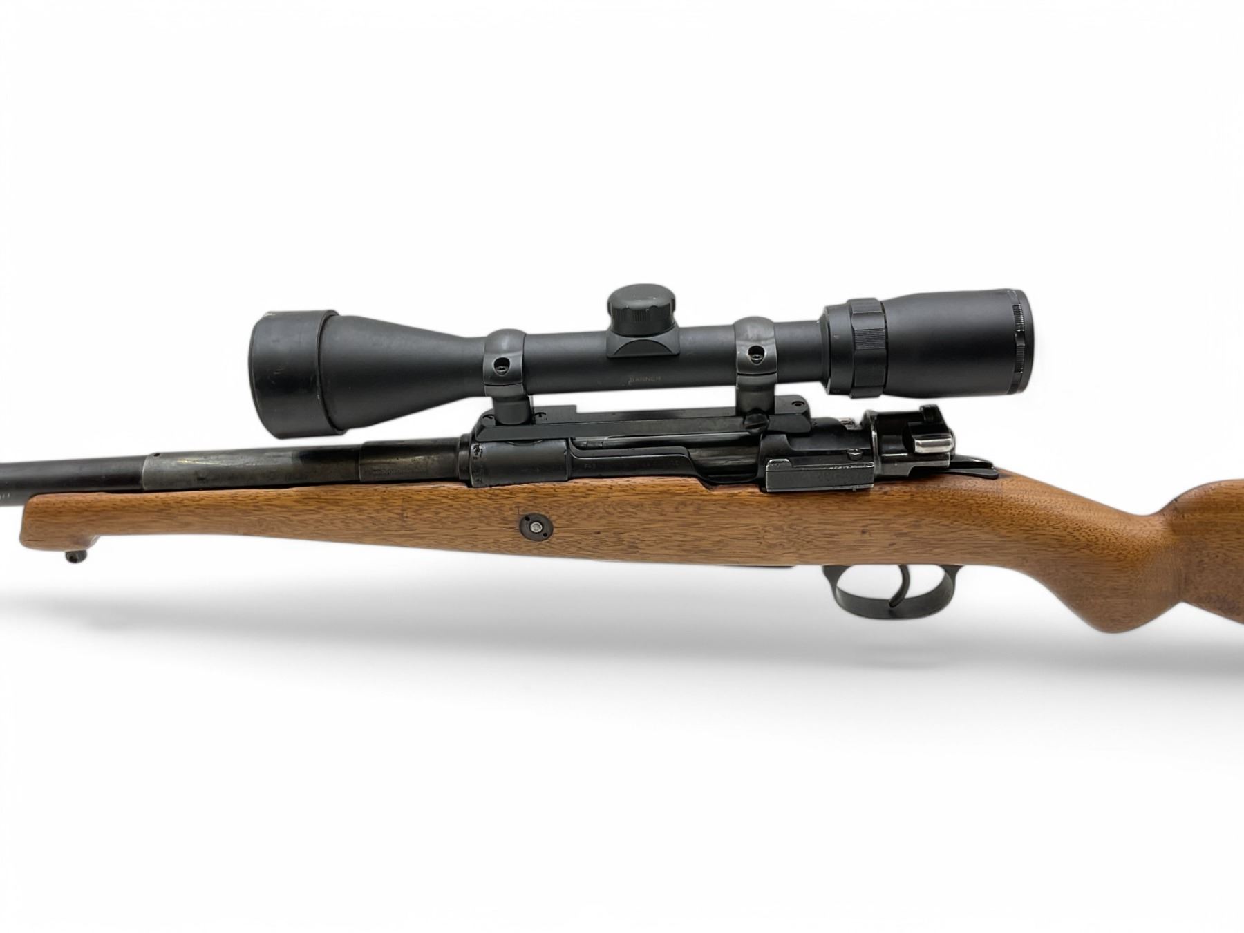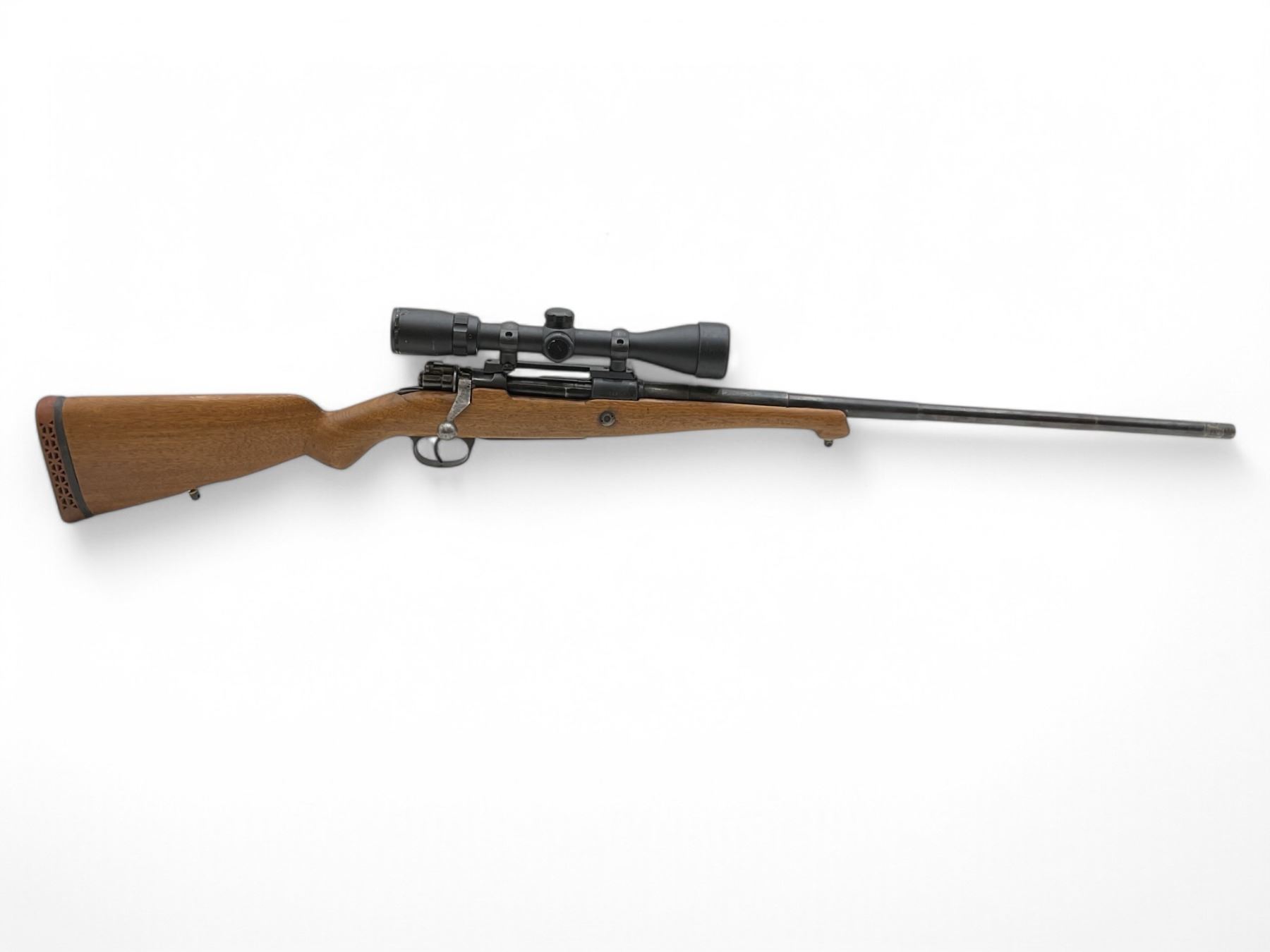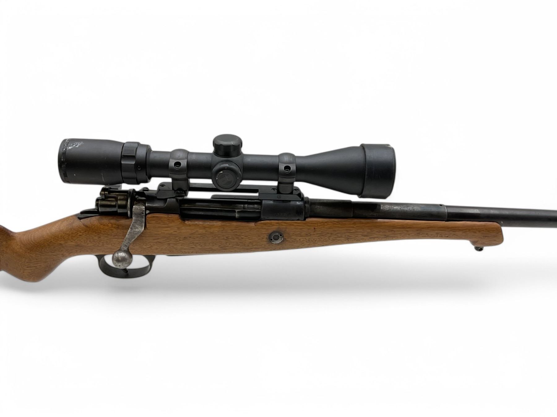 Sporterized FN Mauser Bolt Action Rifle 30-06 SPRG 24" Barrel Wood Stock With Bushnell 3-9X40 Scope. Internal magazine with a base plate. No sights; receiver drilled and tapped with one piece rail installed. Bolt handle has been cut and rewelded. Bushnell Banner 3-9X40 scope; custom butt pad installed. This is a non-restricted firearm.