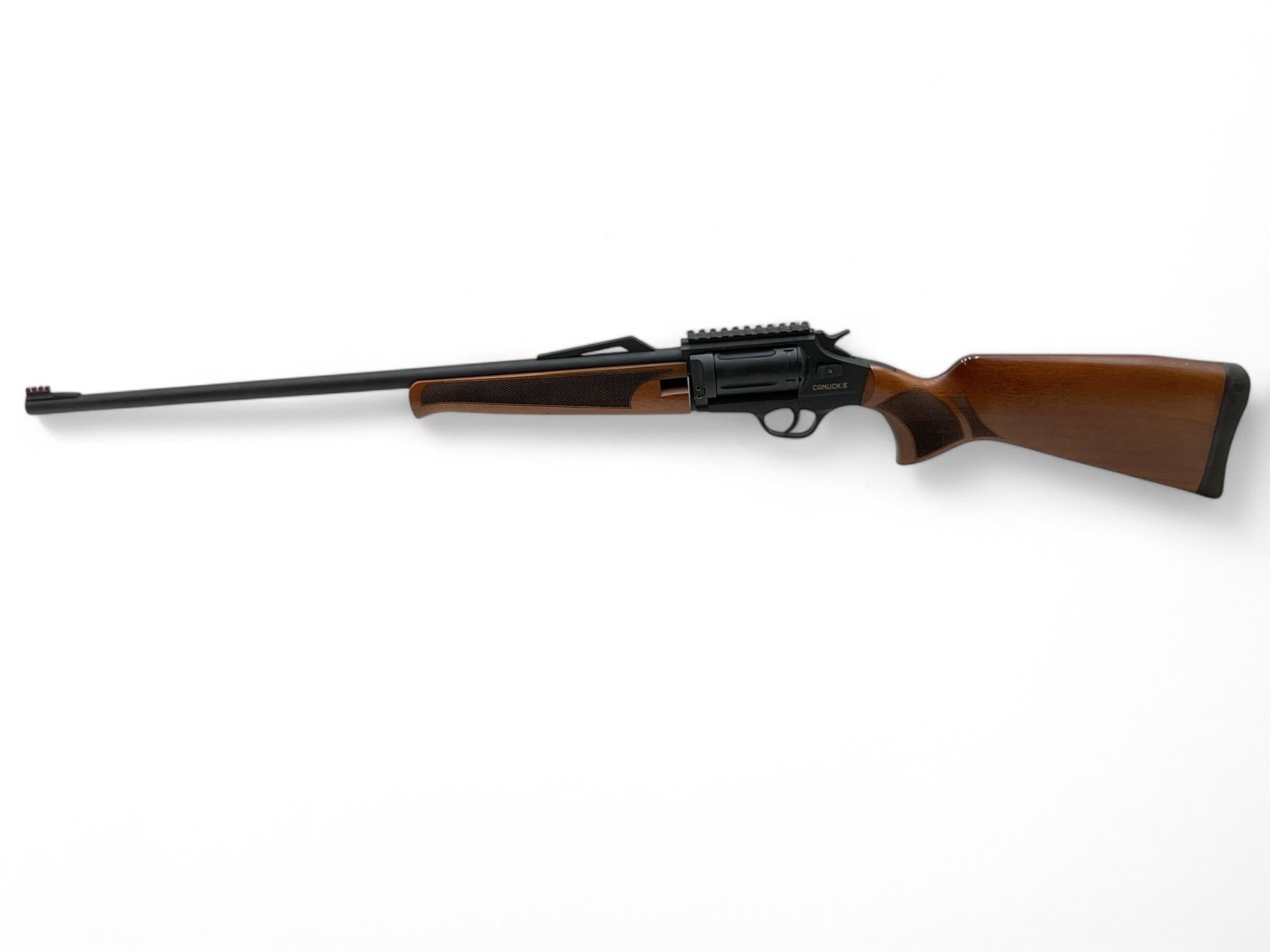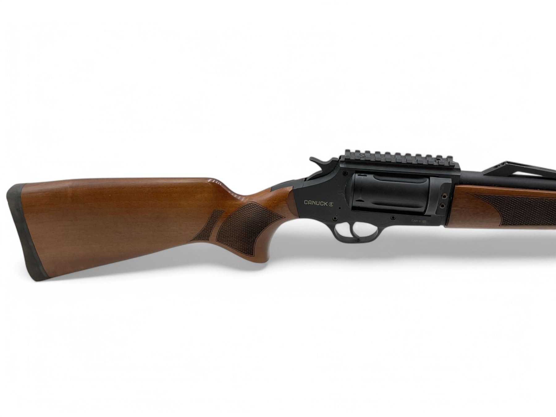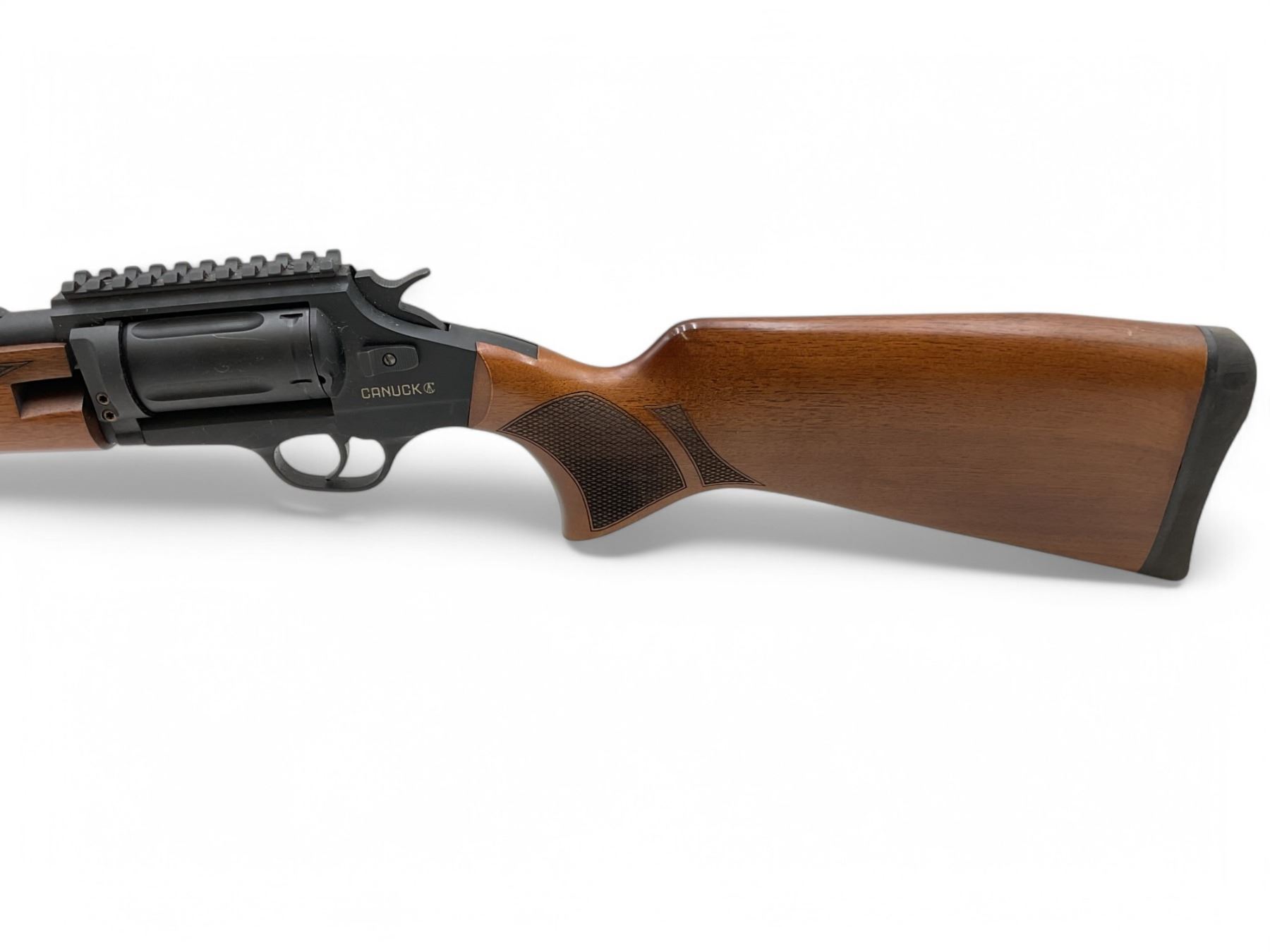 Canuck Revolver 410 Shotgun 3" Chamber 24" Barrel Wood Stock. Fiber optic front sight, fixed rear sight. Comes with a removable choke; receiver drilled and tapped with one piece rail installed. This is a non-restricted firearm.