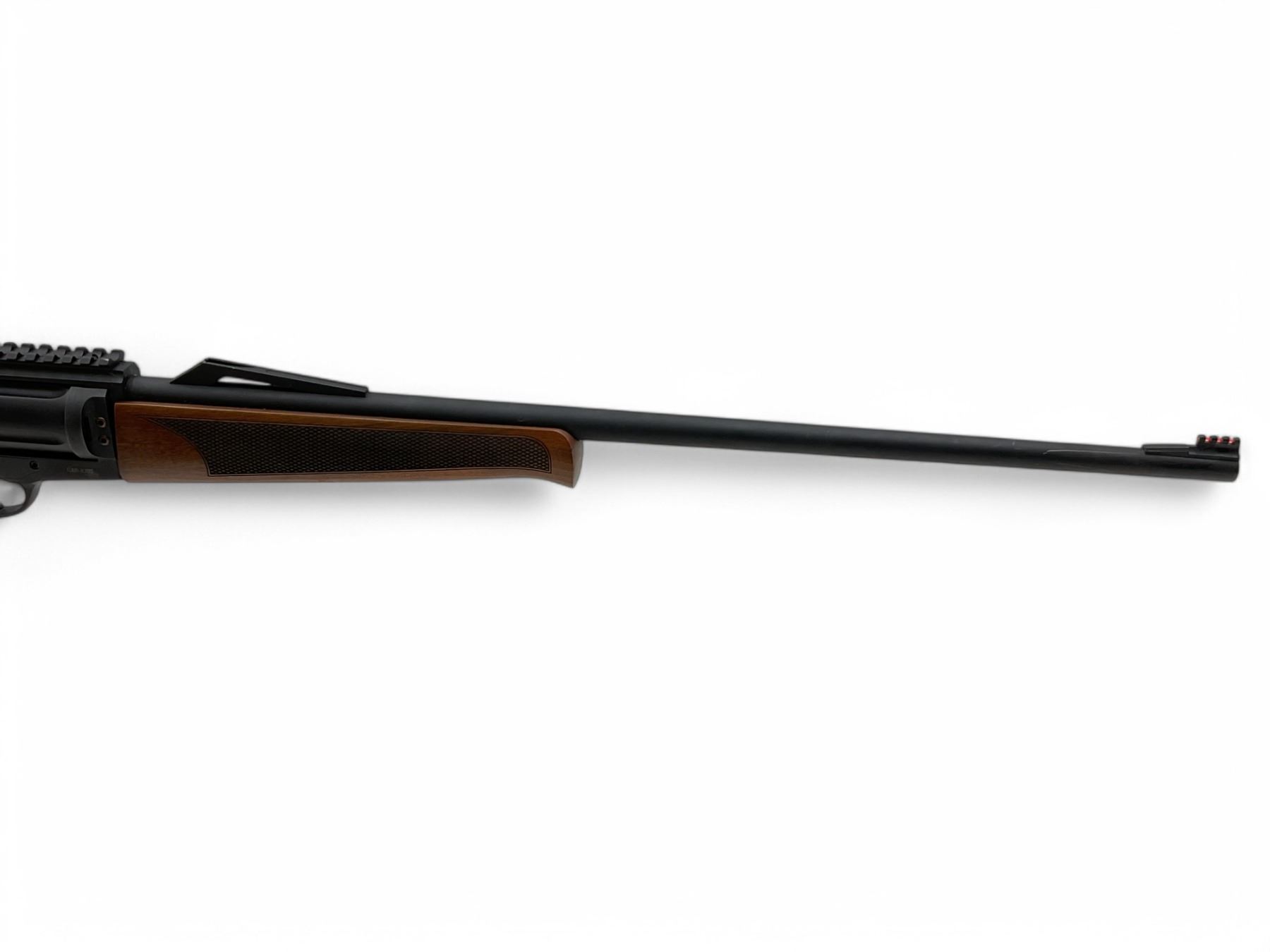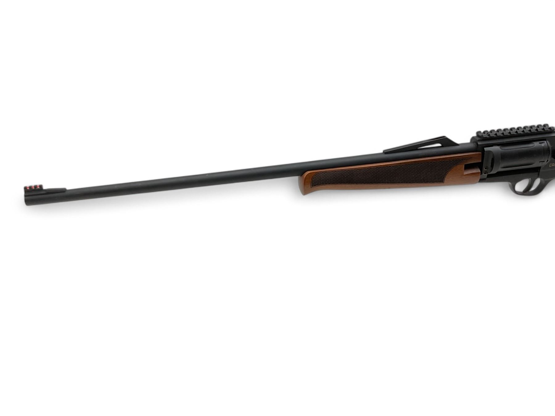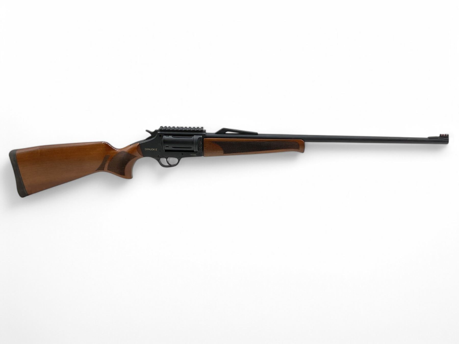 Canuck Revolver 410 Shotgun 3" Chamber 24" Barrel Wood Stock. Fiber optic front sight, fixed rear sight. Comes with a removable choke; receiver drilled and tapped with one piece rail installed. This is a non-restricted firearm.