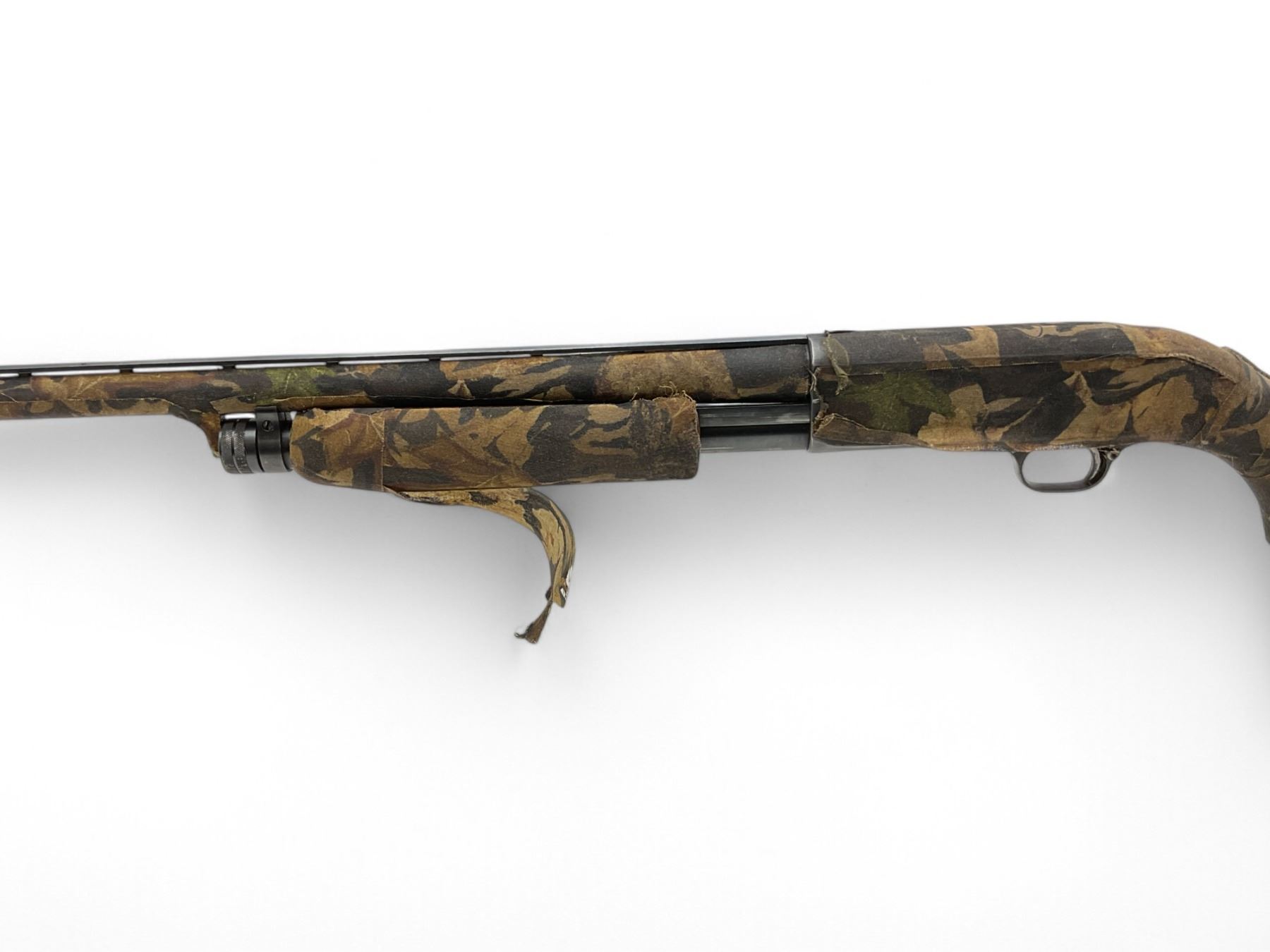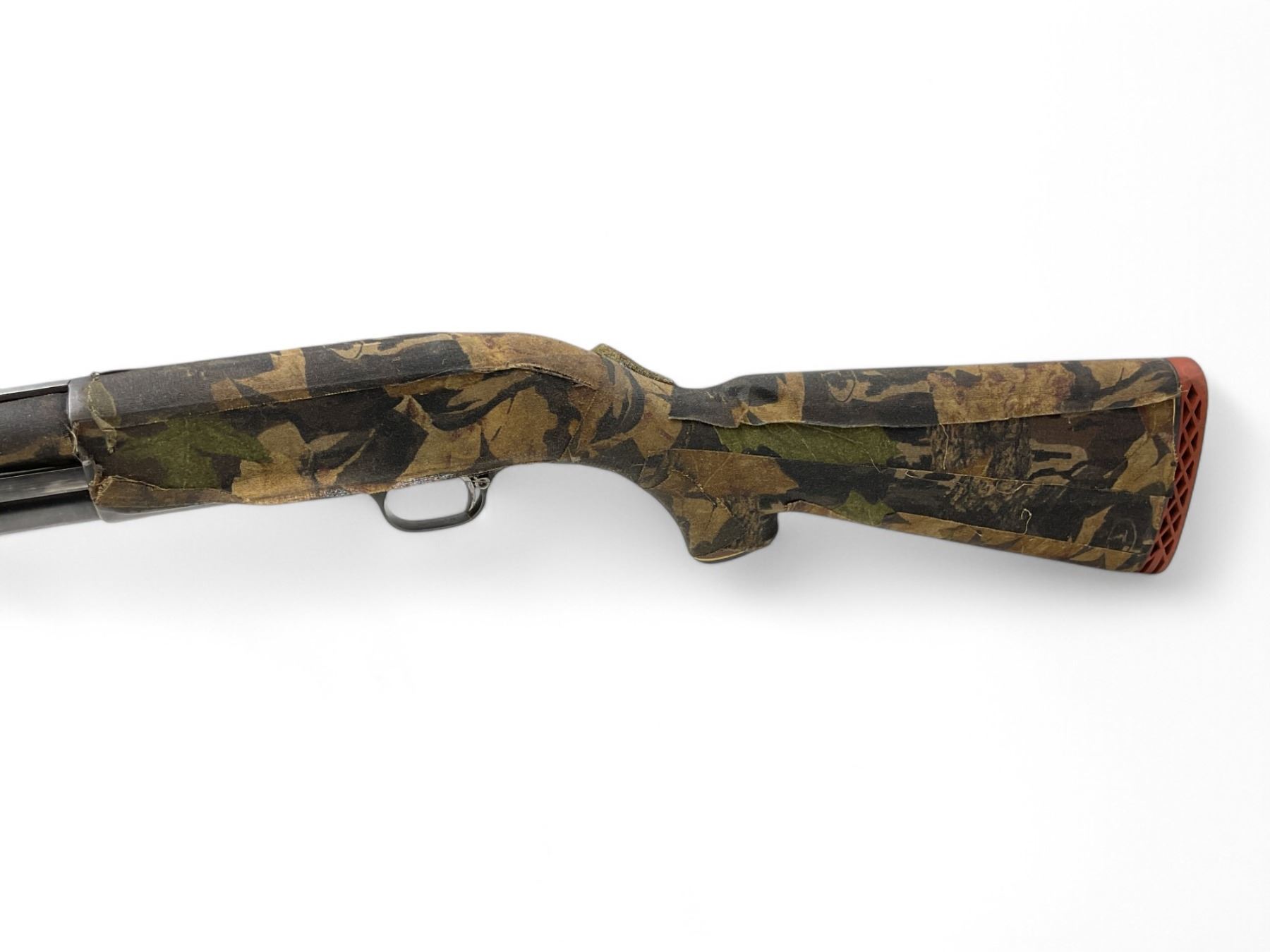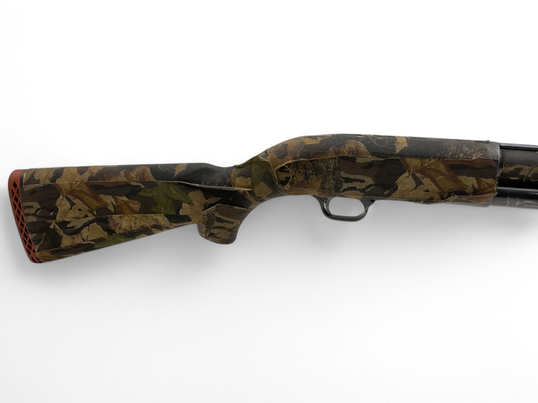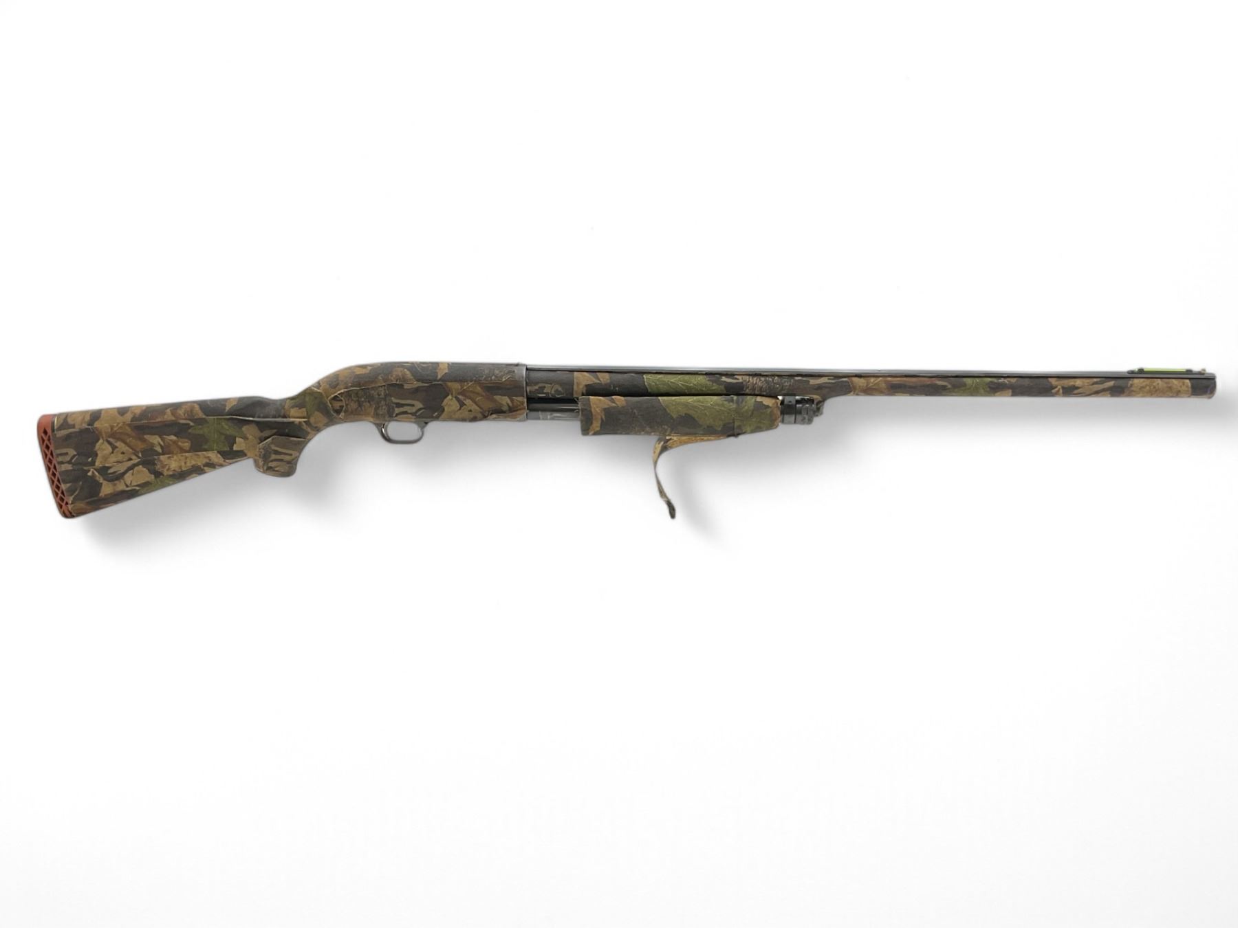 Ithaca Pump Action 12Ga Shotgun 2.75" Chamber 28" Vent Rib Barrel Camo. Fiberoptic sight; fixed choke. Gun is covered in camo tape; rear stock and forend are wood. This is a non-restricted firearm.