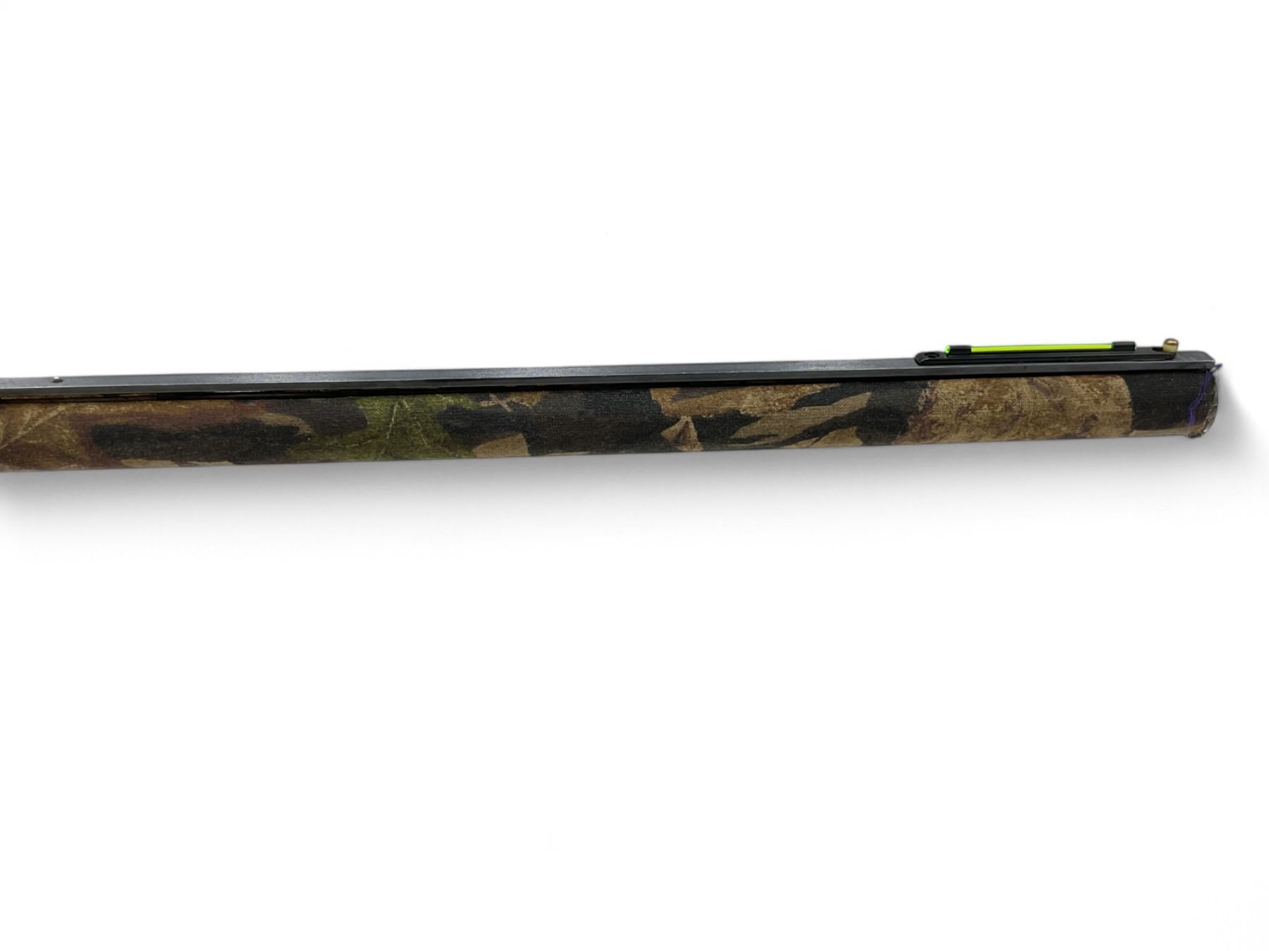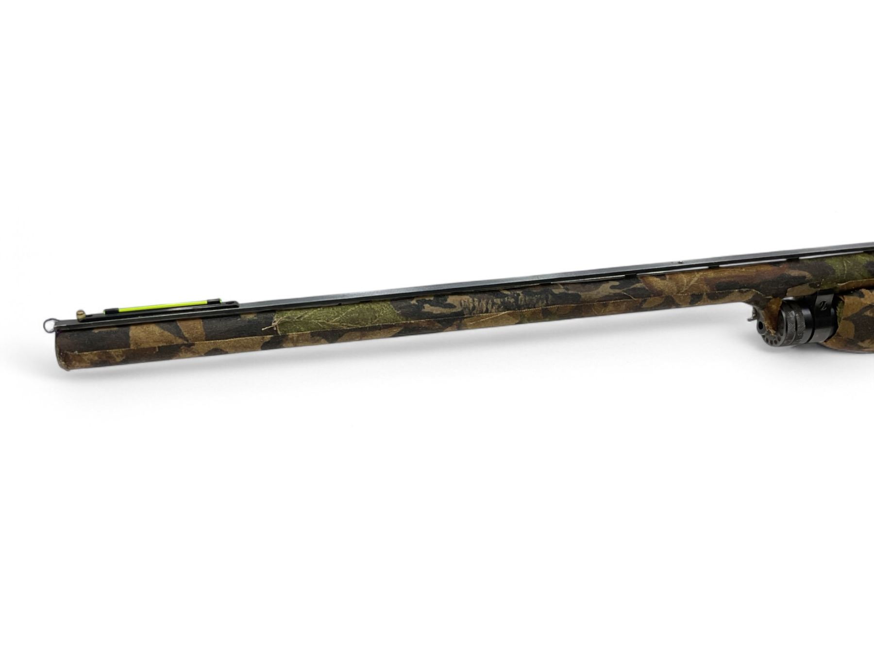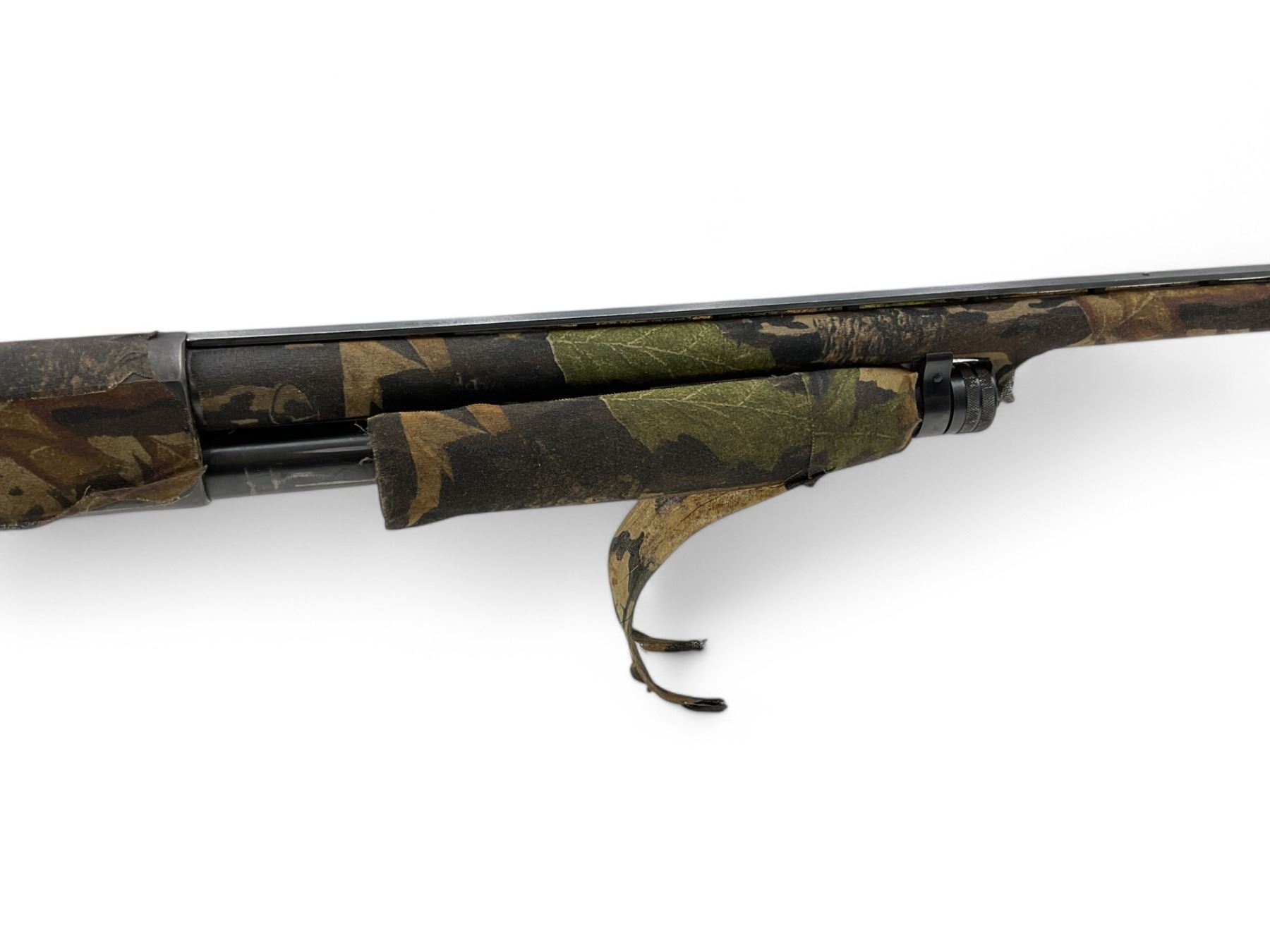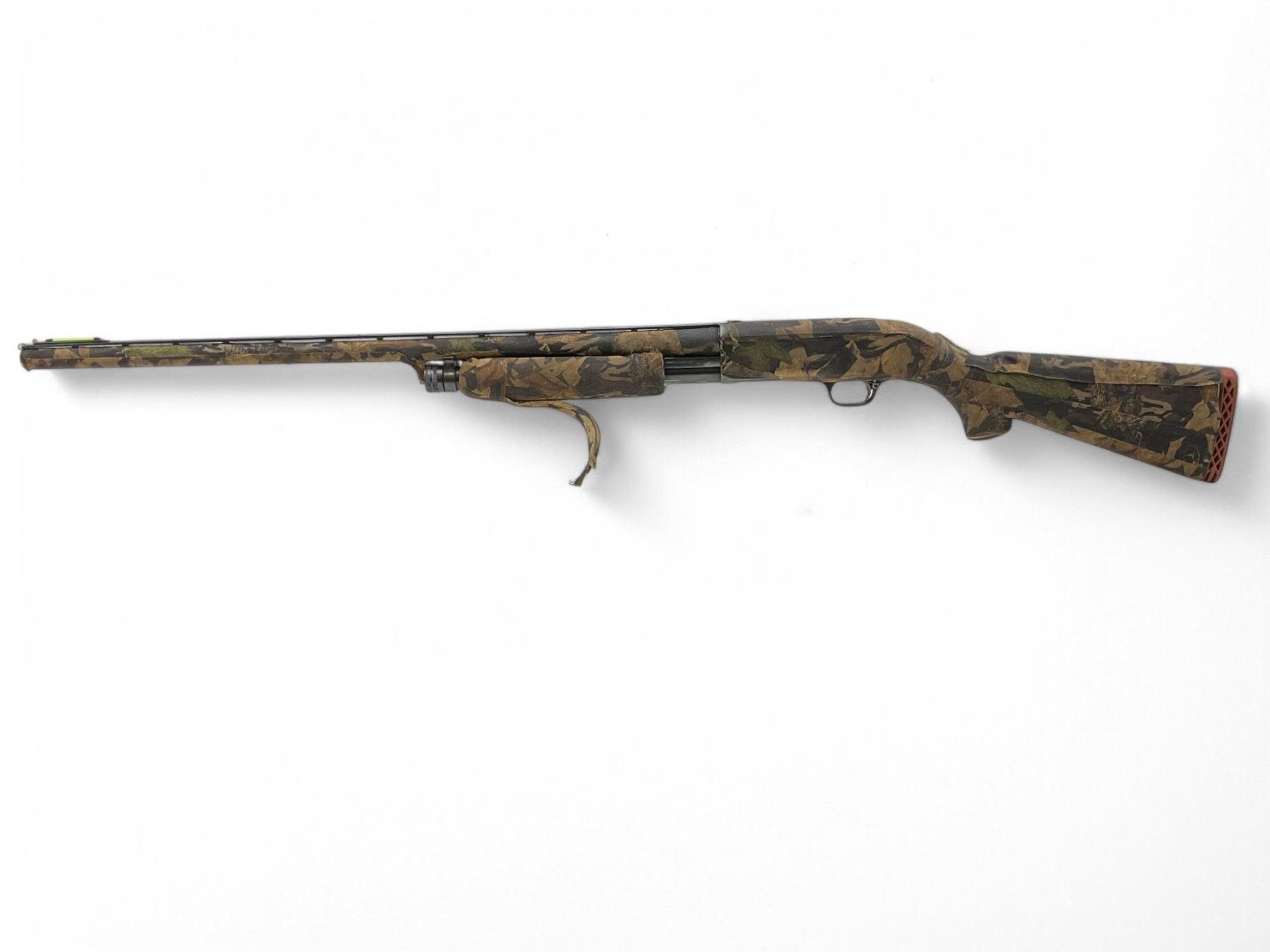 Ithaca Pump Action 12Ga Shotgun 2.75" Chamber 28" Vent Rib Barrel Camo. Fiberoptic sight; fixed choke. Gun is covered in camo tape; rear stock and forend are wood. This is a non-restricted firearm.