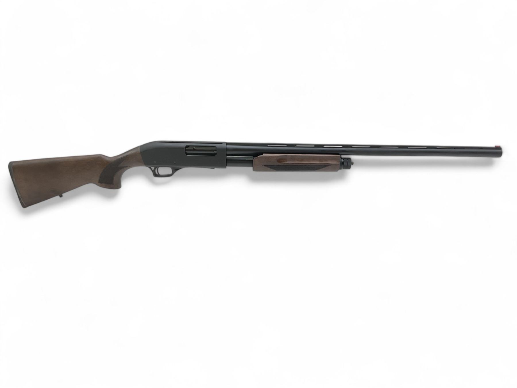 Canuck Pioneer Pump Action Shotgun 12Ga 3" Chamber 28" Vent Rib Barrel Wood Stock, New. Fiber optic sight; comes with a removable choke. This is a non-restricted firearm.