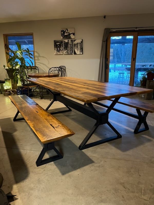 *The wood top sits on a custom steel base and adorned with 2 matching side benches