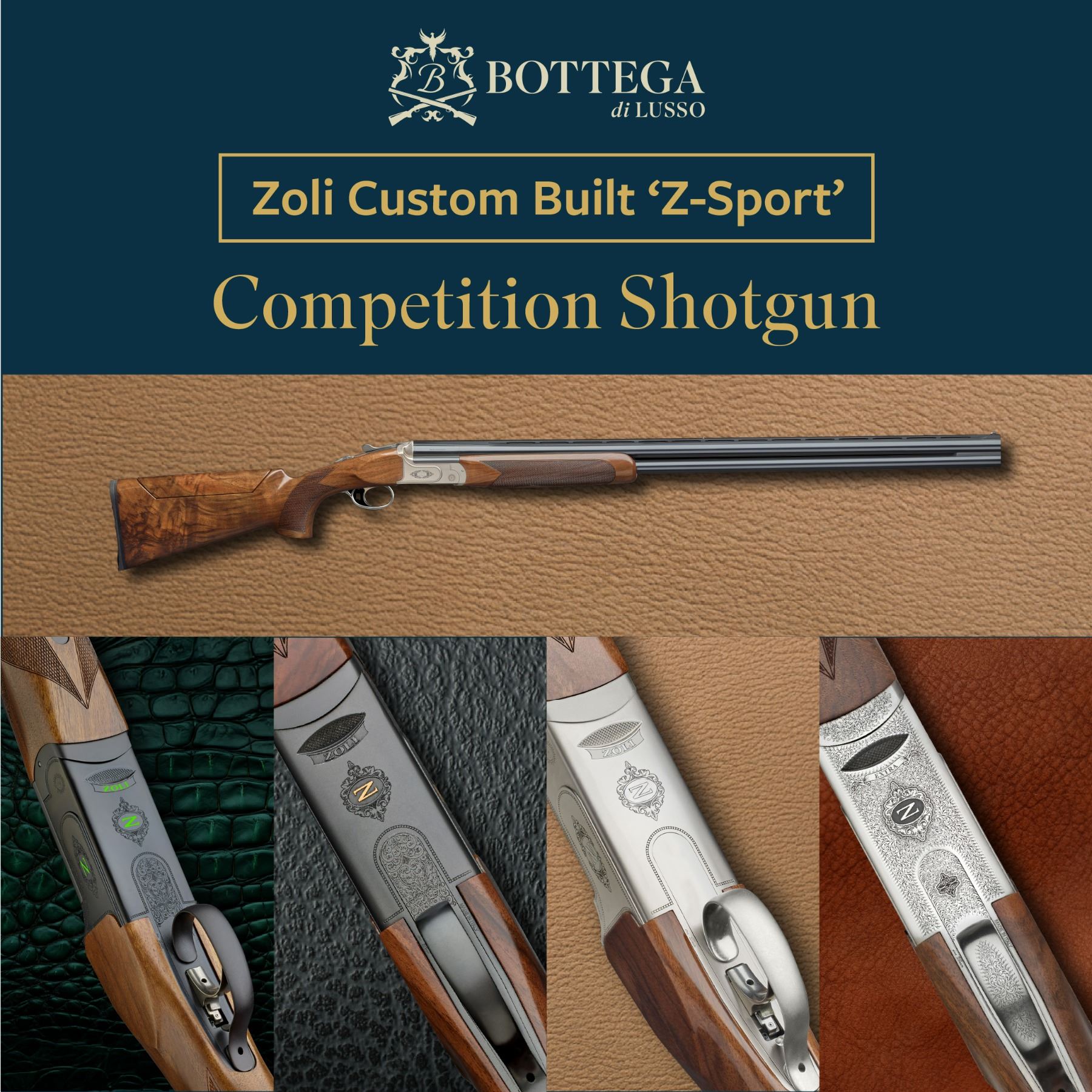 Bottega di Lusso offers the Zoli custom Z-Sport Competition Shotgun, available in your choice of distinguished finishes: Silver, Grey Stone, Dark Side, or Extra. Select your ideal gauge, rib design, barrel length, and choose between a meticulously adjustable Standard or Monte Carlo stock.