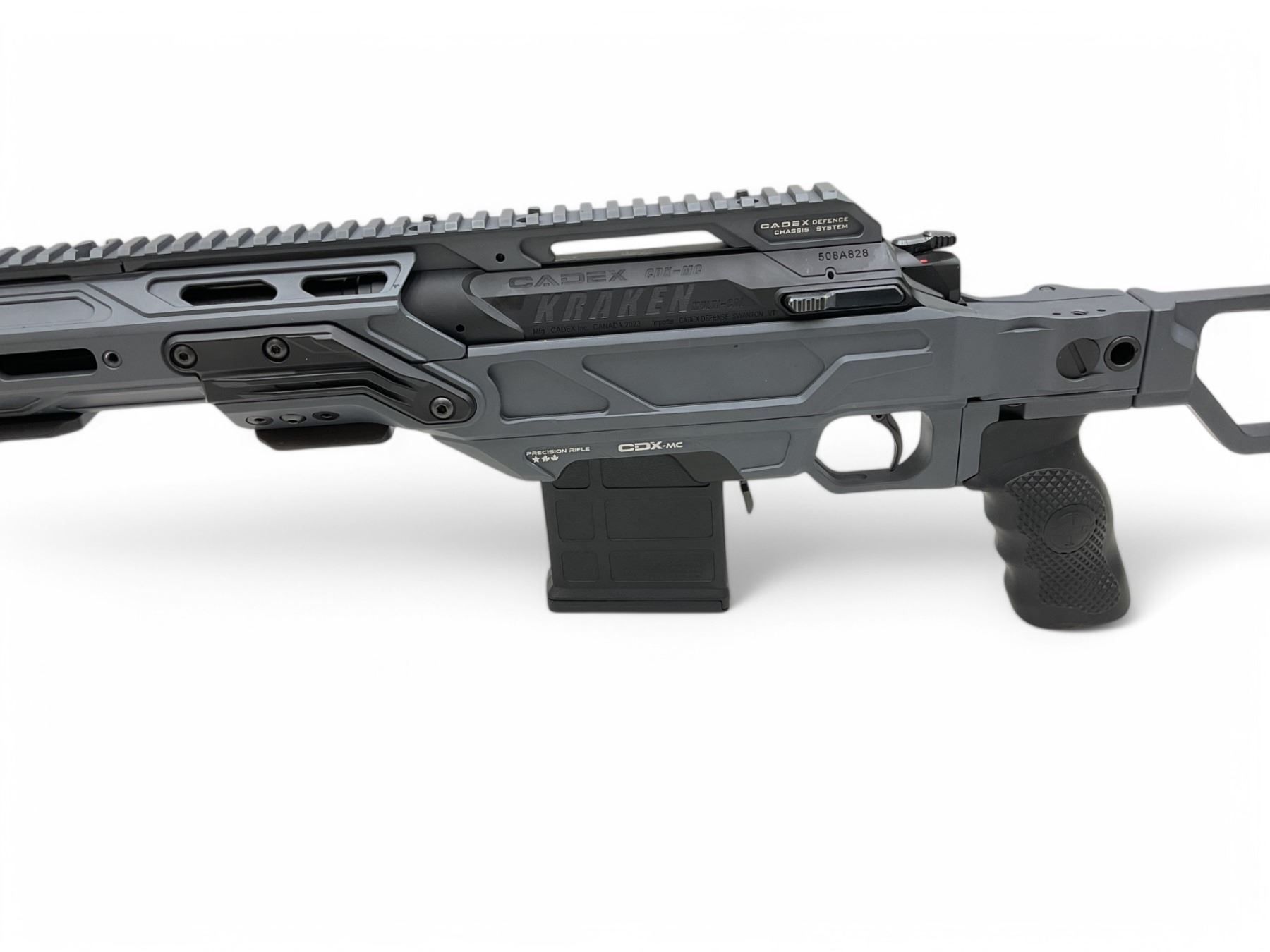 Cadex CDX-MC Kraken Bolt Action Rifle 6.5 Creedmoor 26" Threaded Barrel Grey/Black Folding Stock. Includes one detachable magazine; full length top picatinny rail. Enlarged bolt knob; rear stock can be adjusted for length and cheek riser can be adjusted for height. Fluted barrel; comes with Cadex brake installed. This is a non-restricted firearm.