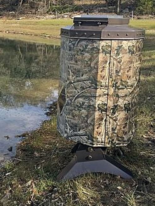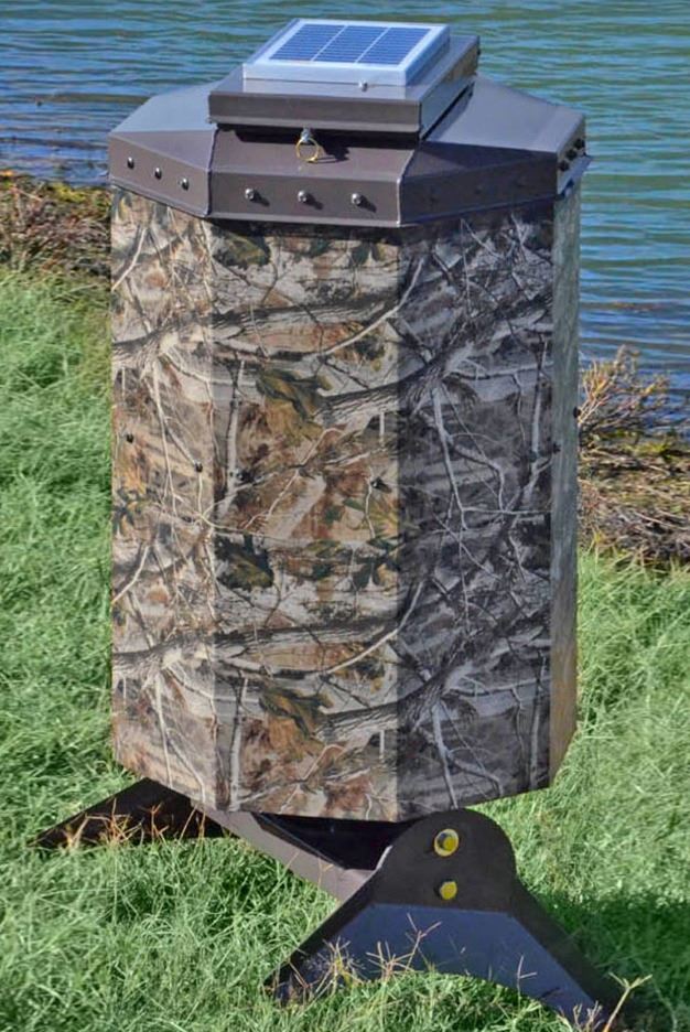 The Texas Avenger features the time tested Eliminator Spinner Plate and The Timer. It is powered by a 12 volt system, battery and solar panel included. Both the timer and battery are housed in the lid for easy access, and the Eliminator spinner plate keeps varmints away from you fish food. This Texas Avenger #100 holds 2 bags of fish food and throws food up and away from dock or bank. The galvanized hopper eliminates internal sweating. This item was donated by Bruser Farms.