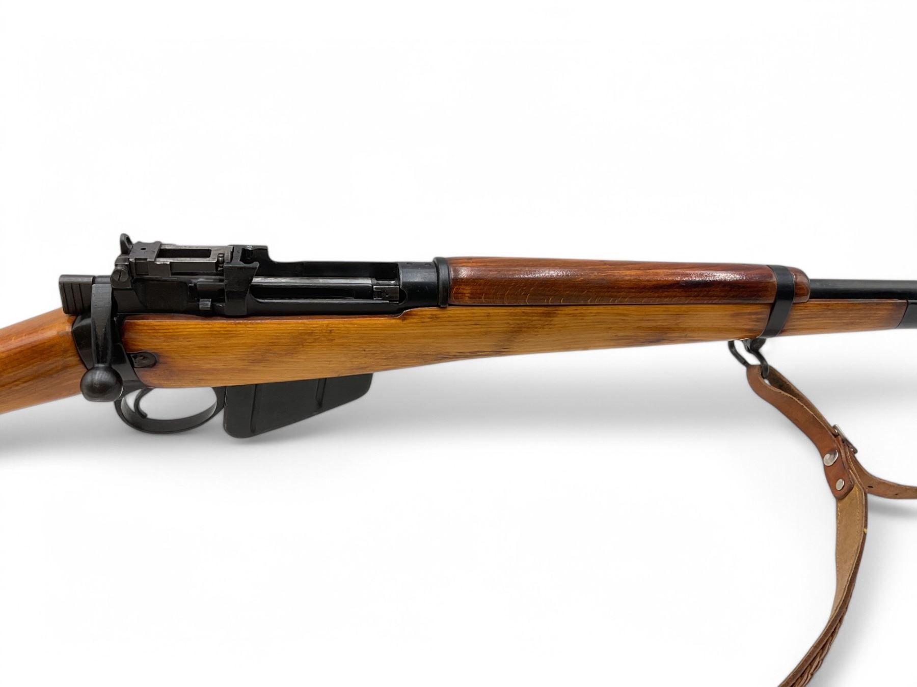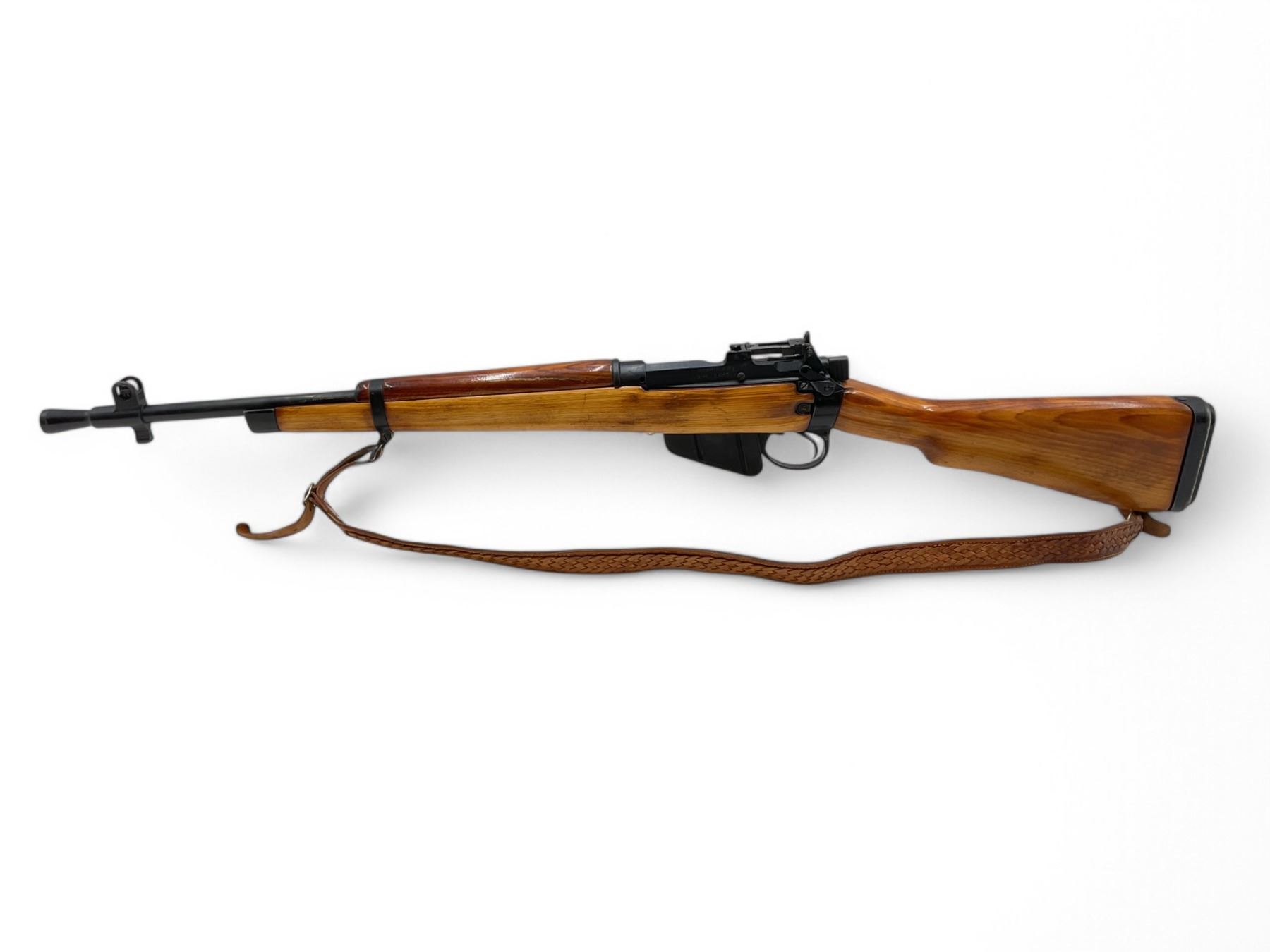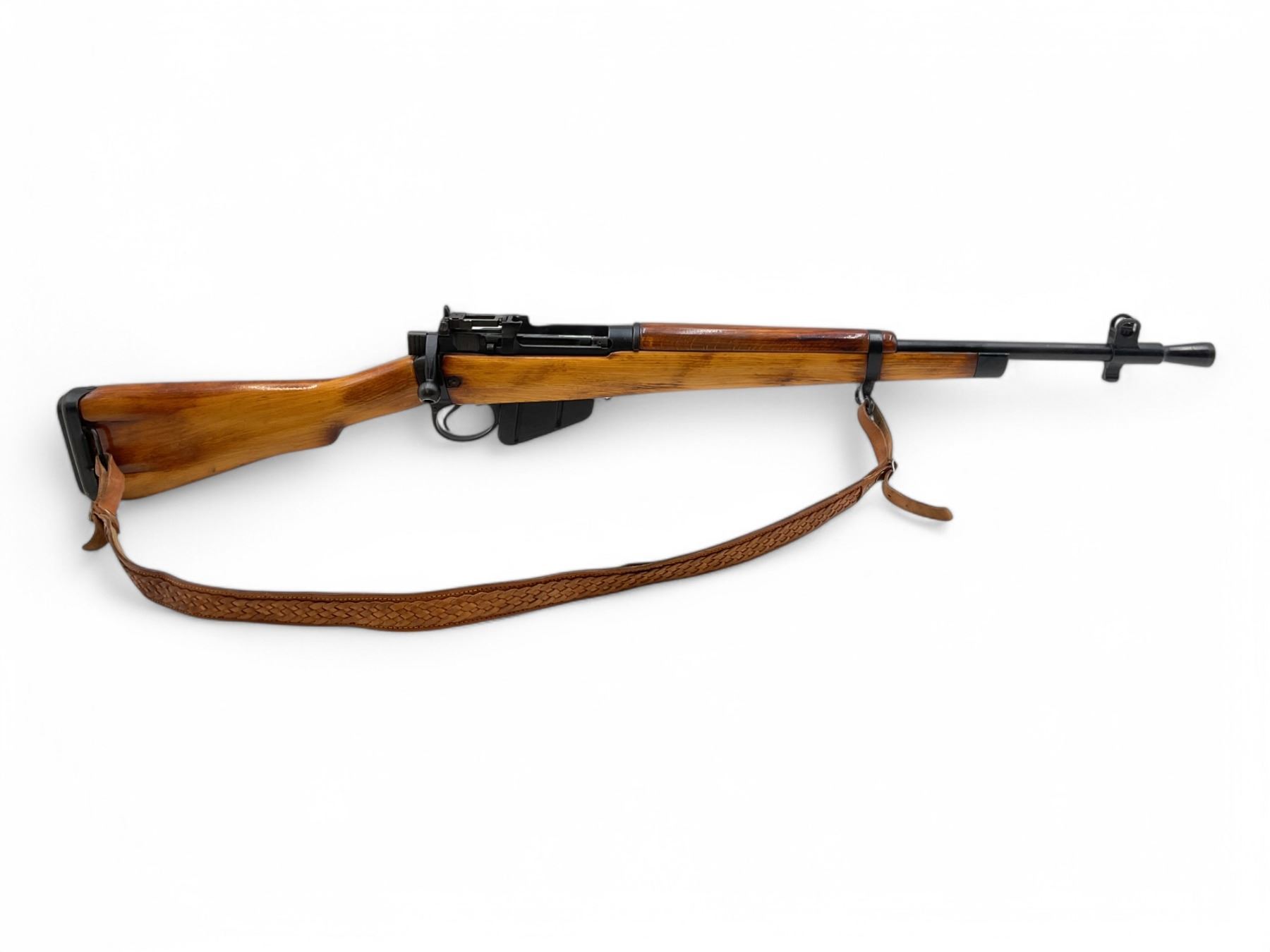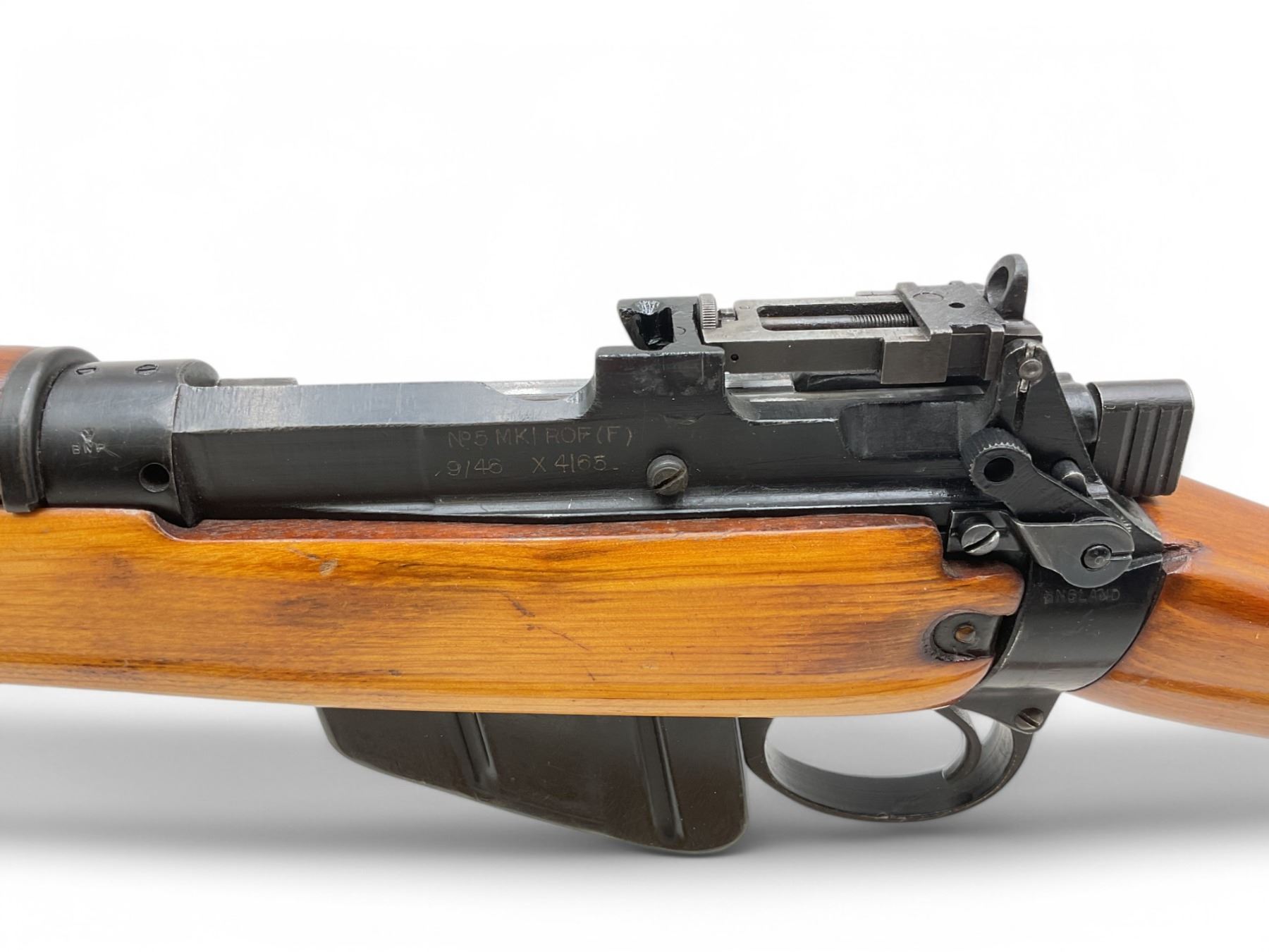Lee Enfield No5 MkI Jungle Carbine Bolt Action Rifle 303 British 18.75" Barrel Full Wood Stock. Comes with a detachable magazine; also includes leather sling. Fixed front sight, adjustable rear sight. Receiver has been drilled and tapped. This is a non-restricted firearm.