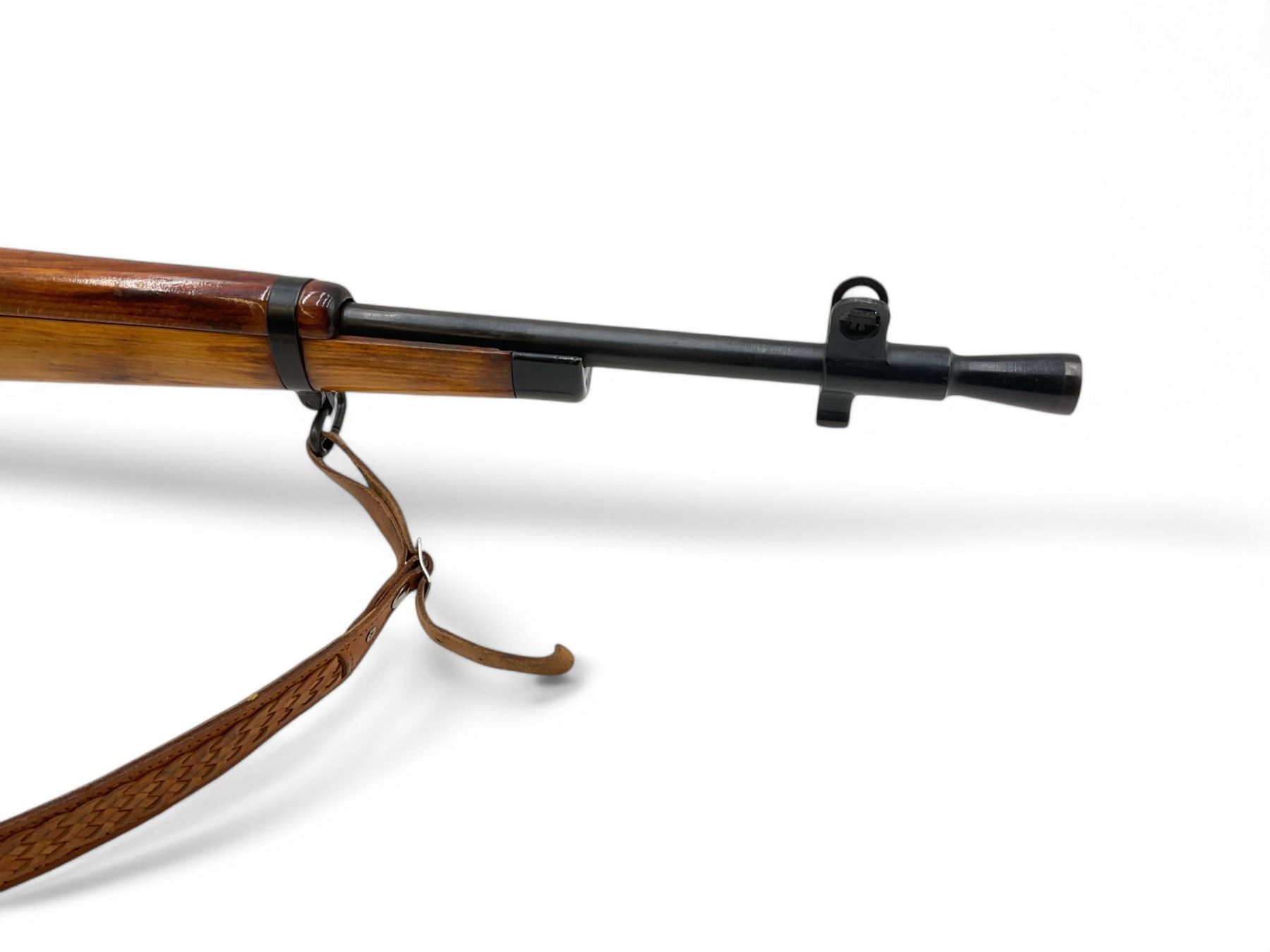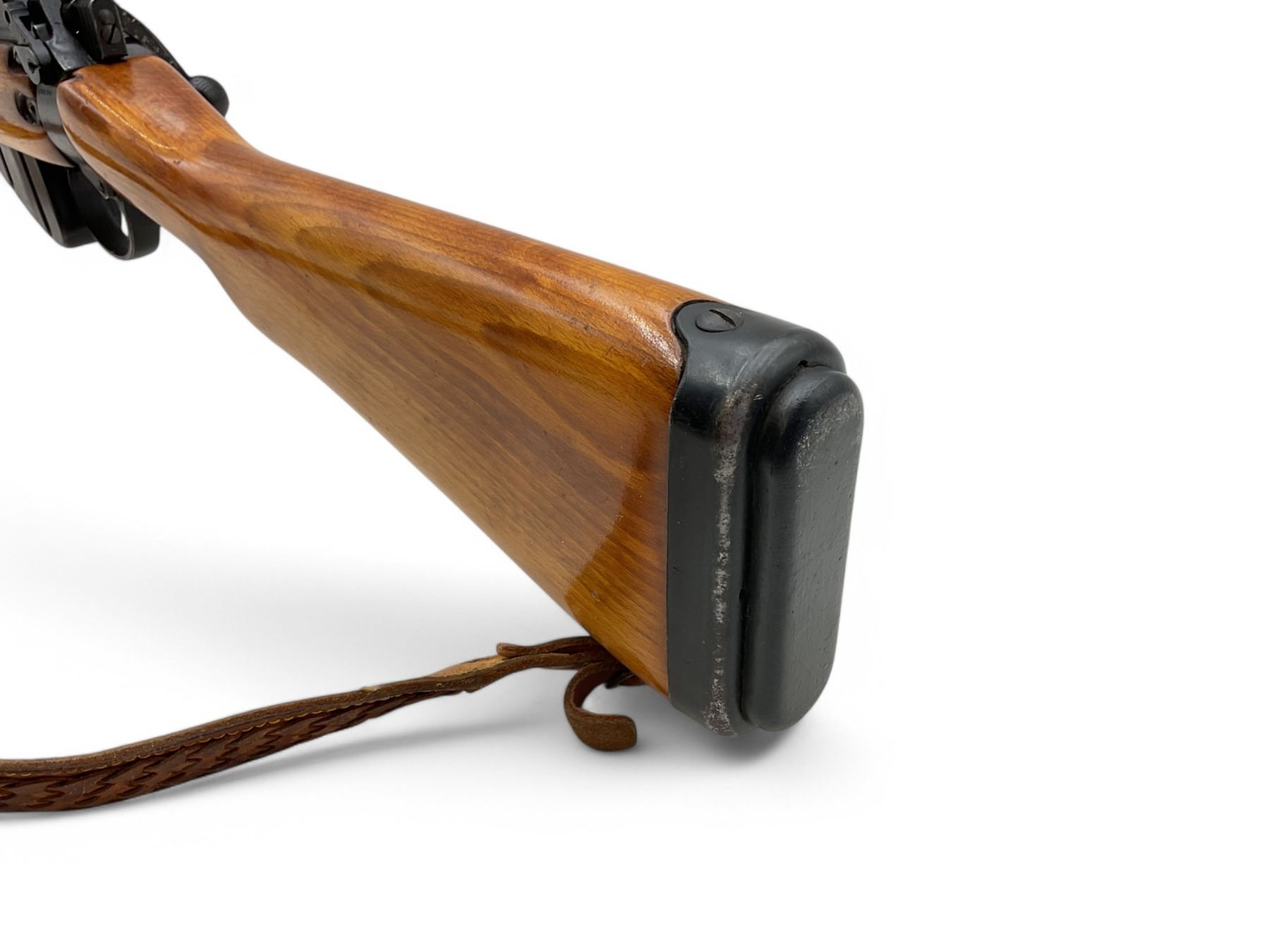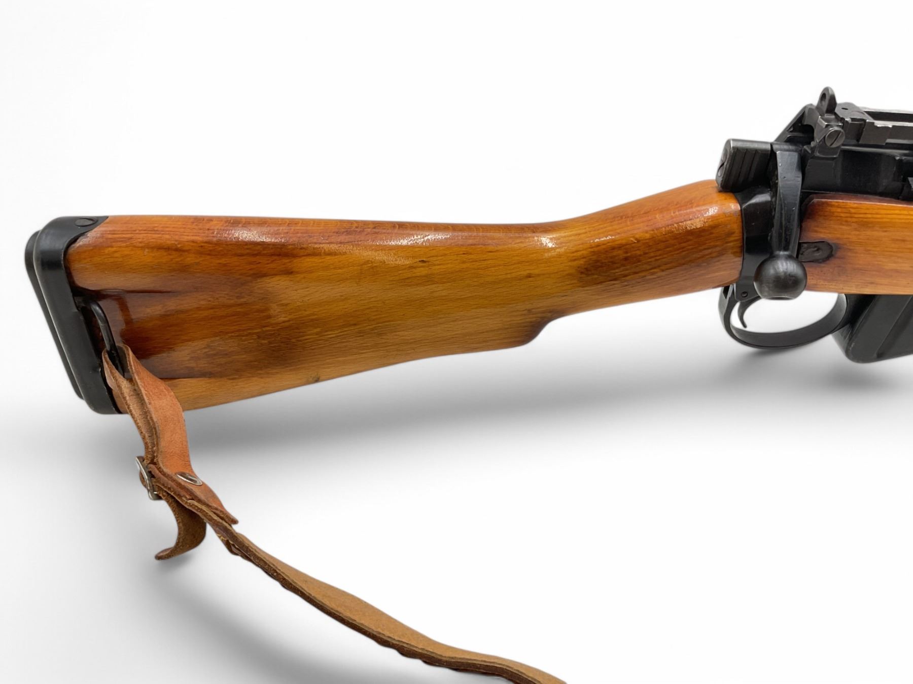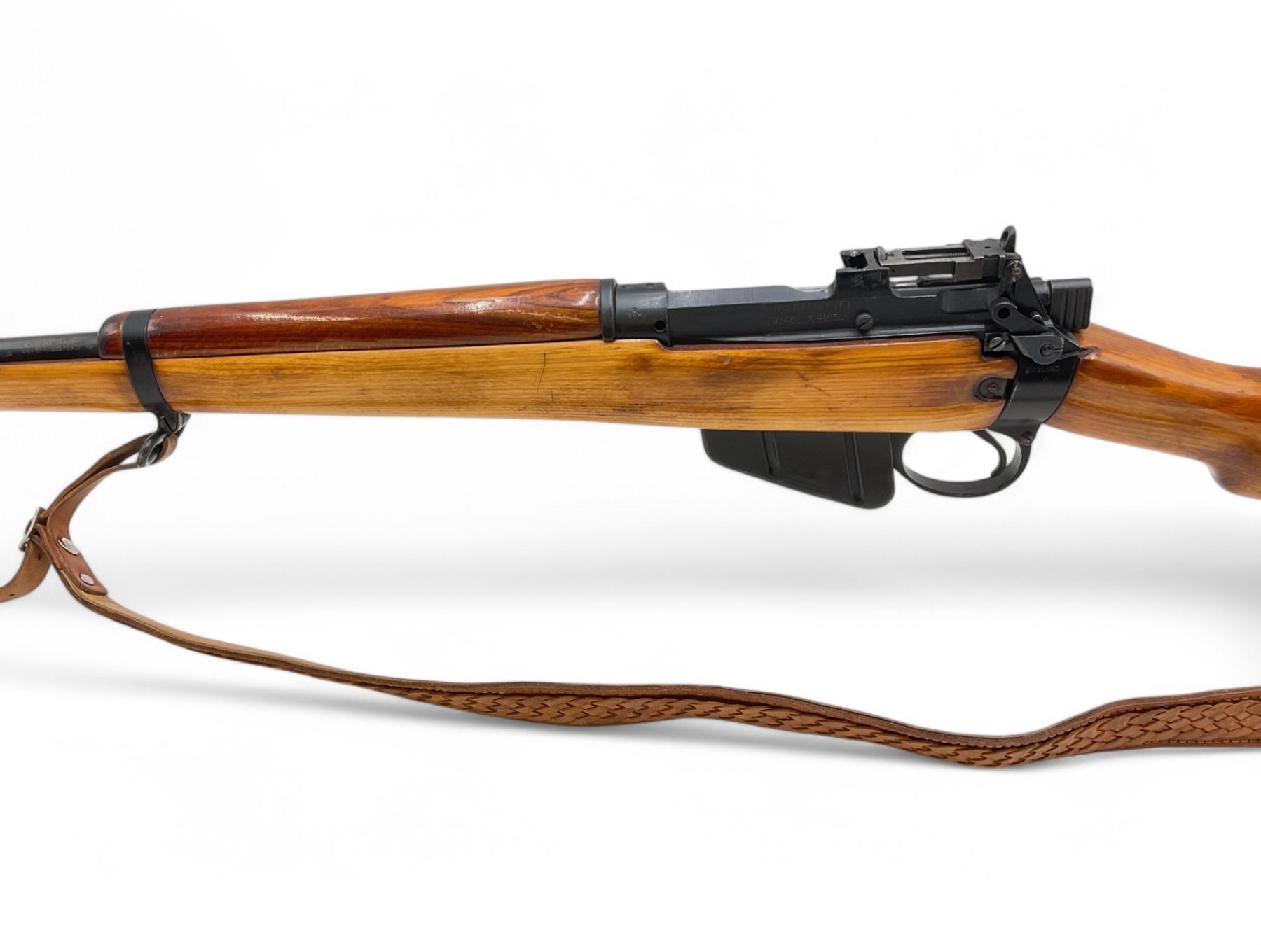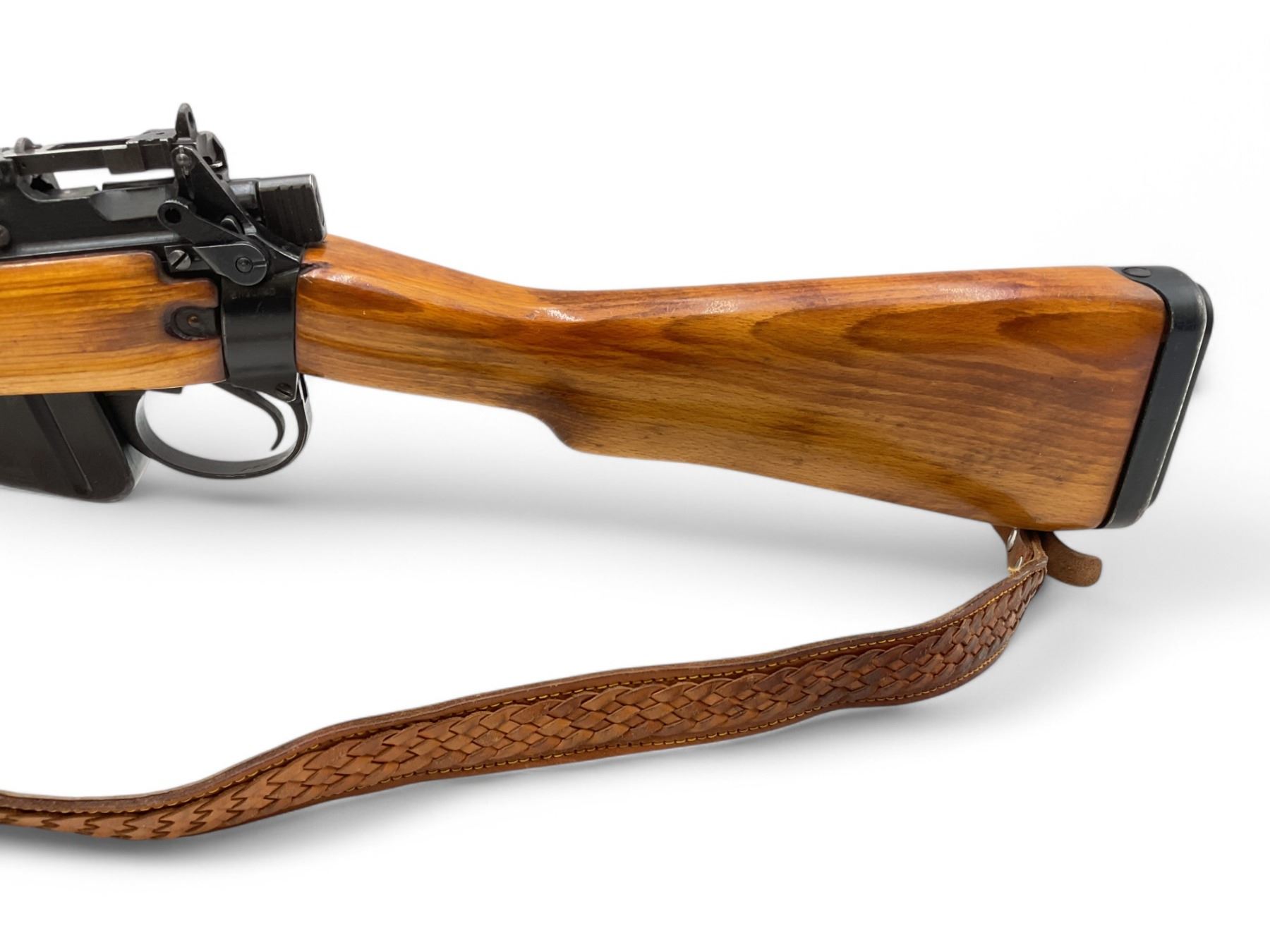 Lee Enfield No5 MkI Jungle Carbine Bolt Action Rifle 303 British 18.75" Barrel Full Wood Stock. Comes with a detachable magazine; also includes leather sling. Fixed front sight, adjustable rear sight. Receiver has been drilled and tapped. This is a non-restricted firearm.