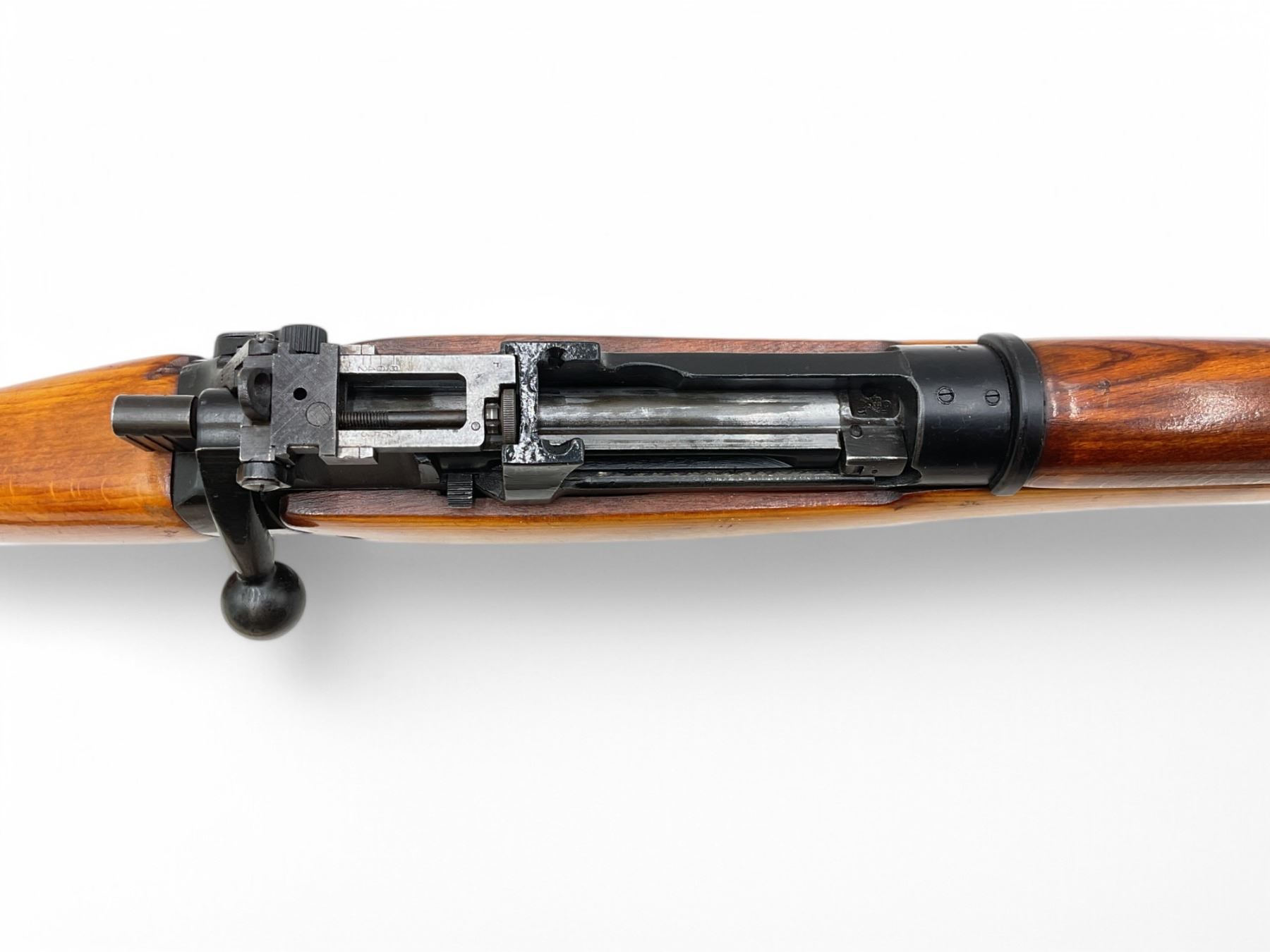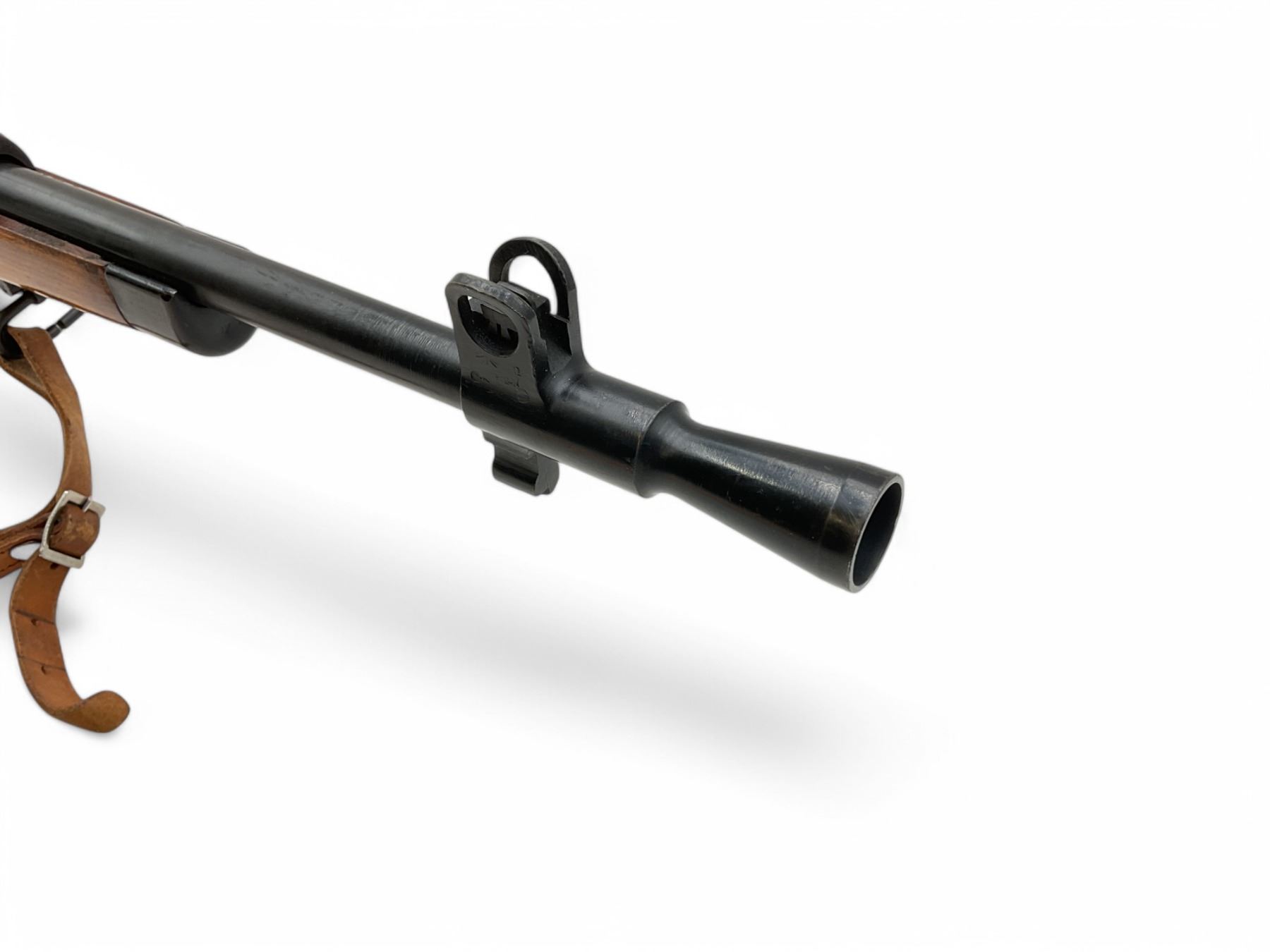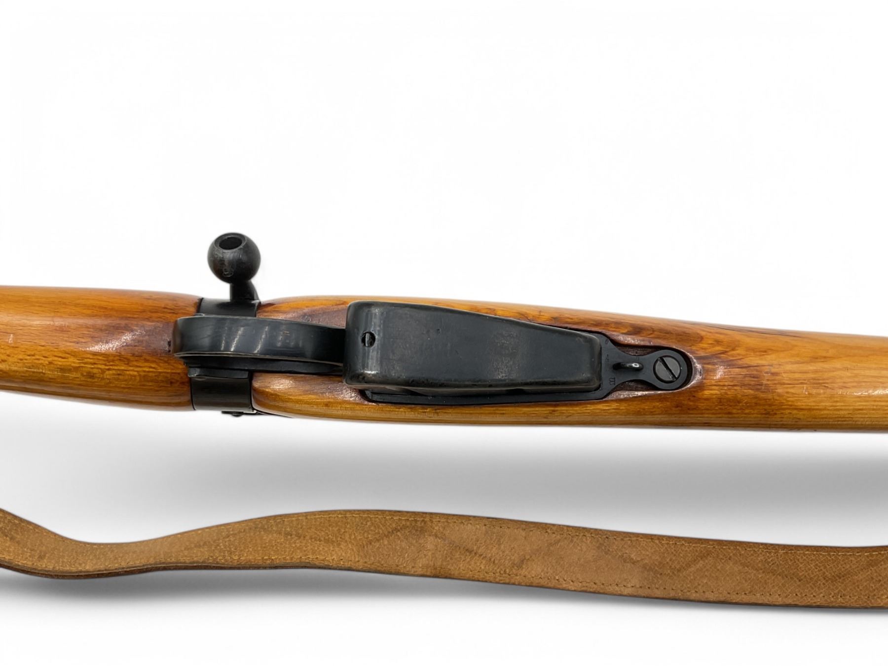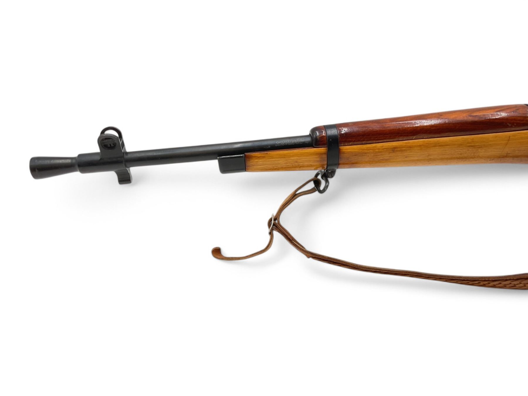 Lee Enfield No5 MkI Jungle Carbine Bolt Action Rifle 303 British 18.75" Barrel Full Wood Stock. Comes with a detachable magazine; also includes leather sling. Fixed front sight, adjustable rear sight. Receiver has been drilled and tapped. This is a non-restricted firearm.