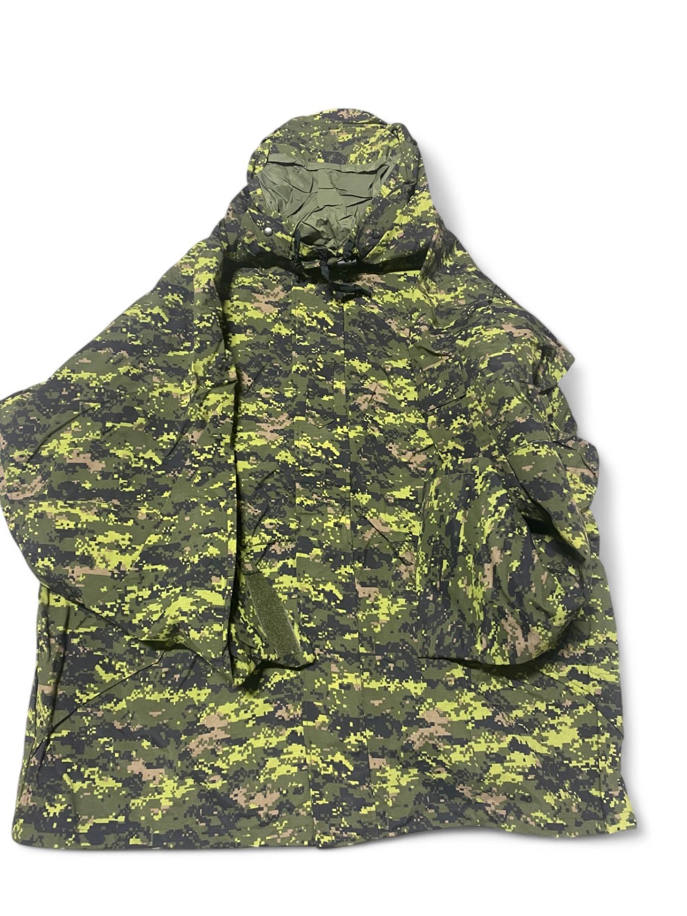 Triple layer laminated outer shell, Drawstring Hem. Taped seams, Cobra hood w/ visor, Storm flap pockets & zipper, Internal Wind Skirt. Ventilated sleeves, Velcro cuffs, Double Pull zipper. 2 Front pockets, arm, & map pockets