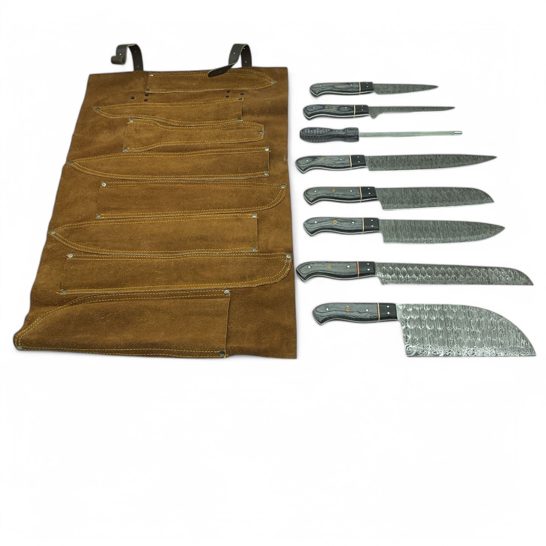 Variety of Hand Forged Damascus Kitchen Knives in Leather Roll, New