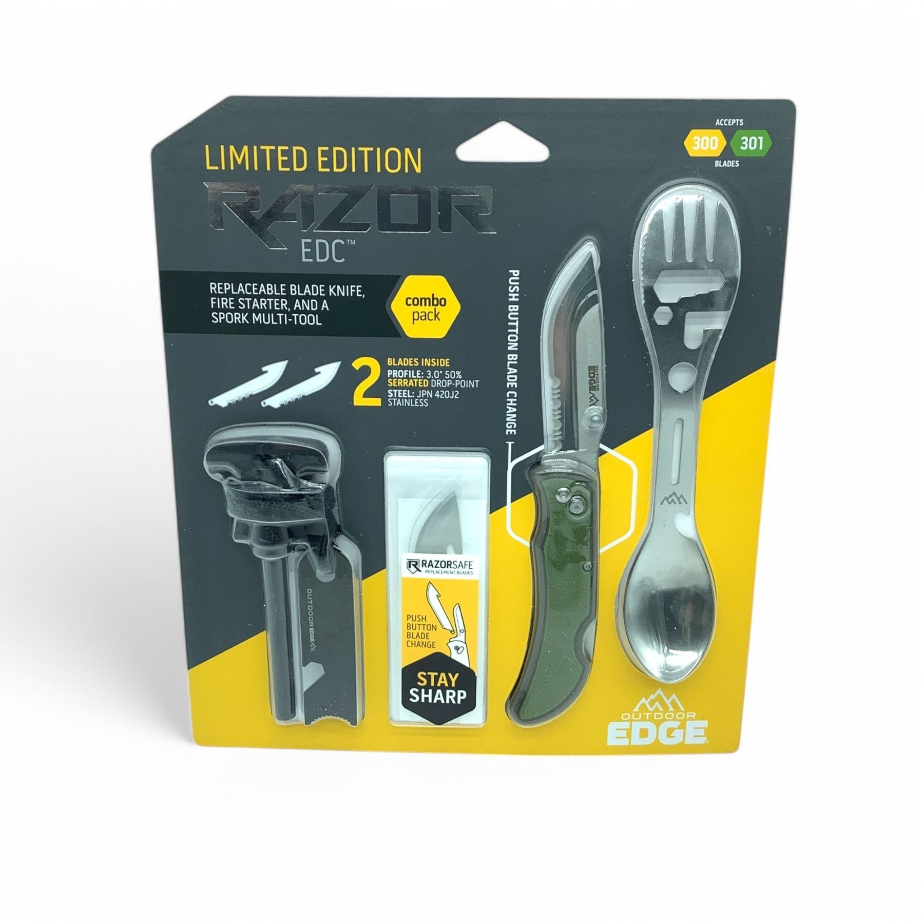 Lot 238 Outdoor Edge Razor EDC Replacement Blade Knife, Firestarter and Spork Multitool Combo Pack, New