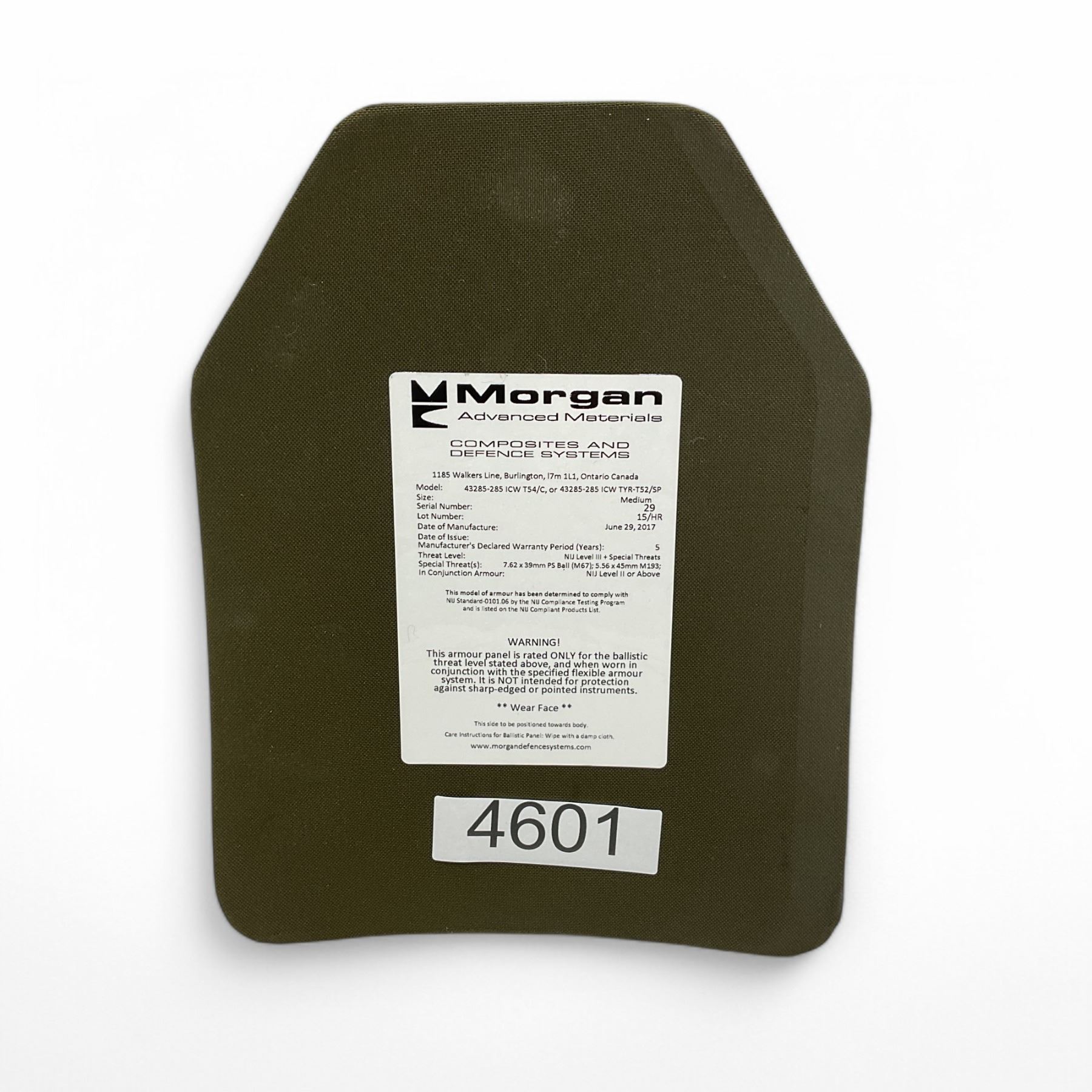 Lot 4601 Morgan Advanced Materials LASA LWBIII+ Ballistic Panel