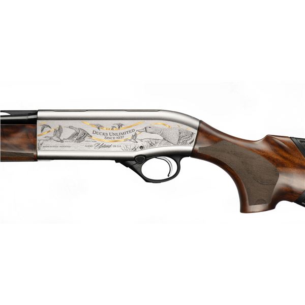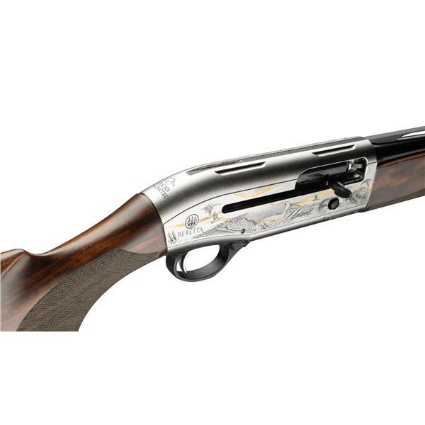 The Beretta A400 Upland is featured as the 2025 Shotgun of the Year. It is a premium 28-gauge shotgun that combines superior performance with exquisite craftsmanship. Its nickel finish receiver adds a touch of elegance, complemented by a Turkish walnut stock with Kick-Off Plus and forend with a glossy finish. This is the first 28 gauge ever to be released by Beretta in the United States with a Kick-Off Plus stock. The shotgun is adorned with DU artwork and gold inlays, along with the DU logo, making it a visually stunning piece. The 28-inch barrel comes with five choke tubes, allowing for versatile shooting options, while the 3-inch chamber ensures it can handle a variety of loads. This exceptional firearm is housed in a durable polymer case featuring the DU logo and includes special DU serial numbers, enhancing its collectible value. For safety, a gun lock is included, ensuring secure storage. The Beretta A400 Upland stands out as a top-tier shotgun, perfect for enthusiasts and collectors alike.