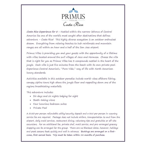 Nestled within the narrow isthmus of Central America lies one of the world’s most sought after destinations that defines adventure – Costa Rica! This highly diverse ecosystem is an outdoor enthusiast dream. Everything from relaxing beaches to lush rainforests and mountain ranges are all within an hour and a half of the San Jose airport. Primus Villas is providing you and your guests with the opportunity of a lifetime with villas located around the surf villages of Jaco and Hermosa. Choose the villa that is right for you as Primus Villas has 2 compounds nestled in the heart of the jungle. Each villa is just five minutes from the beach with its own private pool. Experience Central America’s, “Pura Vida,” way of life with North American luxury standards. Activities available in this outdoor paradise include world–class offshore fishing, canopy zipline tours high above the jungle floor and rappelling down one of the regions breathtaking waterfalls. Includes: Six days and six nights lodging for eight. Breathtaking views, Four luxurious bedroom suites, Private Pool. Not Included: A $150 per person refundable utility/security deposit, $65 per person in-country service fee, Airfare and transportation to and from the airport, Daily maid services, Restaurant dining and beverages, Voluntary tips and gratuities or off-site excursions. For an additional Private chef, maid service, and pre-arranged grocery shopping can be arranged for the group. There are no blackout dates, however, holidays and peak seasons book quickly and well in advance. Bookings are arranged on a first-come, first-served basis. Dates are subject to availability. Trip must be taken within 18 months of purchase.
