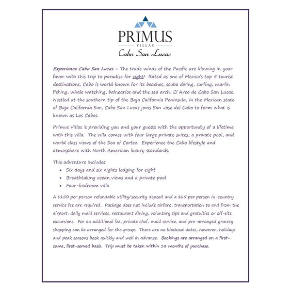 The trade winds of the Pacific are blowing in your favor with this trip to paradise for eight! Rated as one of Mexico’s top 5 tourist destinations, Cabo is world known for its beaches, scuba diving, surfing, marlin fishing, whale watching, balnearios and the sea arch, El Arco de Cabo San Lucas. Nestled at the southern tip of the Baja California Peninsula, in the Mexican state of Baja California Sur, Cabo San Lucas joins San Jose del Cabo to form what is known as Los Cabos. Primus Villas is providing you and your guests with the opportunity of a lifetime with this villa. The villa comes with four large private suites, a private pool, and world class views of the Sea of Cortez. Experience the Cabo lifestyle and atmosphere with North American luxury standards. Includes: Six days and six nights lodging for eight. Breathtaking ocean views and a private pool. Four-bedroom villa. Not Included: $150 per person refundable utility/security deposit. $65 per person in-country service fee are required. Airfare and transportation to and from the airport. Daily maid services, Restaurant dining and beverages, Voluntary tips and gratuities, Off-site excursions. For an additional fee, private chef, maid service, and pre-arranged grocery shopping can be arranged for the group. There are no blackout dates, however, holidays and peak seasons book quickly and well in advance. Bookings are arranged on a first-come, first-served basis. Trip must be taken within 18 months of purchase.