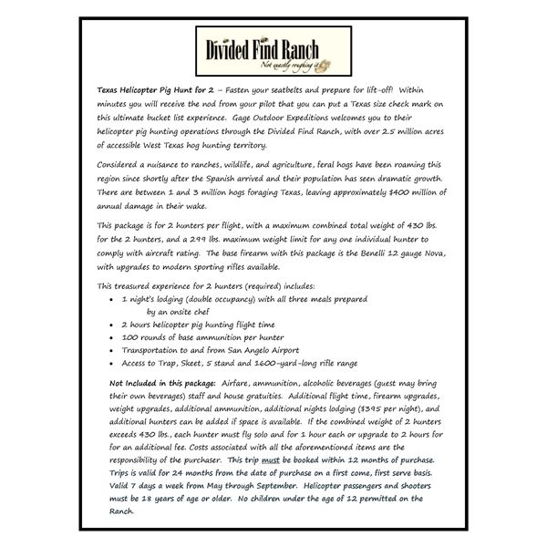 Fasten your seatbelts and prepare for lift-off! Within minutes you will receive the nod from your pilot that you can put a Texas size check mark on this ultimate bucket list experience. Gage Outdoor Expeditions welcomes you to their helicopter pig hunting operations through the Divided Find Ranch, with over 2.5 million acres of accessible West Texas hog hunting territory. Considered a nuisance to ranches, wildlife, and agriculture, feral hogs have been roaming this region since shortly after the Spanish arrived and their population has seen dramatic growth. There are between 1 and 3 million hogs foraging Texas, leaving approximately $400 million of annual damage in their wake. This package is for 2 hunters per flight, with a maximum combined total weight of 430 lbs. for the 2 hunters, and a 299 lbs. maximum weight limit for any one individual hunter to comply with aircraft rating. The base firearm with this package is the Benelli 12 gauge Nova, with upgrades to modern sporting rifles available. This treasured experience for 2 hunters (required) includes: 1 night’s lodging (double occupancy) with all three meals prepared by an onsite chef, 2 hours helicopter pig hunting flight time, 100 rounds of base ammunition per hunter, Transportation to and from San Angelo Airport, Access to Trap, Skeet, 5 stand and 1600-yard-long rifle range. Not Included in this package: Airfare, ammunition, alcoholic beverages (guest may bring their own beverages) staff and house gratuities. Additional flight time, firearm upgrades, weight upgrades, additional ammunition, additional nights lodging ($395 per night), and additional hunters can be added if space is available. If the combined weight of 2 hunters exceeds 430 lbs., each hunter must fly solo and for 1 hour each or upgrade to 2 hours for for an additional fee. Costs associated with all the aforementioned items are the responsibility of the purchaser. This trip must be booked within 12 months of purchase. Trips is valid for 24 months from the date of purchase on a first come, first serve basis. Valid 7 days a week from May through September. Helicopter passengers and shooters must be 18 years of age or older. No children under the age of 12 permitted on the Ranch.