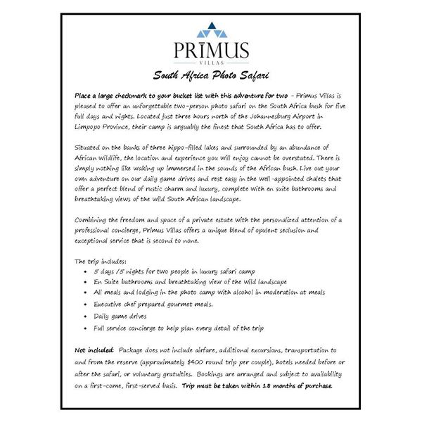 Place a large checkmark to your bucket list with this adventure for two - Primus Villas is pleased to offer an unforgettable two-person photo safari on the South Africa bush for five full days and nights. Located just three hours north of the Johannesburg Airport in Limpopo Province, their camp is arguably the finest that South Africa has to offer. Situated on the banks of three hippo-filled lakes and surrounded by an abundance of African wildlife, the location and experience you will enjoy cannot be overstated. There is simply nothing like waking up immersed in the sounds of the African bush. Live out your own adventure on our daily game drives and rest easy in the well-appointed chalets that offer a perfect blend of rustic charm and luxury, complete with en suite bathrooms and breathtaking views of the wild South African landscape. Combining the freedom and space of a private estate with the personalized attention of a professional concierge, Primus Villas offers a unique blend of opulent seclusion and exceptional service that is second to none. The trip includes: 5 days /5 nights for two people in luxury safari camp, En Suite bathrooms, and breathtaking view of the wild landscape. All meals and lodging in the photo camp with alcohol in moderation at meals. Executive chef prepared gourmet meals. Daily game drives. Full-service concierge to help plan every detail of the trip. Not included: Package does not include airfare, additional excursions, transportation to and from the reserve (approximately $400 round trip per couple), hotels needed before or after the safari, or voluntary gratuities. Bookings are arranged and subject to availability on a first-come, first-served basis. Trip must be taken within 18 months of purchase.