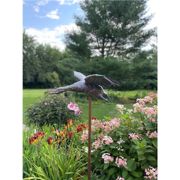 The Flying Mallard is a stunning sculpture crafted from aluminum with a beautiful copper finish and patina,capturing the graceful elegance of a mallard in flight. A duck band on the leg showcases the duckhead logo,Ducks Unlimited, and the establishment year of 1937, adding an authentic touch. This exquisite piece includesan adjustable metal pole with both a ground stake and a stand, making it versatile use for garden or patiobringing a timeless charm and natural beauty to any setting.
