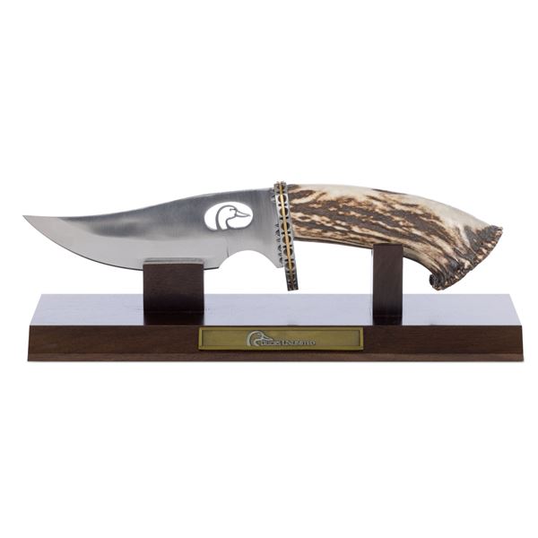 Presenting the distinguished 2024 Knife of the Year, a striking fusion of aesthetics and functionality that seamlessly bridges the worlds of display and field use. This knife exudes elegance with its antler crown handle, while its 420 stainless blade showcases a meticulously crafted cutout of the iconic duck head logo. The finger guard is adorned with intricate file work, adding to its exquisite design. Accompanied by a stand made from premium black walnut, proudly bearing a metal plate embellished with the Ducks Unlimited logo, the presentation becomes a conversation-worthy piece. A leather sheath adds practicality to this artful ensemble. With a length of 12 inches, this knife is not only a work of art but a testament to durability and craftsmanship, perfect for both collectors and outdoor enthusiasts.