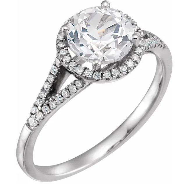 Custom created White Sapphire and Diamond ring: Another wonderful example of jewelry created by Jewel Craft. This custom created White Sapphire and Diamond ring is set in 14 kt white Gold. This wonderful round brilliant cut stone is stunning 1.65 carats in weight. The center stone is also surrounded by stunning bright white diamonds in this modern and sought after Halo design. The diamonds are bright white and .17 ct. They shimmer down each side of the ring. Place your hand up to bid on a perfect piece of hunting insurance which is available in any size.