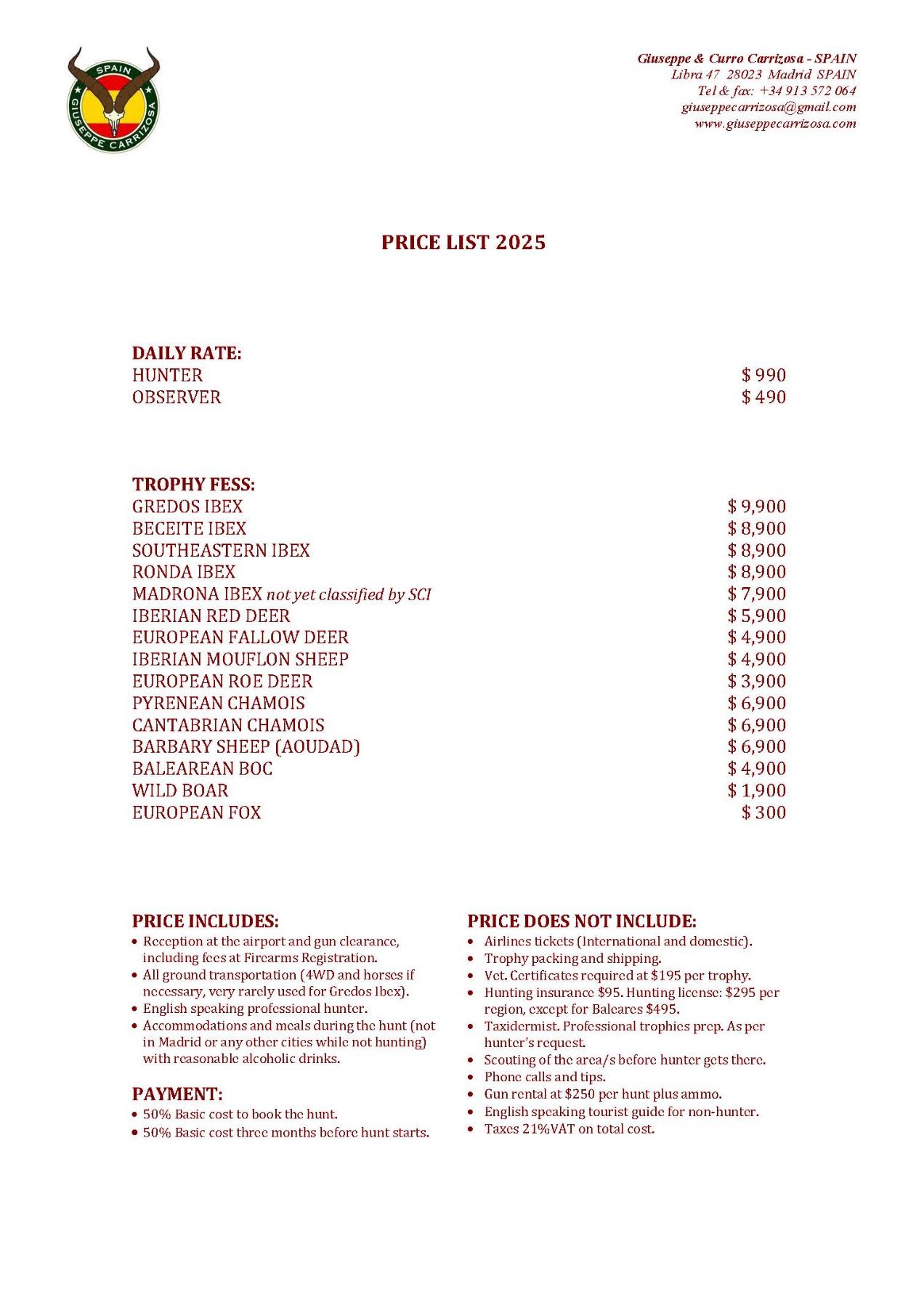 Hunter is responsible for the hunting insurance ($95), hunting license ($295/State), 21% V.A.T. on total value and all travel and lodging before and after hunt.