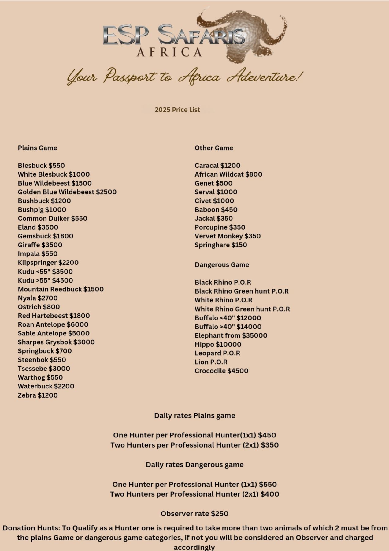 Winning bidder can add Blesbuck, Blue Wildebeest,Bushbuck, Bushpig, Common Duiker, Eland, Gemsbuck, Giraffe, Impala, Klipspringer, Kudu, Mountain Reedbuck, Nyala, Ostrich, Red Hartebeest, Roan Antelope, Sable Antelope, Sharpes Grysbok, Springbuck, Steenbok, Tsessebe, Warthog, Waterbuck, Zebra, Caracal, African Wildcat, Genet, Serval, Civet, Baboon, Jackal, Porcupine, Vervet Monkey, Springhare, Black Rhino P.O.R, Black Rhino Green hunt P.O.R, White Rhino P.O.R, White Rhino Green hunt P.O.R, Buffalo, Elephant, Hippo, Leopard P.O.R, Lion P.O.R.
