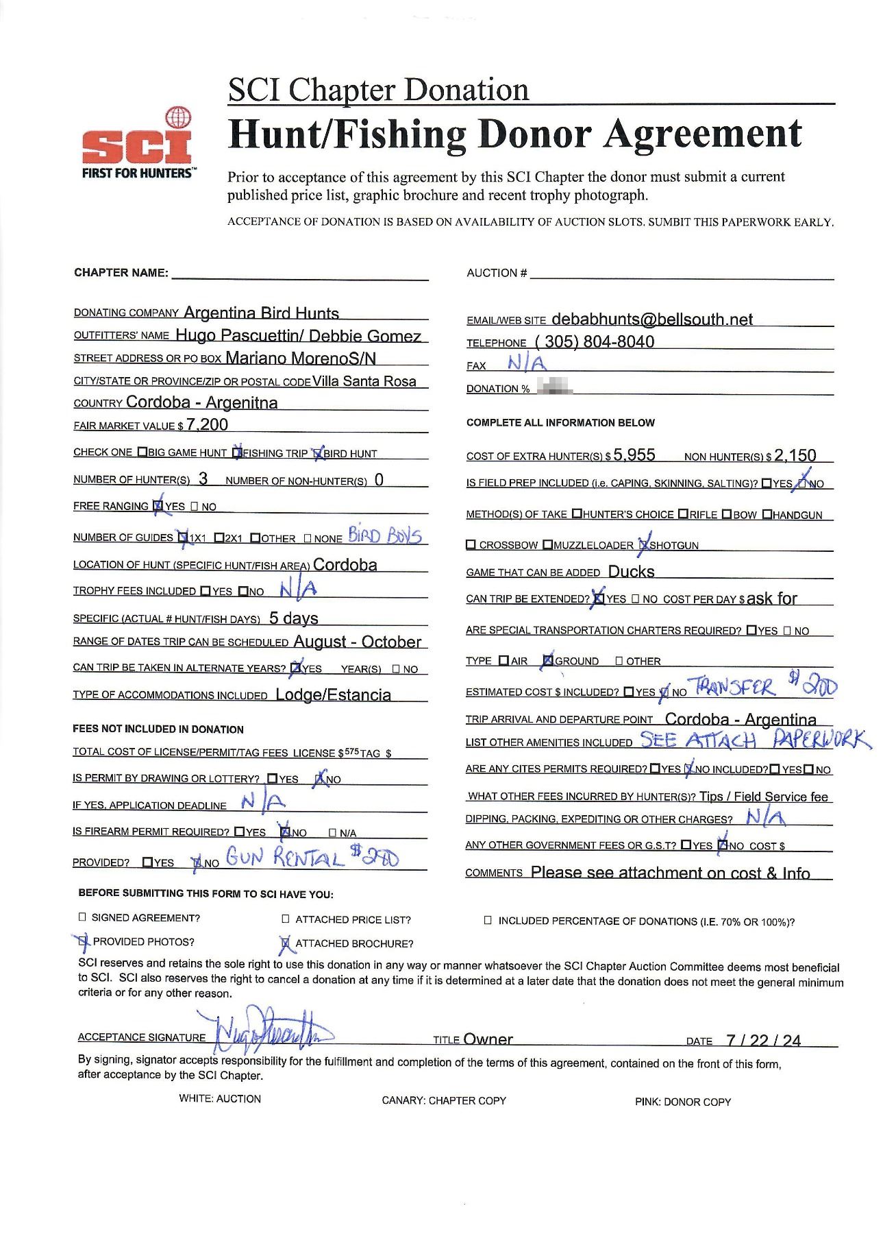 See attachment "FISH -Fishing , Doves & Pigeons Donation 2024.pdf" and "2025 Donor SCI - Dove,Pigeon & Fishing 001.jpg". Donation value: $7,200.