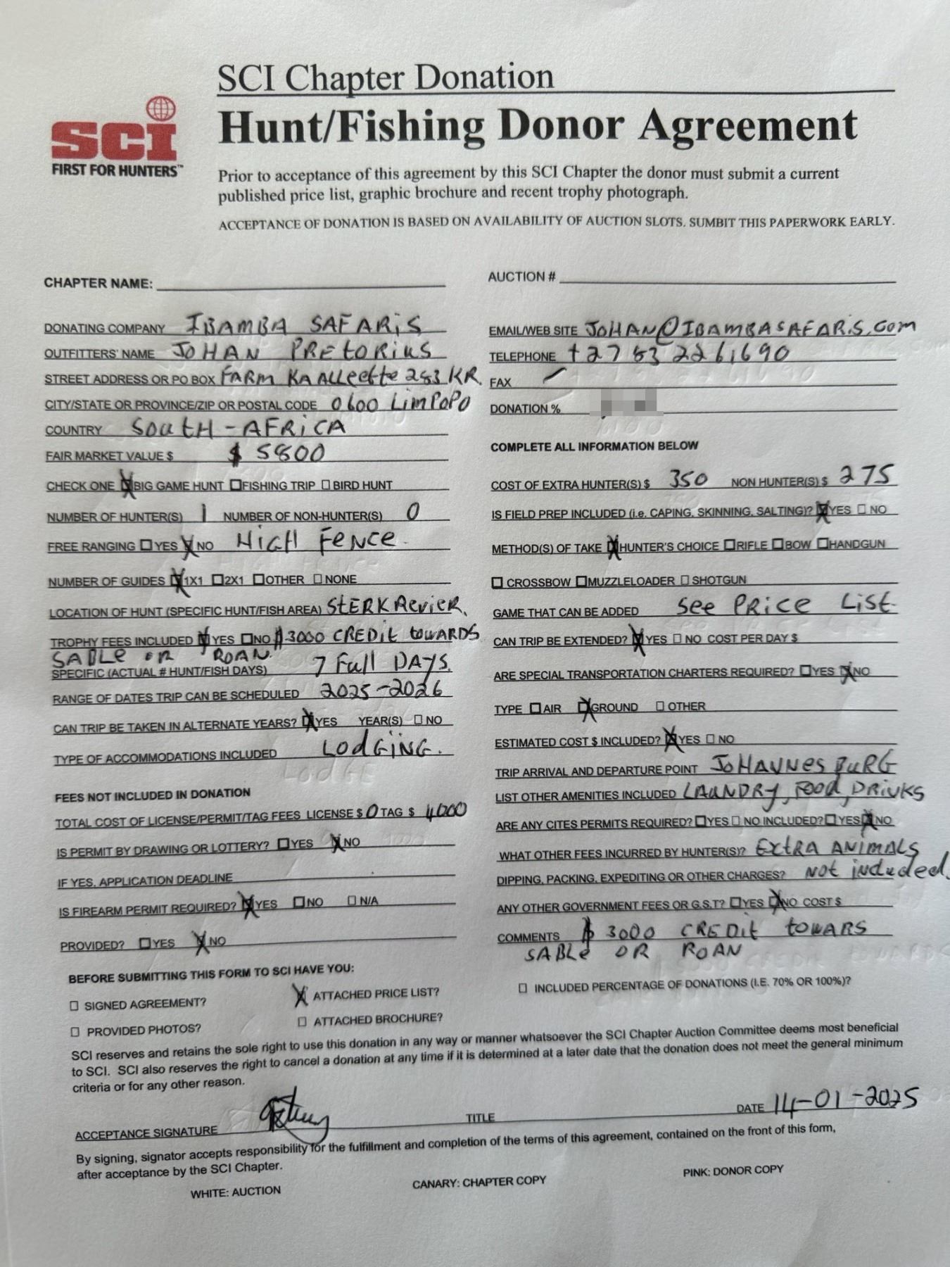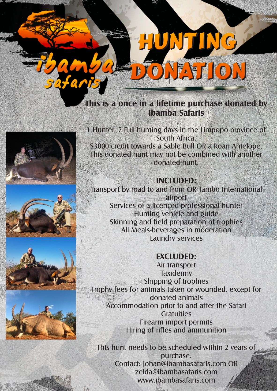 See attachment "SableRoan IMG_0899.jpeg" and "SCI Donor 7D 1Hunter SableRoan IMG_1105.jpeg". See Price List for other animals that can be hunted. Donation value: $5,800.