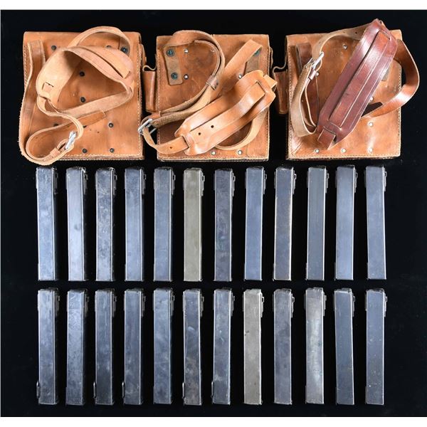 SUBMACHINE GUN MAGAZINES. Lot consists of 24 assorted Swedish, Finnish, and Egyptian, including: 1) 18 assorted Swedish M45/B 36-rd. mags. Mags. exhibit assorted blue and parkerized finishes. 2) 5 Finnish Suomi KP/-31 36-rd. mags. 3) 1 Egyptian Port Said 36-rd. mag. 4) 3 Swedish brown leather 4-cell mag. pouches. CONDITION: good, with mags. exhibiting varying degrees of wear and thinning, as well as some scattered spots of oxidation and light pitting. Pouches remain malleable, exhibiting some wear and age related discoloration. 1 pouch is missing a stud, but is otherwise fine. (02-23746/MLW). $400-700.