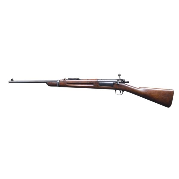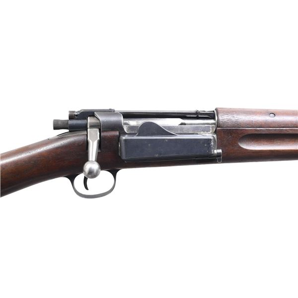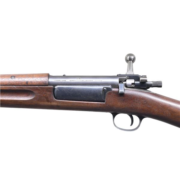 Cal. 30-40. S# 280533. Bbl. 22". Moveable base & ladder have the correct "C" marking on the left side. Blade rear sight. Headless cocking piece. Walnut stock set. Stock has crisp "JSA 1901" acceptance mark on left side & encircled script "P" proof under grip. Correct humped handguard. Smooth trap buttplate. UNATTACHED ACCESSORIES: 3 section cleaning rod in butt. CONDITION: stock set has original finish w/ the crisp markings, however, the buttstock has an extensive crack extending forward from the buttplate approx. 3" on the left side & 2 1/2" on the right side. Handguard has a fine crack extending from the receiver ring 1 1/2" forward & a repaired crack on the right side between the bbl. band & rear sight base. The metal retains 85% of its original blue finish w/ thinning & light wear. Bore has lightly worn lands & a frosted appearance in the grooves. (25-947/RW). CURIO. $1,400-2,000.