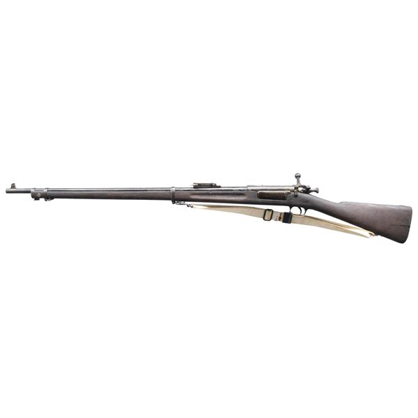 KRAG BOLT-ACTION MILITARY RIFLE. Cal. 30-40 Krag. S# 447361. Bbl. 30". Model 1901 rear sight graduated to 2,000 yards. Slide clamping screw is not present. Blade front sight. Walnut stock. Handguard is not present. Stock is marked only w/ a very faint encircled "P" proof under grip. Smooth trap buttplate. White web post-WWII era parade sling. CONDITION: stock has dark arsenal rework type finish. Extensive crack on both sides of butt, extending approx. 3" forward. Missing chip of wood on right side below receiver bridge. Small cracks at forward end of trigger guard. Stock finish has numerous flecks of white paint. Metal w/ traces of original blue has turned overall gray & patina. Oxidation & fine pitting. Notable area of pitting, over chamber & around feel sight. Brass cartridge body (Broken Shell) has adhered to chamber wall. Bore has dark oxidized appearance w/ light pitting throughout & worn rifling. (24-6923/RW). MODERN. $400-600.