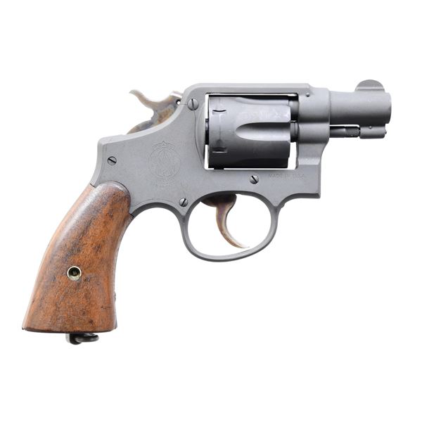 Cal. 38 Spl. S# V668558. Bbl. 2". Round blade front sight. Fixed rear sight. Matching numbers on the frame, bbl., right grip panel, and cyl.; the extractor is mismatched. Revolver appears to be an assembled copy of a 2" Victory Model. Bottom of the grip frame has a flaming bomb marking. No US property or other military markings present. Arsenal rework style, Parkerized finish with case-colored trigger and hammer. Smooth walnut grips. Lanyard ring is present on the bottom of the grip frame. UNATTACHED ACCESSORIES: An aftermarket black hard case with a repro-matching numbered Kraft box. CONDITION: Grips have a restored appearance with a light chip at the bottom front of the right panel and some handling marks. Trigger and hammer retain most of their restored case colors with some light oxidation specks and operational wear. Balance of metal retains 93% of its arsenal rework type, Parkerized finish with scattered silvering spots and edge & operational wear. Action functions properly when hand-cycled. Bright, near-excellent bore. (24-6790/MJC). CURIO. $400-600.