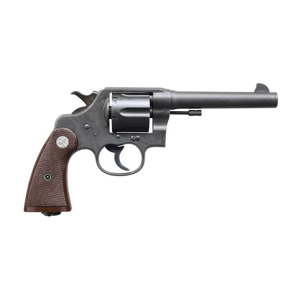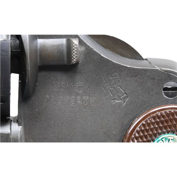 "USMC" MARKING. Cal. 45 ACP. S# 270425 (1920). Left side of frame stamped "USMC / PROPERTY". This pistol appears to have an arsenal style refinish on most parts without any noticeable arsenal stampings; trigger & hammer retain original blue. Barrel 6". 6 Shot fluted cyl. Replacement 2 piece Coltwood grips with Colt medallions. Butt of frame has US Army S# 117978. CONDITION: very good arsenal style refinish showing scattered marks & marks that were refinished overall. Good grips showing wear & verdigris. Shiny bore with strong rifling throughout showing pitting extending from muzzle 1". (24-6789/MD). CURIO. $500-900.